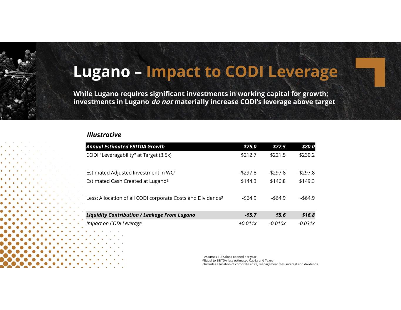 compassdiversified.com Lugano – Impact to CODI Leverage While Lugano requires significant investments in working capital for growth; investments in Lugano do not materially increase CODI’s leverage above target $80.0$77.5$75.0Annual Estimated EBITDA Growth $230.2$221.5$212.7CODI "Leveragability" at Target (3.5x) -$297.8-$297.8-$297.8Estimated Adjusted Investment in WC1 $149.3$146.8$144.3Estimated Cash Created at Lugano2 -$64.9-$64.9-$64.9Less: Allocation of all CODI corporate Costs and Dividends3 $16.8$5.6-$5.7Liquidity Contribution / Leakage From Lugano -0.031x-0.010x+0.011xImpact on CODI Leverage Illustrative 1 Assumes 1-2 salons opened per year 2 Equal to EBITDA less estimated CapEx and Taxes 3 Includes allocation of corporate costs, management fees, interest and dividends