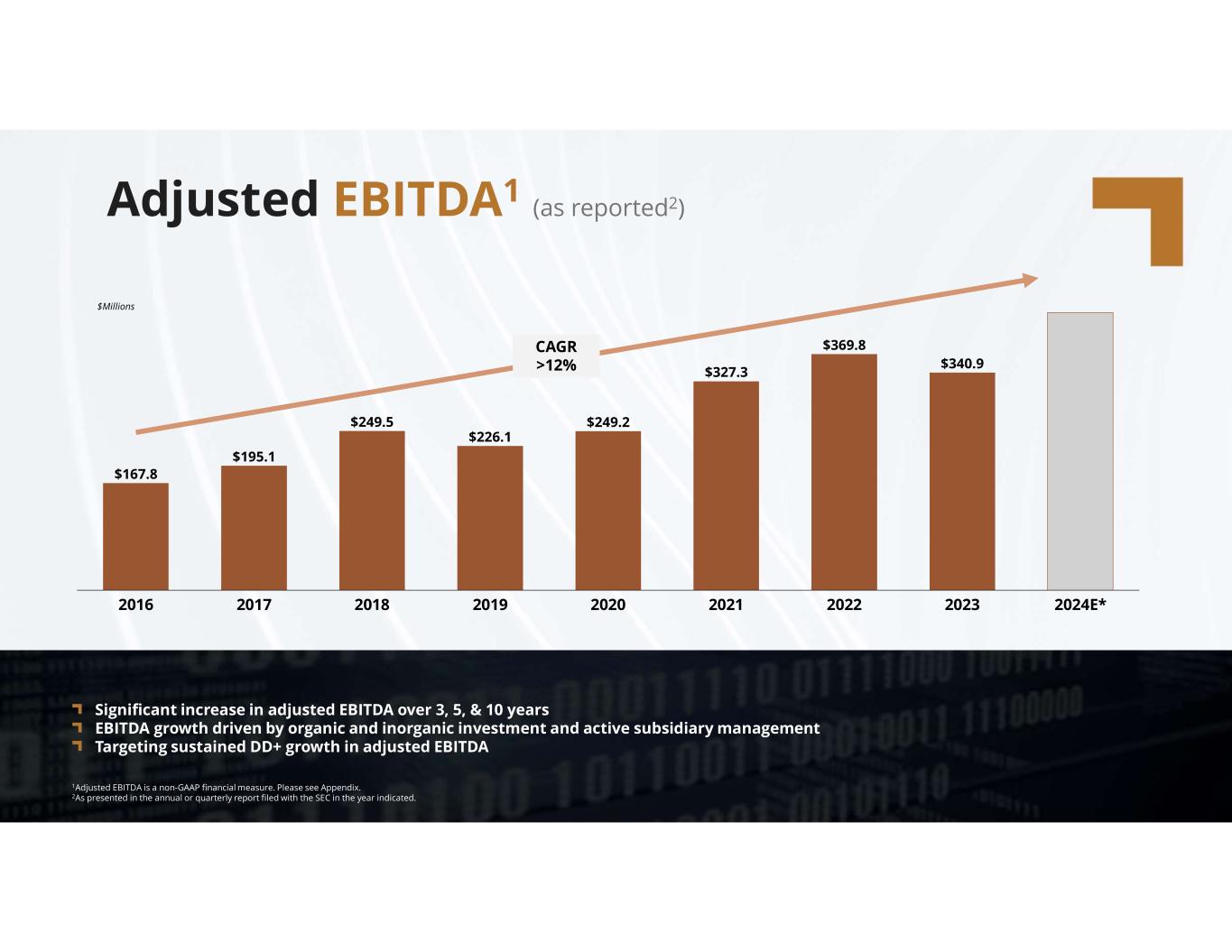 compassdiversified.com Adjusted EBITDA1 (as reported2) Significant increase in adjusted EBITDA over 3, 5, & 10 years EBITDA growth driven by organic and inorganic investment and active subsidiary management Targeting sustained DD+ growth in adjusted EBITDA 1Adjusted EBITDA is a non-GAAP financial measure. Please see Appendix. 2As presented in the annual or quarterly report filed with the SEC in the year indicated. $167.8 $195.1 $249.5 $226.1 $249.2 $327.3 $369.8 $340.9 2016 2017 2018 2019 2020 2021 2022 2023 2024E* $Millions CAGR >12%