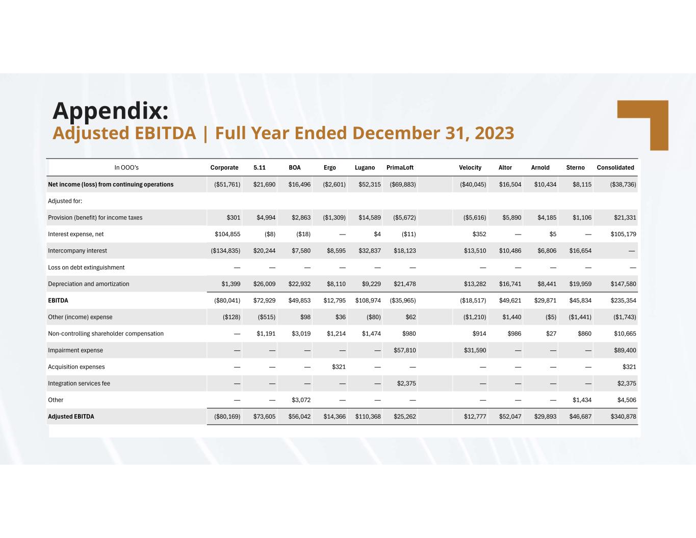 compassdiversified.com Appendix: Adjusted EBITDA (as Reported*) | Full Year 2023 *As reported in the annual (10K) report filed with the SEC in the year indicated. Adjusted EBITDA Year ended December 31, 2023 (in thousands) Corporate 5.11 BOA Ergo Lugano PrimaLoft Velocity Outdoor Altor Solutions Arnold Sterno Consolidated Net income (loss) from continuing operations $ (51,761) $ 21,690 $ 16,496 $ (2,601) $ 52,315 $ (69,883) $ (40,045) $ 16,504 $ 10,434 $ 8,115 $ (38,736) Adjusted for: Provision (benefit) for income taxes 301 4,994 2,863 (1,309) 14,589 (5,672) (5,616) 5,890 4,185 1,106 21,331 Interest expense, net 104,855 (8) (18) — 4 (11) 352 — 5 — 105,179 Intercompany interest (134,835) 20,244 7,580 8,595 32,837 18,123 13,510 10,486 6,806 16,654 — Loss on debt extinguishment — — — — — — — — — — — Depreciation and amortization 1,399 26,009 22,932 8,110 9,229 21,478 13,282 16,741 8,441 19,959 147,580 EBITDA (80,041) 72,929 49,853 12,795 108,974 (35,965) (18,517) 49,621 29,871 45,834 235,354 Other (income) expense (128) (515) 98 36 (80) 62 (1,210) 1,440 (5) (1,441) (1,743) Non-controlling shareholder compensation — 1,191 3,019 1,214 1,474 980 914 986 27 860 10,665 Impairment expense — — — — — 57,810 31,590 — — — 89,400 Acquisition expenses — — — 321 — — — — — — 321 Integration services fee — — — — — 2,375 — — — — 2,375 Other — — 3,072 — — — — — — 1,434 4,506 Adjusted EBITDA $ (80,169) $ 73,605 $ 56,042 $ 14,366 $ 110,368 $ 25,262 $ 12,777 $ 52,047 $ 29,893 $ 46,687 $ 340,878