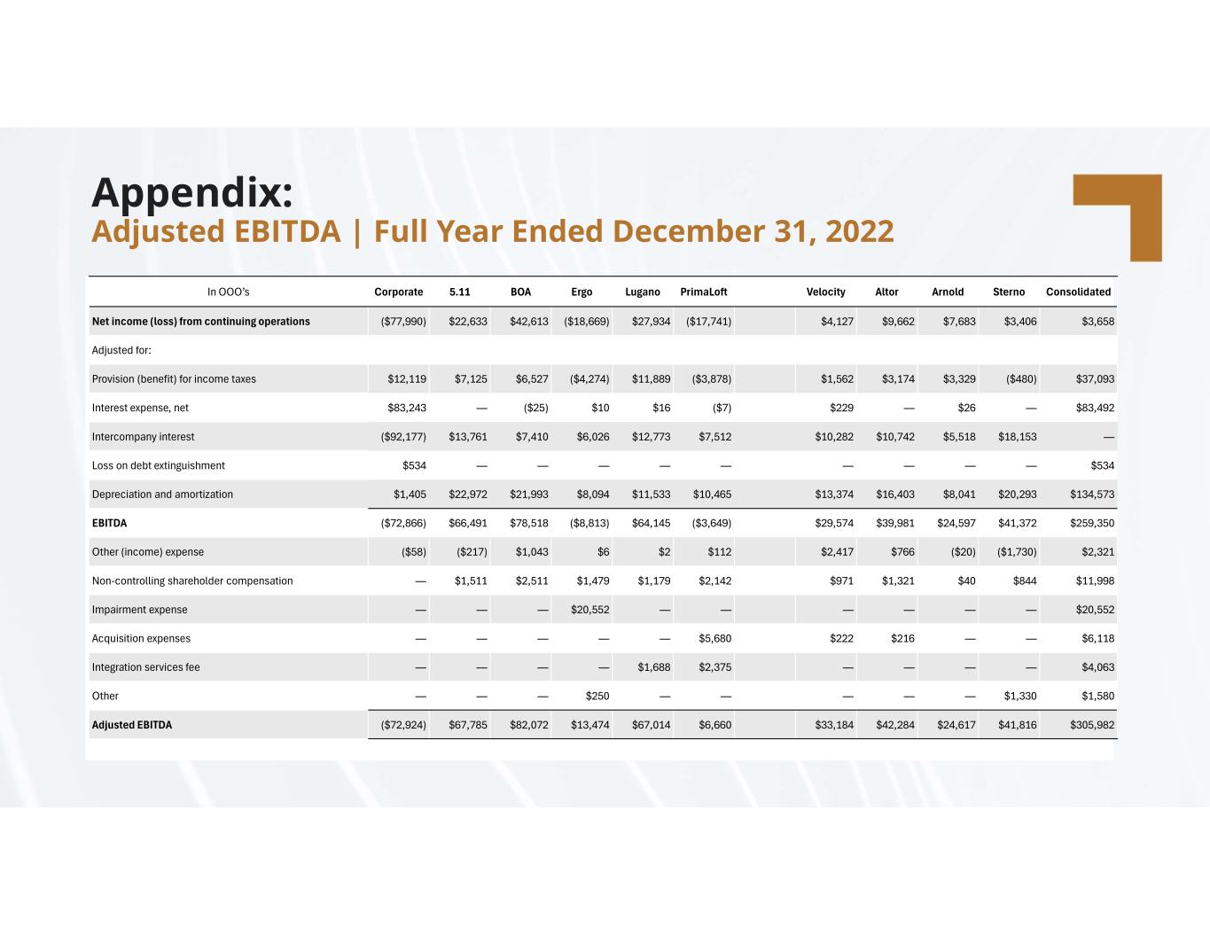compassdiversified.com Appendix: Adjusted EBITDA | Full Year Ended December 31, 2022 ConsolidatedSternoArnoldAltorVelocity PrimaLoftLuganoErgoBOA5.11CorporateIn OOO’s $3,658 $3,406 $7,683 $9,662 $4,127 ($17,741)$27,934 ($18,669)$42,613 $22,633 ($77,990)Net income (loss) from continuing operations Adjusted for: $37,093 ($480)$3,329 $3,174 $1,562 ($3,878)$11,889 ($4,274)$6,527 $7,125 $12,119 Provision (benefit) for income taxes $83,492 —$26 —$229 ($7)$16 $10 ($25)—$83,243 Interest expense, net —$18,153 $5,518 $10,742 $10,282 $7,512 $12,773 $6,026 $7,410 $13,761 ($92,177)Intercompany interest $534 —————————$534 Loss on debt extinguishment $134,573 $20,293 $8,041 $16,403 $13,374 $10,465 $11,533 $8,094 $21,993 $22,972 $1,405 Depreciation and amortization $259,350 $41,372 $24,597 $39,981 $29,574 ($3,649)$64,145 ($8,813)$78,518 $66,491 ($72,866)EBITDA $2,321 ($1,730)($20)$766 $2,417 $112 $2 $6 $1,043 ($217)($58)Other (income) expense $11,998 $844 $40 $1,321 $971 $2,142 $1,179 $1,479 $2,511 $1,511 —Non-controlling shareholder compensation $20,552 ——————$20,552 ———Impairment expense $6,118 ——$216 $222 $5,680 —————Acquisition expenses $4,063 ————$2,375 $1,688 ————Integration services fee $1,580 $1,330 —————$250 ———Other $305,982 $41,816 $24,617 $42,284 $33,184 $6,660 $67,014 $13,474 $82,072 $67,785 ($72,924)Adjusted EBITDA