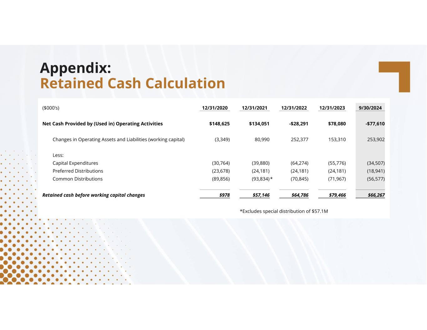 compassdiversified.com 9/30/202412/31/202312/31/202212/31/202112/31/2020($000's) -$77,610$78,080-$28,291$134,051$148,625Net Cash Provided by (Used in) Operating Activities 253,902 153,310 252,377 80,990 (3,349)Changes in Operating Assets and Liabilities (working capital) Less: (34,507)(55,776)(64,274)(39,880)(30,764)Capital Expenditures (18,941)(24,181)(24,181)(24,181)(23,678)Preferred Distributions (56,577)(71,967)(70,845)*(93,834)(89,856)Common Distributions $66,267$79,466$64,786$57,146$978Retained cash before working capital changes *Excludes special distribution of $57.1M Appendix: Retained Cash Calculation
