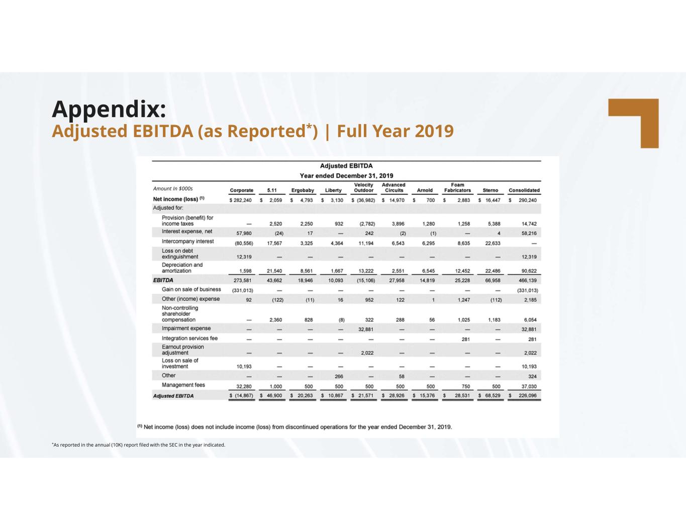 compassdiversified.com Appendix: Adjusted EBITDA (as Reported*) | Full Year 2019 *As reported in the annual (10K) report filed with the SEC in the year indicated. Amount In $000s