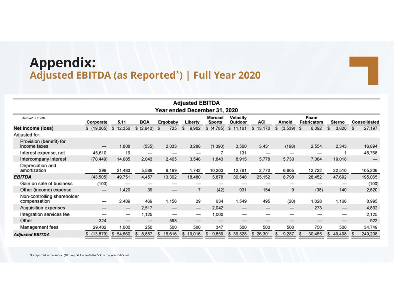 compassdiversified.com Appendix: Adjusted EBITDA (as Reported*) | Full Year 2020 *As reported in the annual (10K) report filed with the SEC in the year indicated. Amount In $000s