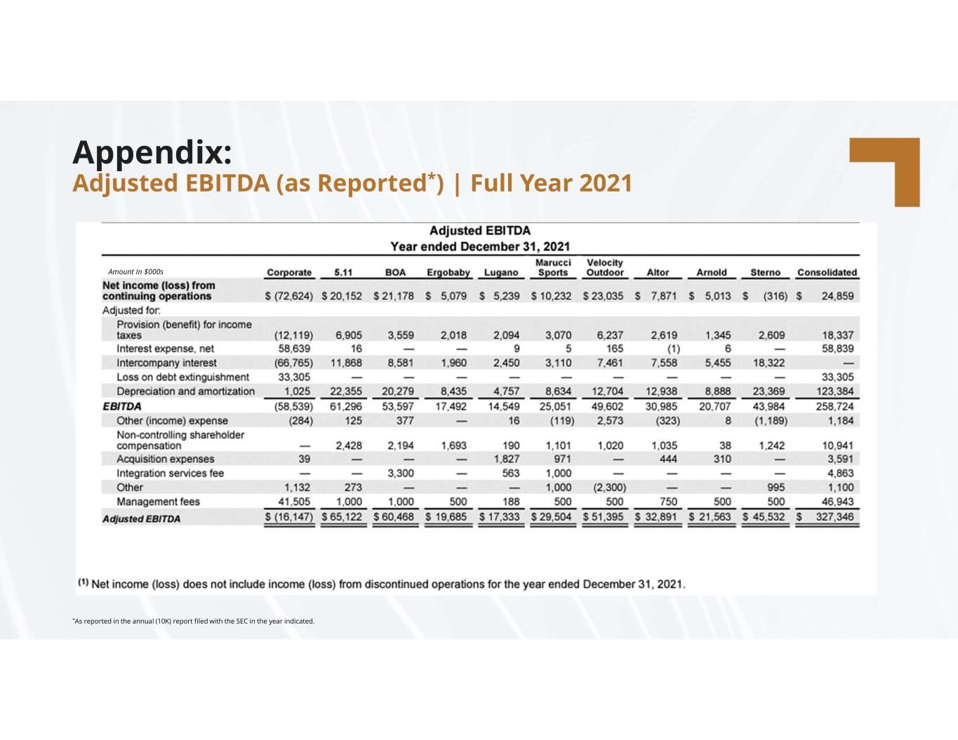 compassdiversified.com Appendix: Adjusted EBITDA (as Reported*) | Full Year 2021 *As reported in the annual (10K) report filed with the SEC in the year indicated. Amount In $000s