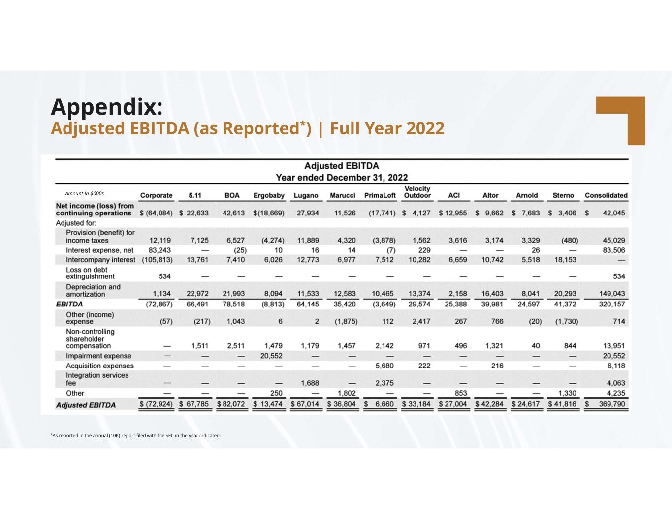 compassdiversified.com Appendix: Adjusted EBITDA (as Reported*) | Full Year 2022 *As reported in the annual (10K) report filed with the SEC in the year indicated. Amount In $000s