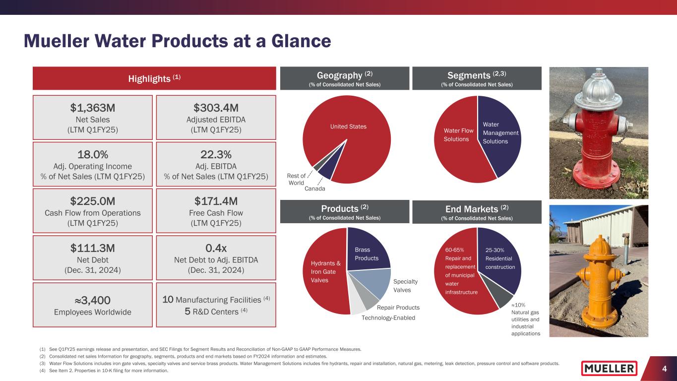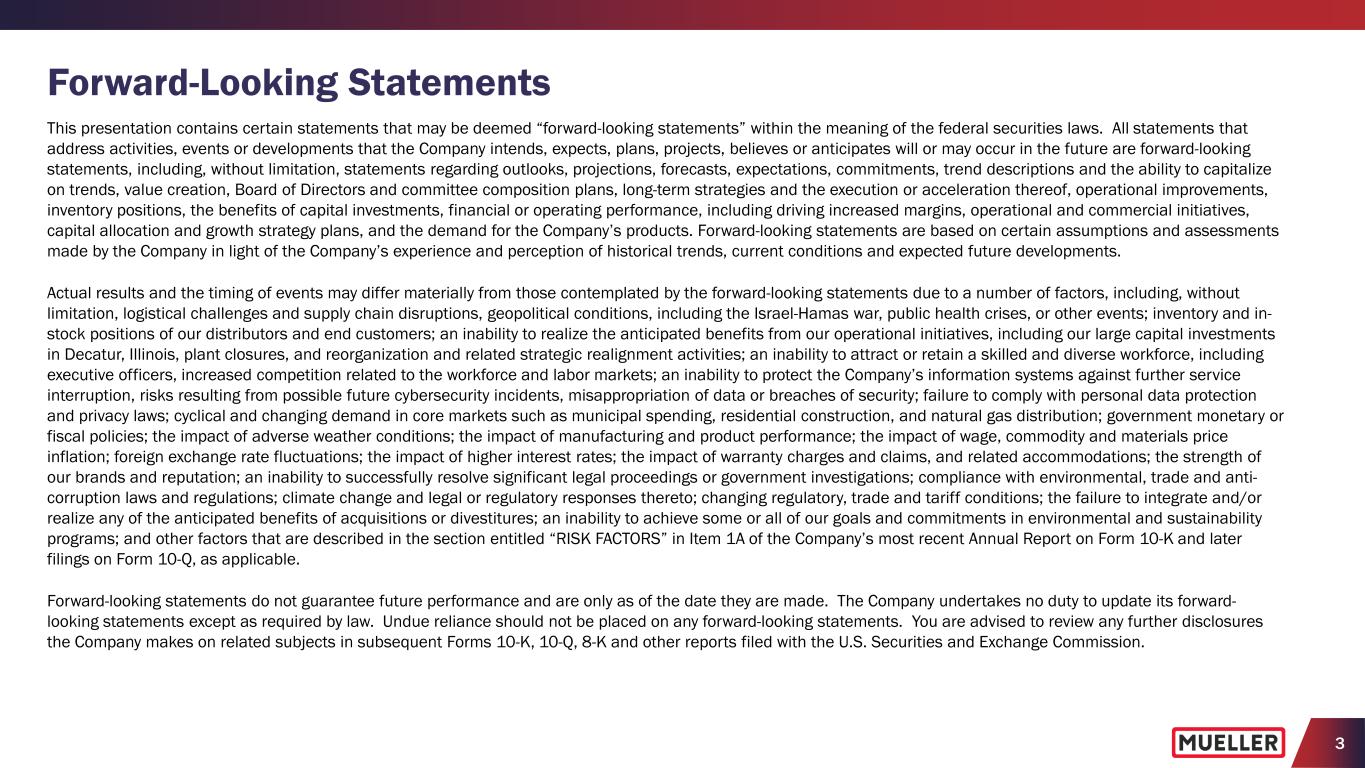 2 Non-GAAP Measures In an effort to provide investors with additional information regarding the Company’s results as determined by accounting principles generally accepted in the United States (“GAAP”), the Company also provides non-GAAP information that management believes is useful to investors. These non-GAAP measures have limitations as analytical tools, and securities analysts, investors and other interested parties should not consider any of these non-GAAP measures in isolation or as a substitute for analysis of the Company’s results as reported under GAAP. These non-GAAP measures may not be comparable to similarly titled measures used by other companies. Adjusted net income, adjusted net income per diluted share, adjusted operating income, adjusted operating margin, adjusted EBITDA and adjusted EBITDA margin are non-GAAP measures that the Company presents as performance measures because management uses these measures to evaluate the Company’s underlying performance on a consistent basis across periods and to make decisions about operational strategies. Management also believes these measures are frequently used by securities analysts, investors and other interested parties in the evaluation of the Company’s recurring performance. Net debt and net debt leverage are non-GAAP measures that the Company presents as liquidity measures because management uses them to evaluate its capital management and financial position, and the investment community commonly uses them as measures of indebtedness. Free cash flow is a non-GAAP liquidity measure used to assist management and investors in analyzing the Company’s ability to generate liquidity from its operating activities. The calculations of these non-GAAP measures and reconciliations to GAAP results are included as an attachment to this presentation, which has been posted online at www.muellerwaterproducts.com. The Company does not reconcile forward-looking non-GAAP measures to the comparable GAAP measures, as permitted by Regulation S-K, as certain items, e.g., expenses related to corporate development activities, transactions, pension expenses/(benefits), corporate restructuring and non-cash asset impairment, may have not yet occurred, are out of the Company’s control or cannot be reasonably predicted without unreasonable efforts. Additionally, such reconciliation would imply a degree of precision and certainty regarding relevant items that may be confusing to investors. Such items could have a substantial impact on GAAP measures of the Company's financial performance.