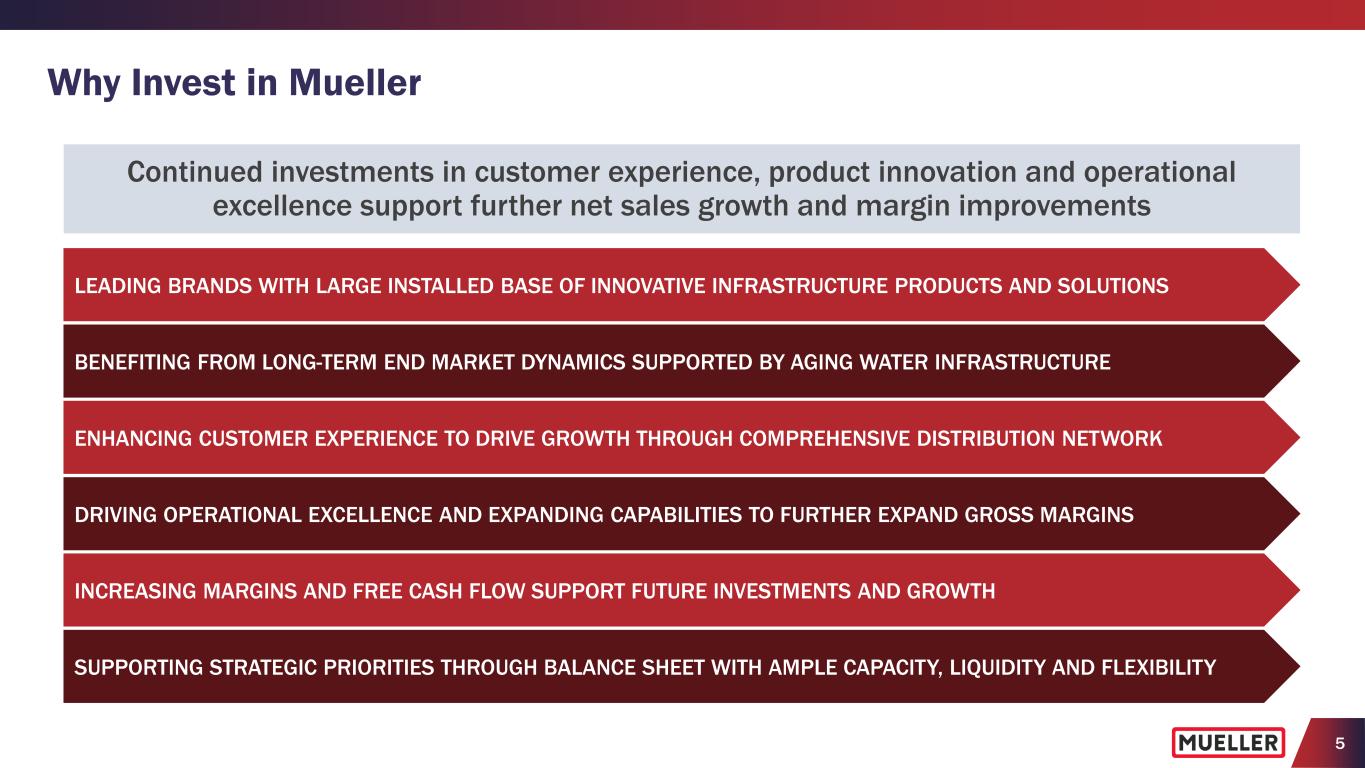 4 (1) See Q1FY25 earnings release and presentation, and SEC Filings for Segment Results and Reconciliation of Non-GAAP to GAAP Performance Measures. (2) Consolidated net sales Information for geography, segments, products and end markets based on FY2024 information and estimates. (3) Water Flow Solutions includes iron gate valves, specialty valves and service brass products. Water Management Solutions includes fire hydrants, repair and installation, natural gas, metering, leak detection, pressure control and software products. (4) See Item 2. Properties in 10-K filing for more information. Water Flow Solutions Water Management Solutions United States Rest of World Geography (2) (% of Consolidated Net Sales) Segments (2,3) (% of Consolidated Net Sales) ≈10% Natural gas utilities and industrial applications 60-65% Repair and replacement of municipal water infrastructure 25-30% Residential construction Brass Products Hydrants & Iron Gate Valves Specialty Valves Technology-Enabled Products (2) (% of Consolidated Net Sales) End Markets (2) (% of Consolidated Net Sales) Canada Highlights (1) $1,363M Net Sales (LTM Q1FY25) $303.4M Adjusted EBITDA (LTM Q1FY25) 18.0% Adj. Operating Income % of Net Sales (LTM Q1FY25) 22.3% Adj. EBITDA % of Net Sales (LTM Q1FY25) $225.0M Cash Flow from Operations (LTM Q1FY25) $171.4M Free Cash Flow (LTM Q1FY25) $111.3M Net Debt (Dec. 31, 2024) 0.4x Net Debt to Adj. EBITDA (Dec. 31, 2024) ≈3,400 Employees Worldwide 10 Manufacturing Facilities (4) 5 R&D Centers (4) Mueller Water Products at a Glance Repair Products