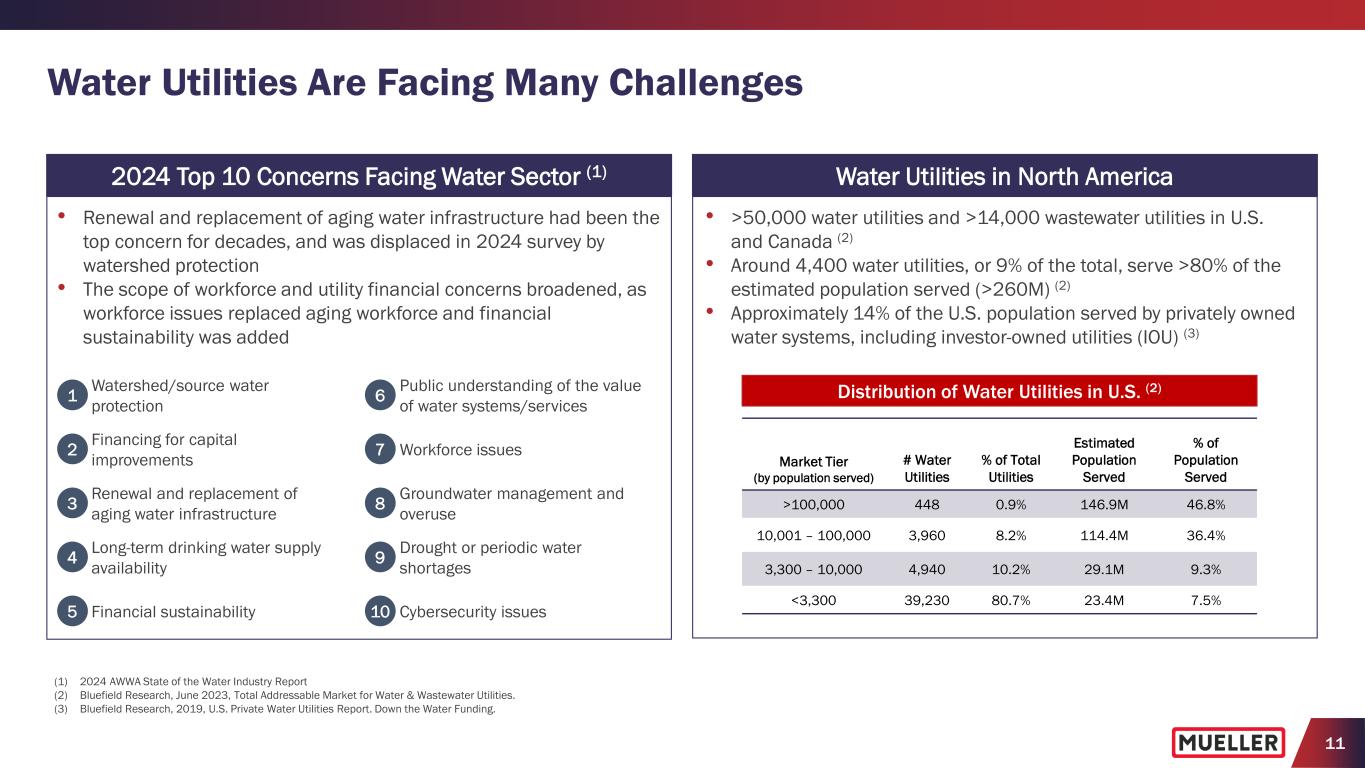10 Leading Product Positions in Key Product Categories (1) (1) Company estimates based on internal analysis and information from trade associations and distributor networks, where available. (2) Consolidated net sales Information for geography, segments, products and end markets based on FY2024 information and estimates. Fire Hydrants Iron Gate Valves Butterfly Valves Brass Products #1 Product Position A.Y. McDonald ACIPCO DeZURIK Ford Meter Box McWane #1 Product Position #1 Product Position #2 Product Position Broad Portfolio of Products and Solutions With Leading Positions in Key Categories (1) Uniquely Positioned to Address Opportunities with Utilities with Leading Infrastructure Products and Solutions and Large Installed Base Products (2) (% of Consolidated Net Sales) End Markets (2) (% of Consolidated Net Sales) • Water-focused compa y with more than 90% of consolidated net sales associated with water • Leading brands and municipal market specifications • Large installed base of products used by customers for new construction and repair and replacement • Approximately two-thirds of net sales related to repair and replacement activities of utilities • Comprehensive distribution network and strong end-user relationships with end-markets served by limited number of suppliers • Focused on driving best in class customer service supported by in-person and virtual training for end customers and channel partners ≈10% Natural gas utilities and industrial applications 60-65% Repair and replacement of municipal water infrastructure 25-30% Residential construction Brass ProductsHydrants & Iron Gate Valves Specialty Valves Technology-Enabled Repair Products www.youtube.com/@Mueller-Water-Products www.muellerwaterproducts.comLearn more about Mueller Water Products