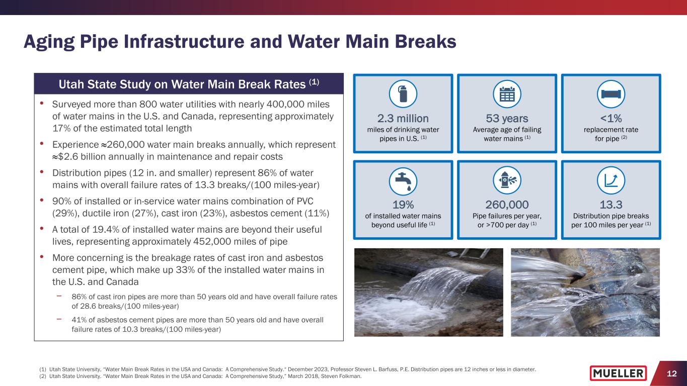 12 Aging Pipe Infrastructure and Water Main Breaks Utah State Study on Water Main Break Rates (1) • Surveyed more than 800 water utilities with nearly 400,000 miles of water mains in the U.S. and Canada, representing approximately 17% of the estimated total length • Experience ≈260,000 water main breaks annually, which represent ≈$2.6 billion annually in maintenance and repair costs • Distribution pipes (12 in. and smaller) represent 86% of water mains with overall failure rates of 13.3 breaks/(100 miles-year) • 90% of installed or in-service water mains combination of PVC (29%), ductile iron (27%), cast iron (23%), asbestos cement (11%) • A total of 19.4% of installed water mains are beyond their useful lives, representing approximately 452,000 miles of pipe • More concerning is the breakage rates of cast iron and asbestos cement pipe, which make up 33% of the installed water mains in the U.S. and Canada − 86% of cast iron pipes are more than 50 years old and have overall failure rates of 28.6 breaks/(100 miles-year) − 41% of asbestos cement pipes are more than 50 years old and have overall failure rates of 10.3 breaks/(100 miles-year) (1) Utah State University, “Water Main Break Rates in the USA and Canada: A Comprehensive Study.“ December 2023, Professor Steven L. Barfuss, P.E. Distribution pipes are 12 inches or less in diameter. (2) Utah State University. “Water Main Break Rates in the USA and Canada: A Comprehensive Study,” March 2018, Steven Folkman. 13.3 Distribution pipe breaks per 100 miles per year (1) <1% replacement rate for pipe (2) 2.3 million miles of drinking water pipes in U.S. (1) 19% of installed water mains beyond useful life (1) 53 years Average age of failing water mains (1) 260,000 Pipe failures per year, or >700 per day (1)