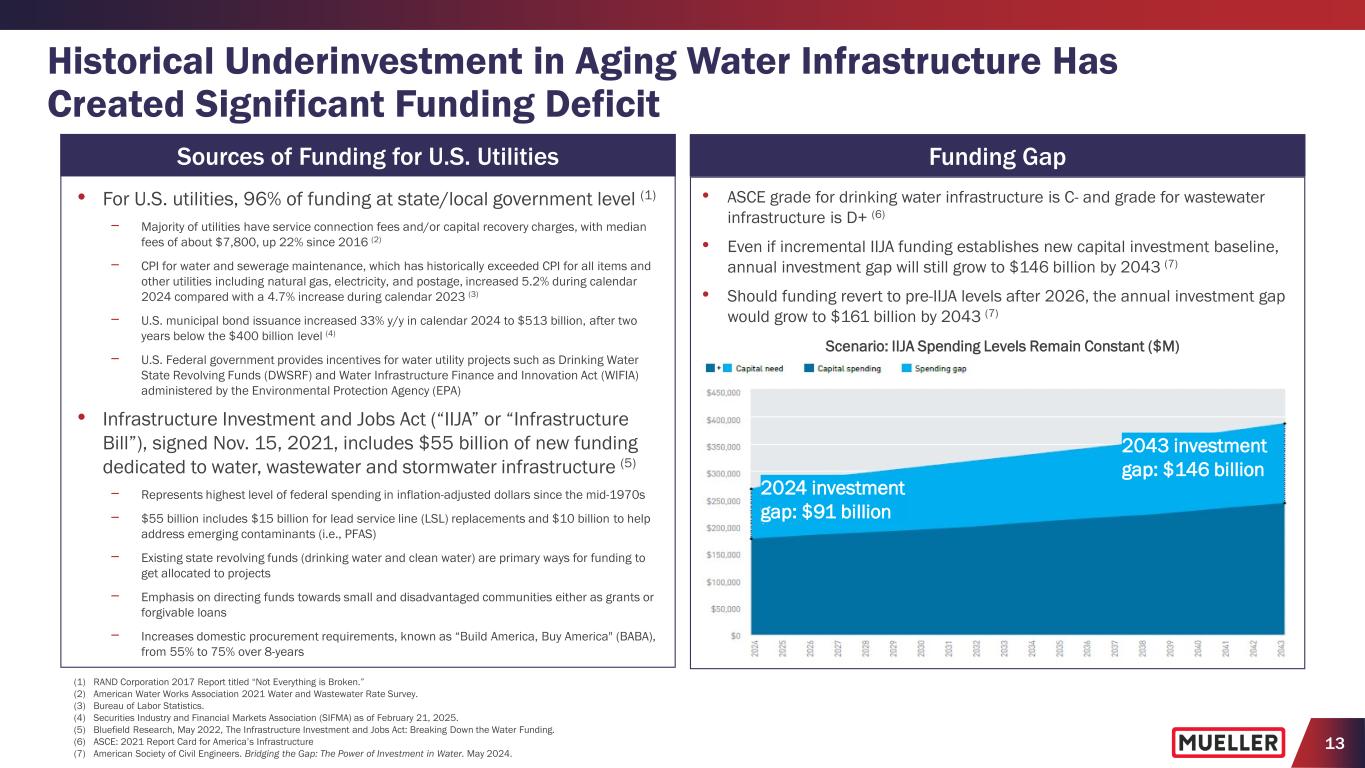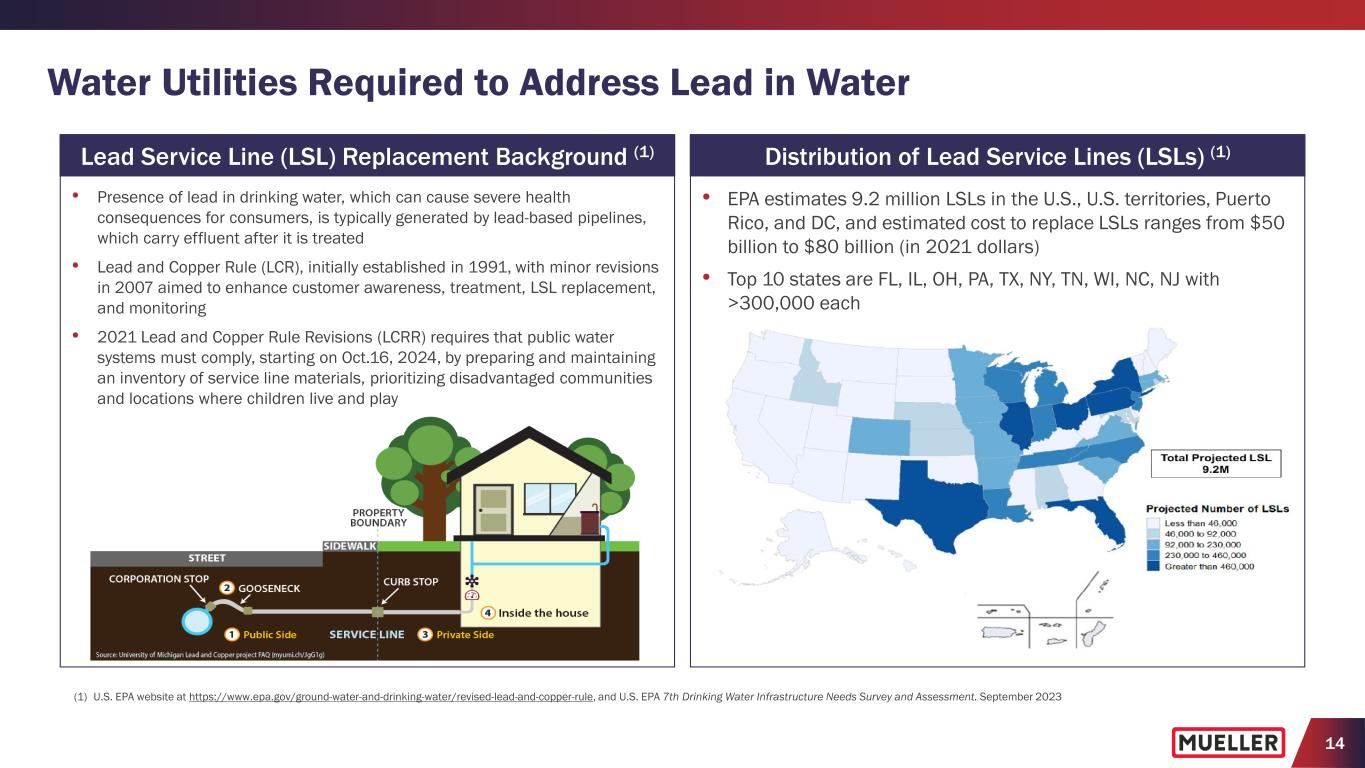 13 Historical Underinvestment in Aging Water Infrastructure Has Created Significant Funding Deficit (1) RAND Corporation 2017 Report titled “Not Everything is Broken.” (2) American Water Works Association 2021 Water and Wastewater Rate Survey. (3) Bureau of Labor Statistics. (4) Securities Industry and Financial Markets Association (SIFMA) as of February 21, 2025. (5) Bluefield Research, May 2022, The Infrastructure Investment and Jobs Act: Breaking Down the Water Funding. (6) ASCE: 2021 Report Card for America’s Infrastructure (7) American Society of Civil Engineers. Bridging the Gap: The Power of Investment in Water. May 2024. Sources of Funding for U.S. Utilities • For U.S. utilities, 96% of funding at state/local government level (1) − Majority of utilities have service connection fees and/or capital recovery charges, with median fees of about $7,800, up 22% since 2016 (2) − CPI for water and sewerage maintenance, which has historically exceeded CPI for all items and other utilities including natural gas, electricity, and postage, increased 5.2% during calendar 2024 compared with a 4.7% increase during calendar 2023 (3) − U.S. municipal bond issuance increased 33% y/y in calendar 2024 to $513 billion, after two years below the $400 billion level (4) − U.S. Federal government provides incentives for water utility projects such as Drinking Water State Revolving Funds (DWSRF) and Water Infrastructure Finance and Innovation Act (WIFIA) administered by the Environmental Protection Agency (EPA) • Infrastructure Investment and Jobs Act (“IIJA” or “Infrastructure Bill”), signed Nov. 15, 2021, includes $55 billion of new funding dedicated to water, wastewater and stormwater infrastructure (5) − Represents highest level of federal spending in inflation-adjusted dollars since the mid-1970s − $55 billion includes $15 billion for lead service line (LSL) replacements and $10 billion to help address emerging contaminants (i.e., PFAS) − Existing state revolving funds (drinking water and clean water) are primary ways for funding to get allocated to projects − Emphasis on directing funds towards small and disadvantaged communities either as grants or forgivable loans − Increases domestic procurement requirements, known as “Build America, Buy America" (BABA), from 55% to 75% over 8-years • ASCE grade for drinking water infrastructure is C- and grade for wastewater infrastructure is D+ (6) • Even if incremental IIJA funding establishes new capital investment baseline, annual investment gap will still grow to $146 billion by 2043 (7) • Should funding revert to pre-IIJA levels after 2026, the annual investment gap would grow to $161 billion by 2043 (7) Funding Gap Scenario: IIJA Spending Levels Remain Constant ($M) 2024 investment gap: $91 billion 2043 investment gap: $146 billion