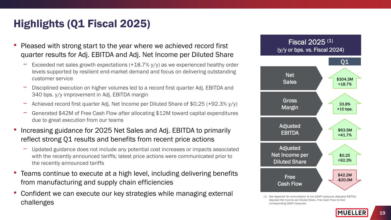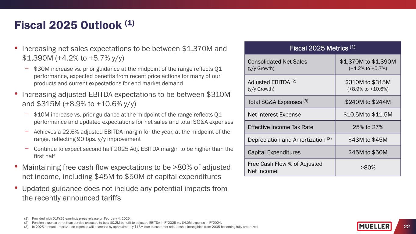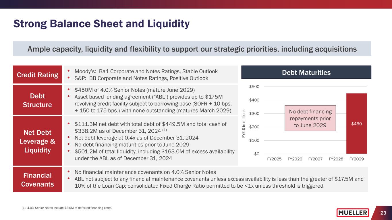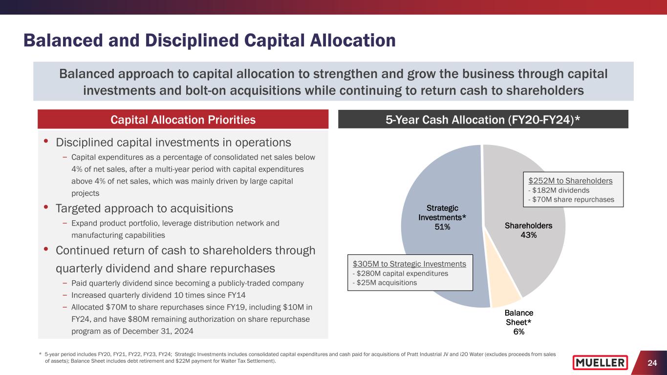 24 Balanced and Disciplined Capital Allocation • Disciplined capital investments in operations – Capital expenditures as a percentage of consolidated net sales below 4% of net sales, after a multi-year period with capital expenditures above 4% of net sales, which was mainly driven by large capital projects • Targeted approach to acquisitions – Expand product portfolio, leverage distribution network and manufacturing capabilities • Continued return of cash to shareholders through quarterly dividend and share repurchases – Paid quarterly dividend since becoming a publicly-traded company – Increased quarterly dividend 10 times since FY14 – Allocated $70M to share repurchases since FY19, including $10M in FY24, and have $80M remaining authorization on share repurchase program as of December 31, 2024 Shareholders 43% Balance Sheet* 6% Strategic Investments* 51% $252M to Shareholders - $182M dividends - $70M share repurchases 5-Year Cash Allocation (FY20-FY24)* $305M to Strategic Investments - $280M capital expenditures - $25M acquisitions * 5-year period includes FY20, FY21, FY22, FY23, FY24; Strategic Investments includes consolidated capital expenditures and cash paid for acquisitions of Pratt Industrial JV and i2O Water (excludes proceeds from sales of assets); Balance Sheet includes debt retirement and $22M payment for Walter Tax Settlement). Capital Allocation Priorities Balanced approach to capital allocation to strengthen and grow the business through capital investments and bolt-on acquisitions while continuing to return cash to shareholders