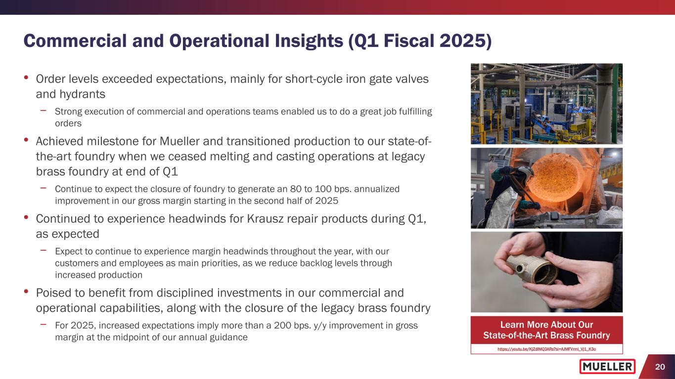 20 Commercial and Operational Insights (Q1 Fiscal 2025) • Order levels exceeded expectations, mainly for short-cycle iron gate valves and hydrants − Strong execution of commercial and operations teams enabled us to do a great job fulfilling orders • Achieved milestone for Mueller and transitioned production to our state-of- the-art foundry when we ceased melting and casting operations at legacy brass foundry at end of Q1 − Continue to expect the closure of foundry to generate an 80 to 100 bps. annualized improvement in our gross margin starting in the second half of 2025 • Continued to experience headwinds for Krausz repair products during Q1, as expected − Expect to continue to experience margin headwinds throughout the year, with our customers and employees as main priorities, as we reduce backlog levels through increased production • Poised to benefit from disciplined investments in our commercial and operational capabilities, along with the closure of the legacy brass foundry − For 2025, increased expectations imply more than a 200 bps. y/y improvement in gross margin at the midpoint of our annual guidance Learn More About Our State-of-the-Art Brass Foundry https://youtu.be/KjZdIMQ3ARs?si=AJMFVrmi_Vj1_K3o