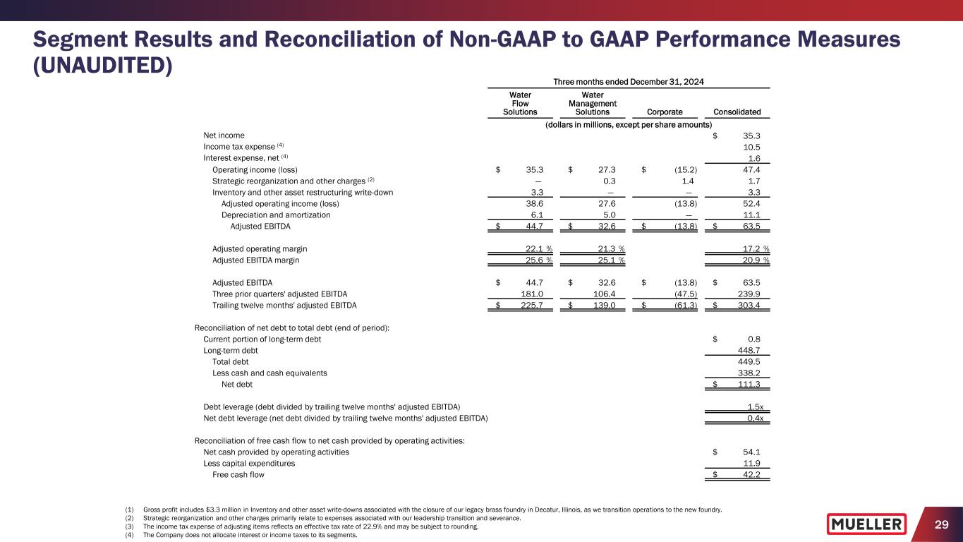 28 Segment Results and Reconciliation of Non-GAAP to GAAP Performance Measures (UNAUDITED) (1) Gross profit includes $3.3 million in Inventory and other asset write-downs associated with the closure of our legacy brass foundry in Decatur, Illinois, as we transition operations to the new foundry. (2) Strategic reorganization and other charges primarily relate to expenses associated with our leadership transition and severance. (3) The income tax expense of adjusting items reflects an effective tax rate of 22.9% and may be subject to rounding. Three months ended December 31, 2024 Water Flow Solutions Water Management Solutions Corporate Consolidated (dollars in millions, except per share amounts) Net sales $ 174.6 $ 129.7 $ — $ 304.3 Gross profit (1) $ 55.1 $ 47.9 $ — $ 103.0 Selling, general and administrative expenses 19.8 20.3 13.8 53.9 Strategic reorganization and other charges (2) — 0.3 1.4 1.7 Operating income (loss) $ 35.3 $ 27.3 $ (15.2) $ 47.4 Operating margin 20.2 % 21.0 % 15.6 % Capital expenditures $ 5.7 $ 6.2 $ — $ 11.9 Net income $ 35.3 Net income margin 11.6 % Reconciliation of non-GAAP to GAAP performance measures: Net income $ 35.3 Strategic reorganization and other charges (2) 1.7 Inventory and other asset restructuring write-down 3.3 Income tax expense of adjusting items (3) (1.1) Adjusted net income $ 39.2 Weighted average diluted shares outstanding 157.5 Net income per diluted share $ 0.22 Strategic reorganization and other charges per diluted share 0.01 Inventory and other asset restructuring write-down per diluted share 0.02 Income tax expense of adjusting items per diluted share (3) — Adjusted net income per diluted share $ 0.25
