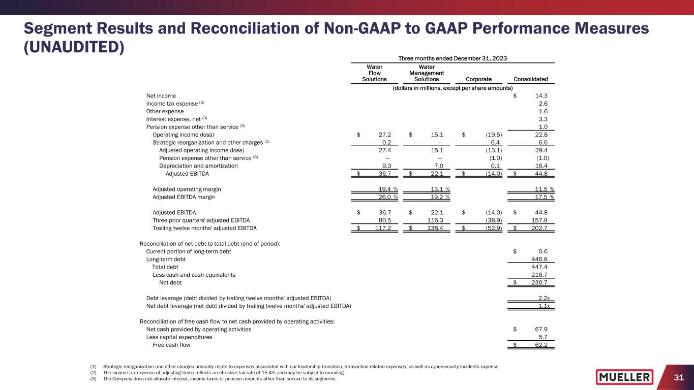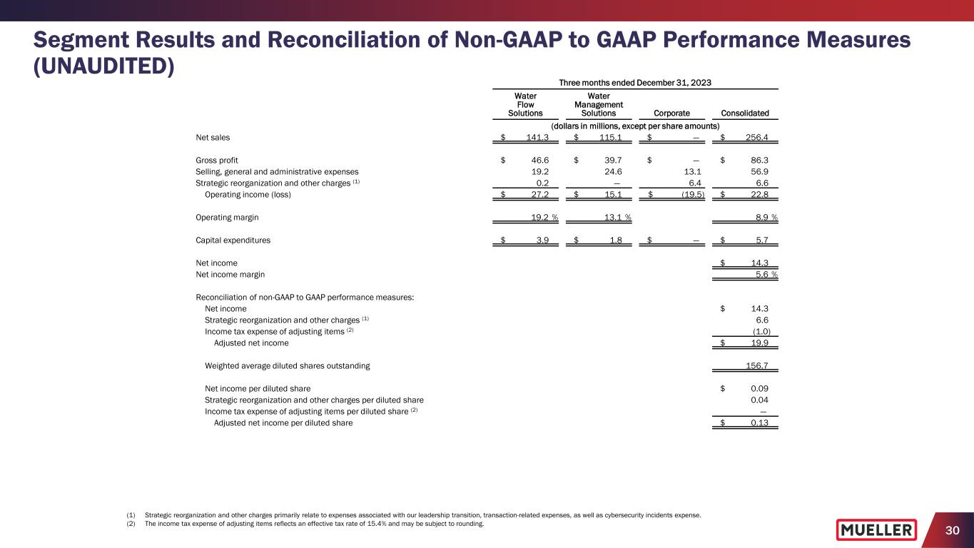 30 Segment Results and Reconciliation of Non-GAAP to GAAP Performance Measures (UNAUDITED) Three months ended December 31, 2023 Water Flow Solutions Water Management Solutions Corporate Consolidated (dollars in millions, except per share amounts) Net sales $ 141.3 $ 115.1 $ — $ 256.4 Gross profit $ 46.6 $ 39.7 $ — $ 86.3 Selling, general and administrative expenses 19.2 24.6 13.1 56.9 Strategic reorganization and other charges (1) 0.2 — 6.4 6.6 Operating income (loss) $ 27.2 $ 15.1 $ (19.5) $ 22.8 Operating margin 19.2 % 13.1 % 8.9 % Capital expenditures $ 3.9 $ 1.8 $ — $ 5.7 Net income $ 14.3 Net income margin 5.6 % Reconciliation of non-GAAP to GAAP performance measures: Net income $ 14.3 Strategic reorganization and other charges (1) 6.6 Income tax expense of adjusting items (2) (1.0) Adjusted net income $ 19.9 Weighted average diluted shares outstanding 156.7 Net income per diluted share $ 0.09 Strategic reorganization and other charges per diluted share 0.04 Income tax expense of adjusting items per diluted share (2) — Adjusted net income per diluted share $ 0.13 (1) Strategic reorganization and other charges primarily relate to expenses associated with our leadership transition, transaction-related expenses, as well as cybersecurity incidents expense. (2) The income tax expense of adjusting items reflects an effective tax rate of 15.4% and may be subject to rounding.