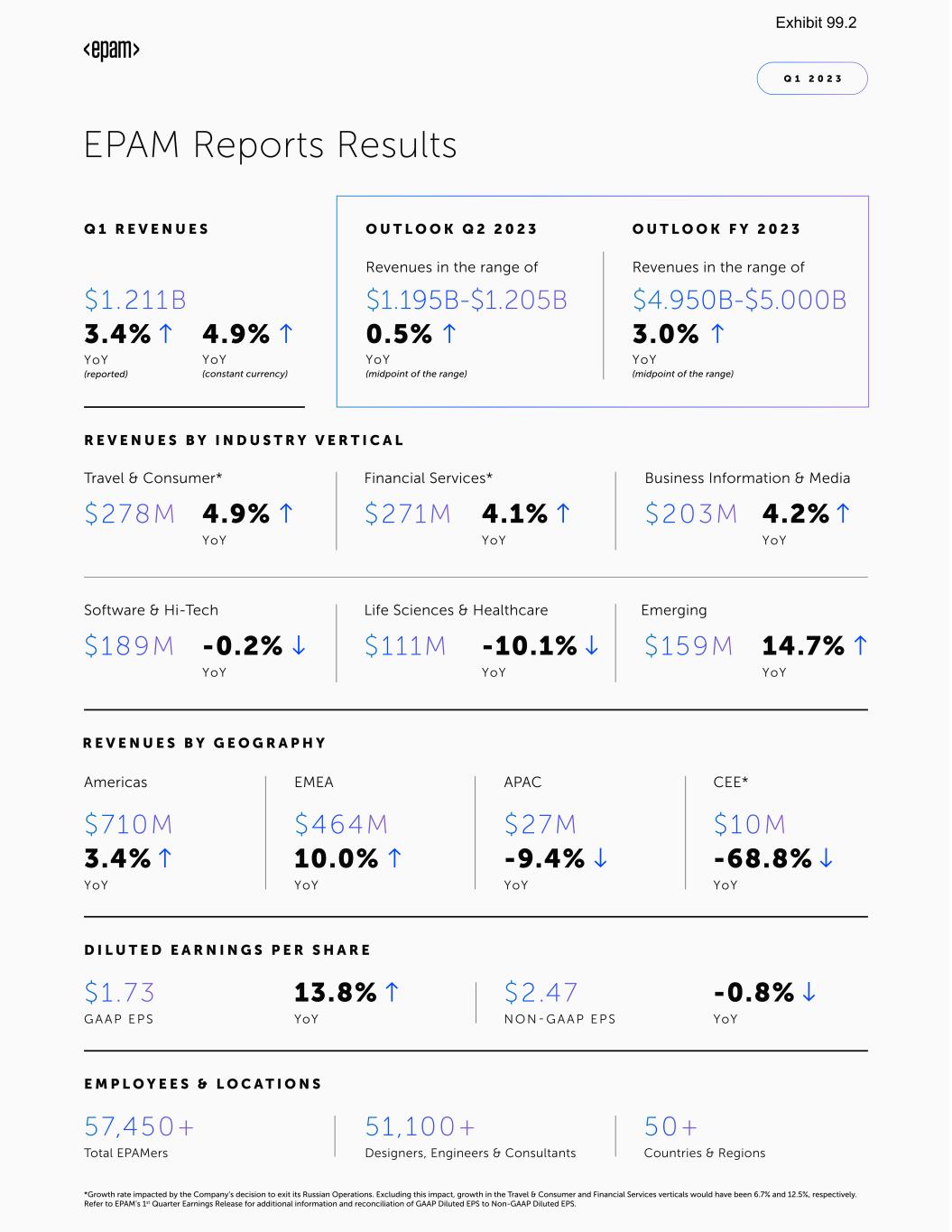This press release includes estimates and statements which may constitute forward-looking statements made pursuant to the safe harbor provisions of the Private Securities Litigation Reform Act of 1995, the accuracy of which are necessarily subject to risks, uncertainties, and assumptions as to future events that may not prove to be accurate. Our estimates and forward-looking statements are mainly based on our current expectations and estimates of future events and trends, which affect or may affect our business and operations. These statements may include words such as "may," "will," "should," "believe," "expect," "anticipate," "intend," "plan," "estimate" or similar expressions. Those future events and trends may relate to, among other things, developments relating to the war in Ukraine and escalation of the war in the surrounding region, political and civil unrest or military action in the geographies where we conduct business and operate, difficult conditions in global capital markets, foreign exchange markets and the broader economy, and the effect that these events may have on our revenues, operations, access to capital, and profitability. Other factors that could cause actual results to differ materially from those expressed or implied include general economic conditions, the risk factors discussed in the Company’s most recent Annual Report on Form 10-K and the factors discussed in the Company’s Quarterly Reports on Form 10-Q, particularly under the headings "Management’s Discussion and Analysis of Financial Condition and Results of Operations" and "Risk Factors" and other filings with the Securities and Exchange Commission. Although we believe that these estimates and forward-looking statements are based upon reasonable assumptions, they are subject to several risks and uncertainties and are made based on information currently available to us. EPAM undertakes no obligation to update or revise any forward-looking statements, whether as a result of new information, future events, or otherwise, except as may be required under applicable securities law.