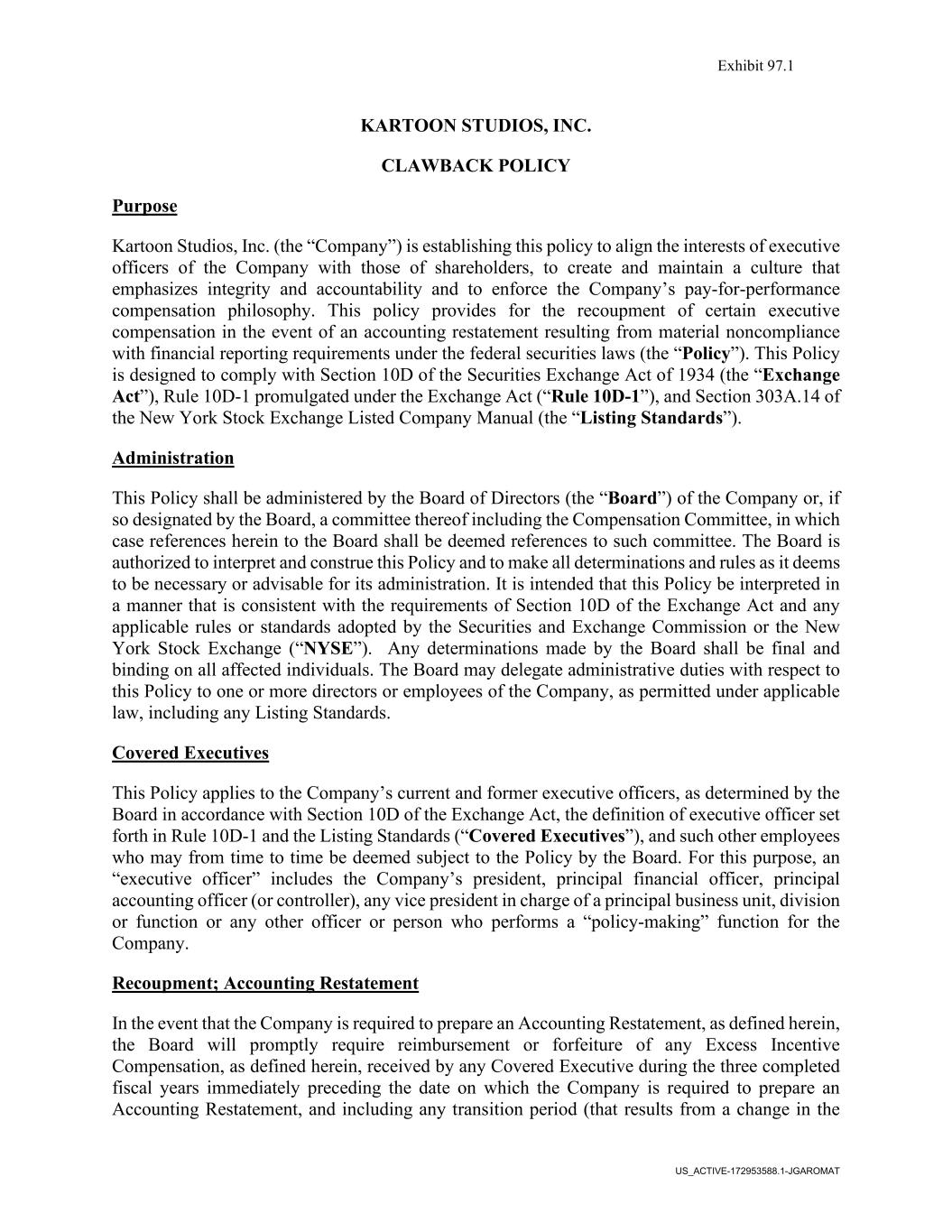 Exhibit 97.1 US_ACTIVE-172953588.1-JGAROMAT KARTOON STUDIOS, INC. CLAWBACK POLICY Purpose Kartoon Studios, Inc. (the “Company”) is establishing this policy to align the interests of executive officers of the Company with those of shareholders, to create and maintain a culture that emphasizes integrity and accountability and to enforce the Company’s pay-for-performance compensation philosophy. This policy provides for the recoupment of certain executive compensation in the event of an accounting restatement resulting from material noncompliance with financial reporting requirements under the federal securities laws (the “Policy”). This Policy is designed to comply with Section 10D of the Securities Exchange Act of 1934 (the “Exchange Act”), Rule 10D-1 promulgated under the Exchange Act (“Rule 10D-1”), and Section 303A.14 of the New York Stock Exchange Listed Company Manual (the “Listing Standards”). Administration This Policy shall be administered by the Board of Directors (the “Board”) of the Company or, if so designated by the Board, a committee thereof including the Compensation Committee, in which case references herein to the Board shall be deemed references to such committee. The Board is authorized to interpret and construe this Policy and to make all determinations and rules as it deems to be necessary or advisable for its administration. It is intended that this Policy be interpreted in a manner that is consistent with the requirements of Section 10D of the Exchange Act and any applicable rules or standards adopted by the Securities and Exchange Commission or the New York Stock Exchange (“NYSE”). Any determinations made by the Board shall be final and binding on all affected individuals. The Board may delegate administrative duties with respect to this Policy to one or more directors or employees of the Company, as permitted under applicable law, including any Listing Standards. Covered Executives This Policy applies to the Company’s current and former executive officers, as determined by the Board in accordance with Section 10D of the Exchange Act, the definition of executive officer set forth in Rule 10D-1 and the Listing Standards (“Covered Executives”), and such other employees who may from time to time be deemed subject to the Policy by the Board. For this purpose, an “executive officer” includes the Company’s president, principal financial officer, principal accounting officer (or controller), any vice president in charge of a principal business unit, division or function or any other officer or person who performs a “policy-making” function for the Company. Recoupment; Accounting Restatement In the event that the Company is required to prepare an Accounting Restatement, as defined herein, the Board will promptly require reimbursement or forfeiture of any Excess Incentive Compensation, as defined herein, received by any Covered Executive during the three completed fiscal years immediately preceding the date on which the Company is required to prepare an Accounting Restatement, and including any transition period (that results from a change in the