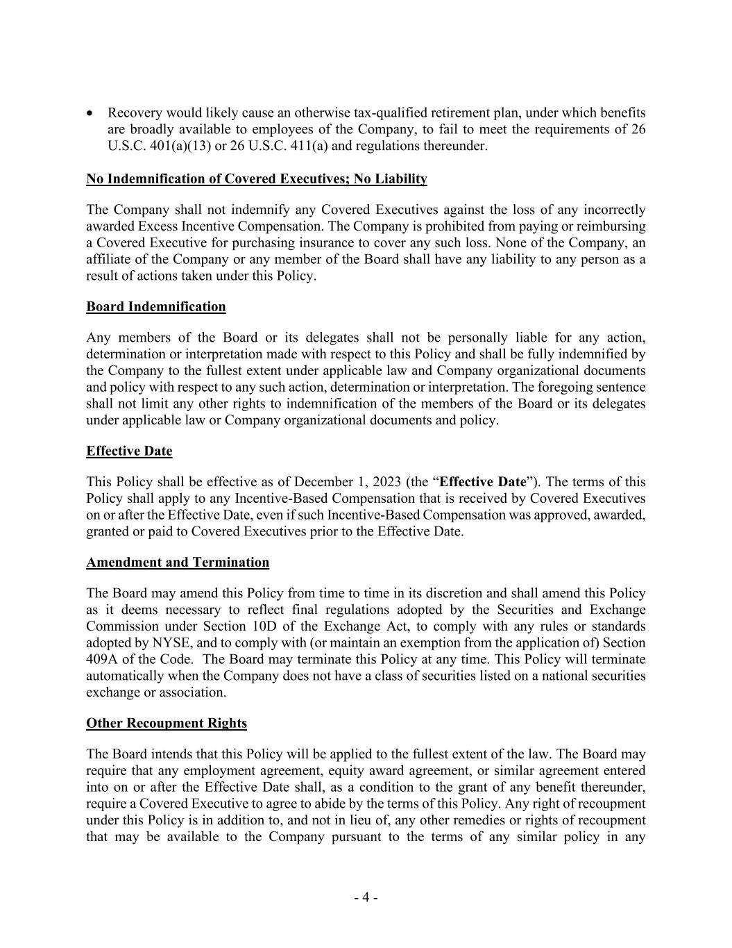 - 4 - • Recovery would likely cause an otherwise tax-qualified retirement plan, under which benefits are broadly available to employees of the Company, to fail to meet the requirements of 26 U.S.C. 401(a)(13) or 26 U.S.C. 411(a) and regulations thereunder. No Indemnification of Covered Executives; No Liability The Company shall not indemnify any Covered Executives against the loss of any incorrectly awarded Excess Incentive Compensation. The Company is prohibited from paying or reimbursing a Covered Executive for purchasing insurance to cover any such loss. None of the Company, an affiliate of the Company or any member of the Board shall have any liability to any person as a result of actions taken under this Policy. Board Indemnification Any members of the Board or its delegates shall not be personally liable for any action, determination or interpretation made with respect to this Policy and shall be fully indemnified by the Company to the fullest extent under applicable law and Company organizational documents and policy with respect to any such action, determination or interpretation. The foregoing sentence shall not limit any other rights to indemnification of the members of the Board or its delegates under applicable law or Company organizational documents and policy. Effective Date This Policy shall be effective as of December 1, 2023 (the “Effective Date”). The terms of this Policy shall apply to any Incentive-Based Compensation that is received by Covered Executives on or after the Effective Date, even if such Incentive-Based Compensation was approved, awarded, granted or paid to Covered Executives prior to the Effective Date. Amendment and Termination The Board may amend this Policy from time to time in its discretion and shall amend this Policy as it deems necessary to reflect final regulations adopted by the Securities and Exchange Commission under Section 10D of the Exchange Act, to comply with any rules or standards adopted by NYSE, and to comply with (or maintain an exemption from the application of) Section 409A of the Code. The Board may terminate this Policy at any time. This Policy will terminate automatically when the Company does not have a class of securities listed on a national securities exchange or association. Other Recoupment Rights The Board intends that this Policy will be applied to the fullest extent of the law. The Board may require that any employment agreement, equity award agreement, or similar agreement entered into on or after the Effective Date shall, as a condition to the grant of any benefit thereunder, require a Covered Executive to agree to abide by the terms of this Policy. Any right of recoupment under this Policy is in addition to, and not in lieu of, any other remedies or rights of recoupment that may be available to the Company pursuant to the terms of any similar policy in any