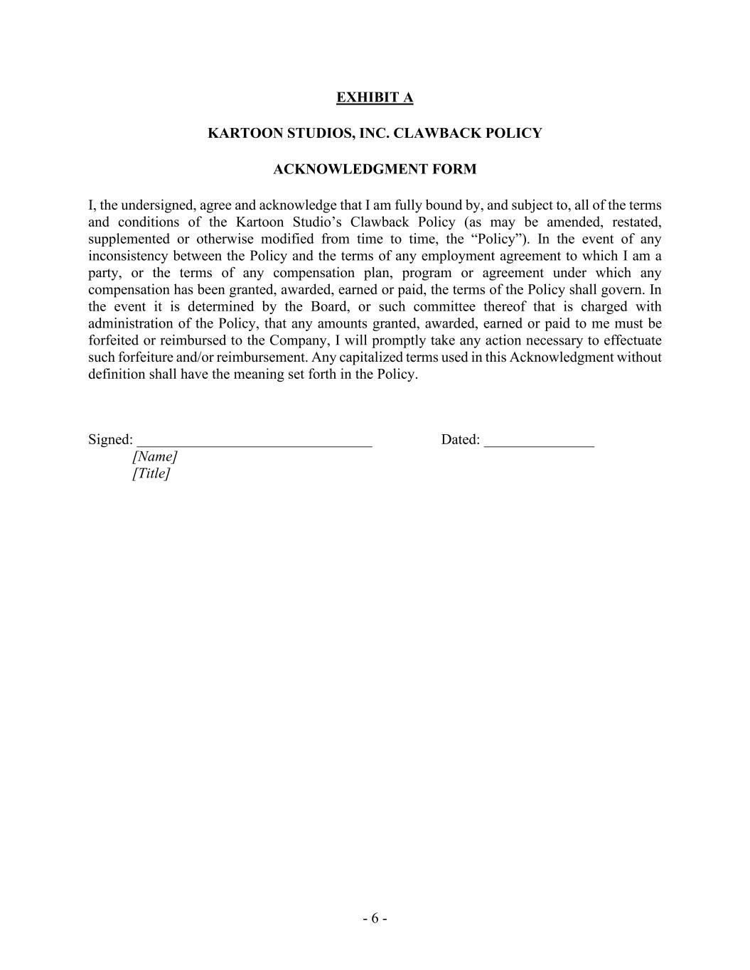 - 6 - EXHIBIT A KARTOON STUDIOS, INC. CLAWBACK POLICY ACKNOWLEDGMENT FORM I, the undersigned, agree and acknowledge that I am fully bound by, and subject to, all of the terms and conditions of the Kartoon Studio’s Clawback Policy (as may be amended, restated, supplemented or otherwise modified from time to time, the “Policy”). In the event of any inconsistency between the Policy and the terms of any employment agreement to which I am a party, or the terms of any compensation plan, program or agreement under which any compensation has been granted, awarded, earned or paid, the terms of the Policy shall govern. In the event it is determined by the Board, or such committee thereof that is charged with administration of the Policy, that any amounts granted, awarded, earned or paid to me must be forfeited or reimbursed to the Company, I will promptly take any action necessary to effectuate such forfeiture and/or reimbursement. Any capitalized terms used in this Acknowledgment without definition shall have the meaning set forth in the Policy. Signed: ________________________________ Dated: _______________ [Name] [Title]