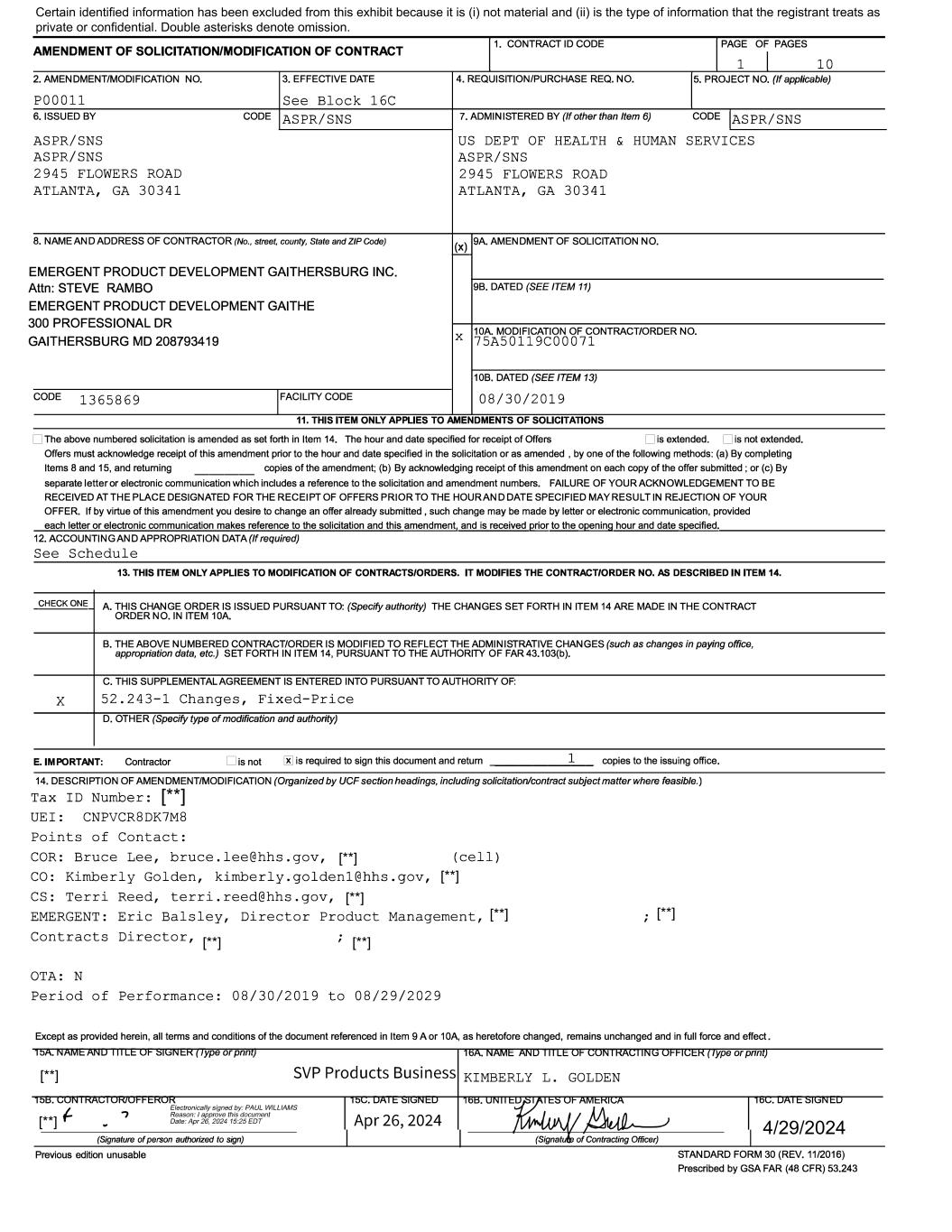 Modification P00011 makes the following changes to the contract: 1. Reduces the annual not to exceed (NTE) amount for option years 5 through 9, 2. Reduces the minimum annual order quantity from [**] of ACAM2000 in Option Years 5 through 9; 3. Increases the total quantity of [**] from [**] and amends the option period in which [**] is provided; 4. Increases the quantity of [**] for Option Year 5 from [**]; and 5. Revises the Performance Work Statement to add [**] to the requirement at no additional cost to the Government. ALL OTHER TERMS AND CONDITIONS REMAIN THE SAME. Details of changes: Option Year 5, NTE amount reduced from [**] Option Year 6, NTE amount reduced from [**] Option Year 7, NTE amount reduced from [**] Option Year 8, NTE amount reduced from [**] Option Year 9, NTE amount reduced from [**] Table 1: Overall Price Summary, amended as follows (changes made by Modification P00011 are shown in red): Item CLIN X001 – Doses CLIN X002 – Diluent Replacement CLIN X003 – Syringe Replacement CLIN X004 – Re-labeling [**] [**] ACAM Testing Grand Total Contract Year ACAM Doses Extended Price Diluent Vials Extended Price Transfer Syringes Extended Price Target Expired Doses/SNS Expired Doses/SNS 000X Base [**] [**] [**] 100X Option Year 1 [**] [**] [**] [**] 200X Option Year 2 [**] [**] [**] [**] 300X Option Year 3 [**] [**] [**] 400X Option Year 4 [**] [**] [**] [**] [**] [**] [**] [**] 500X Option Year 5 [**] [**] [**] [**] [**] [**] [**] [**] [**] 600X Option Year 6 [**] [**] [**] [**] [**] [**] [**] [**] 700X Option Year 7 [**] [**] [**] [**] [**] [**] [**] [**] [**] 800X Option Year 8 [**] [**] [**] [**] [**] [**] [**] [**] 900X Option Year 9 [**] [**] [**] [**] [**] [**] [**] [**] [**] Overall [**] [**] [**] [**] [**] [**] [**] [**] [**] [**] Note: [**] Timing for [**] and ACAM testing will be determined annually, following the exercise of the associated annual procurement (CLIN X001). Table 2: Task 1 – ACAM2000 Vaccine Manufacture and Provision to the SNS, amended as follows (changes made by Modification P00011 are shown in red): 0001 (Base) 1001 (Option) 2001 (Option) 3001 (Option) 4001 (Option) Contract Year 08/15/19-09/30/19 10/01/19-09/30/20 10/01/20-09/30/21 10/01/21-10/30/22 10/31/22-09/30/23 Target Exercise- By Date 8/15/2019 12/1/2019 12/1/2020 12/1/2021 12/1/2022 Delivery Target 12/30/2019 12/30/2020 12/30/2021 12/30/2022 12/30/2023 [**] Doses [**] [**] [**] [**] [**] Extended Price [**] [**] [**] [**] [**] [**]Doses [**] [**] [**] [**] [**] Page 2 of 10