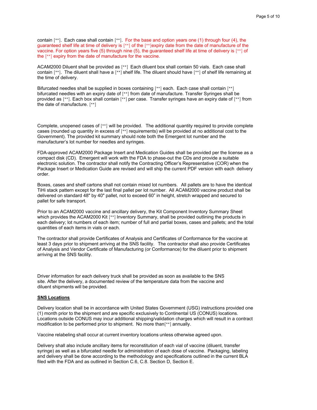 contain [**]. Each case shall contain [**]. For the base and option years one (1) through four (4), the guaranteed shelf life at time of delivery is [**] of the [**]expiry date from the date of manufacture of the vaccine. For option years five (5) through nine (5), the guaranteed shelf life at time of delivery is [**] of the [**] expiry from the date of manufacture for the vaccine. ACAM2000 Diluent shall be provided as [**] Each diluent box shall contain 50 vials. Each case shall contain [**]. The diluent shall have a [**] shelf life. The diluent should have [**] of shelf life remaining at the time of delivery. Bifurcated needles shall be supplied in boxes containing [**] each. Each case shall contain [**] bifurcated needles with an expiry date of [**] from date of manufacture. Transfer Syringes shall be provided as [**]. Each box shall contain [**] per case. Transfer syringes have an expiry date of [**] from the date of manufacture. [**] Complete, unopened cases of [**] will be provided. The additional quantity required to provide complete cases (rounded up quantity in excess of [**] requirements) will be provided at no additional cost to the Government). The provided kit summary should note both the Emergent lot number and the manufacturer’s lot number for needles and syringes. FDA-approved ACAM2000 Package Insert and Medication Guides shall be provided per the license as a compact disk (CD). Emergent will work with the FDA to phase-out the CDs and provide a suitable electronic solution. The contractor shall notify the Contracting Officer’s Representative (COR) when the Package Insert or Medication Guide are revised and will ship the current PDF version with each delivery order. Boxes, cases and shelf cartons shall not contain mixed lot numbers. All pallets are to have the identical TiHi stack pattern except for the last final pallet per lot number. All ACAM2000 vaccine product shall be delivered on standard 48" by 40" pallet, not to exceed 60” in height, stretch wrapped and secured to pallet for safe transport. Prior to an ACAM2000 vaccine and ancillary delivery, the Kit Component Inventory Summary Sheet which provides the ACAM2000 Kit [**] Inventory Summary, shall be provided outlining the products in each delivery; lot numbers of each item; number of full and partial boxes, cases and pallets; and the total quantities of each items in vials or each. The contractor shall provide Certificates of Analysis and Certificates of Conformance for the vaccine at least 3 days prior to shipment arriving at the SNS facility. The contractor shall also provide Certificates of Analysis and Vendor Certificate of Manufacturing (or Conformance) for the diluent prior to shipment arriving at the SNS facility. Driver information for each delivery truck shall be provided as soon as available to the SNS site. After the delivery, a documented review of the temperature data from the vaccine and diluent shipments will be provided. SNS Locations Delivery location shall be in accordance with United States Government (USG) instructions provided one (1) month prior to the shipment and are specific exclusively to Continental US (CONUS) locations. Locations outside CONUS may incur additional shipping/validation charges which will result in a contract modification to be performed prior to shipment. No more than[**] annually. Vaccine relabeling shall occur at current inventory locations unless otherwise agreed upon. Delivery shall also include ancillary items for reconstitution of each vial of vaccine (diluent, transfer syringe) as well as a bifurcated needle for administration of each dose of vaccine. Packaging, labeling and delivery shall be done according to the methodology and specifications outlined in the current BLA filed with the FDA and as outlined in Section C.6, C.8. Section D, Section E. Page 5 of 10
