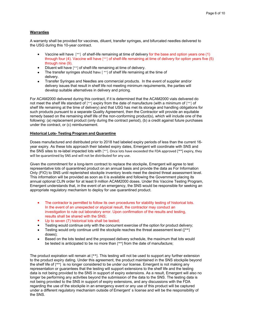 Warranties A warranty shall be provided for vaccines, diluent, transfer syringes, and bifurcated needles delivered to the USG during this 10-year contract. Vaccine will have [**] of shelf-life remaining at time of delivery for the base and option years one (1) through four (4). Vaccine will have [**] of shelf-life remaining at time of delivery for option years five (5) through nine (9). Diluent will have [**] of shelf-life remaining at time of delivery. The transfer syringes should have [ **] of shelf life remaining at the time of delivery. Transfer Syringes and Needles are commercial products. In the event of supplier and/or delivery issues that result in shelf life not meeting minimum requirements, the parties will develop suitable alternatives in delivery and pricing. For ACAM2000 delivered during this contract, if it is determined that the ACAM2000 vials delivered do not meet the shelf life standard of [**] expiry from the date of manufacture (with a minimum of [**] of shelf life remaining at the time of delivery) and that USG has met its storage and handling obligations for such products pursuant to a separate Quality Agreement, then the Contractor will provide an equitable remedy based on the remaining shelf life of the non-conforming product(s), which will include one of the following: (a) replacement product (only during the contract period), (b) a credit against future purchases under the contract, or (c) reimbursement. Historical Lots- Testing Program and Quarantine Doses manufactured and distributed prior to 2018 had labeled expiry periods of less than the current 16- year expiry. As these lots approach their labeled expiry dates, Emergent will coordinate with SNS and the SNS sites to re-label impacted lots with [**]. Once lots have exceeded the FDA approved [**] expiry, they will be quarantined by SNS and will not be distributed for any use. Given the commitment for a long-term contract to replace the stockpile, Emergent will agree to test representative lots of quarantined product on an annual basis and provide the data as For Information Only (FIO) to SNS until replenished stockpile inventory levels meet the desired threat assessment level. This information will be provided as soon as it is available and following the Government placing its annual optional CLIN order for at least 9 million ACAM2000 doses. Under this Vaccine Testing Program, Emergent understands that, in the event of an emergency, the SNS would be responsible for seeking an appropriate regulatory mechanism to deploy for use quarantined product. The contractor is permitted to follow its own procedures for stability testing of historical lots. In the event of an unexpected or atypical result, the contractor may conduct an investigation to rule out laboratory error. Upon confirmation of the results and testing, results shall be shared with the SNS; Up to seven (7) historical lots shall be tested; Testing would continue only with the concurrent exercise of the option for product delivery; Testing would only continue until the stockpile reaches the threat assessment level ([**] doses); Based on the lots tested and the proposed delivery schedule, the maximum that lots would be tested is anticipated to be no more than [**] from the date of manufacture; The product expiration will remain at [**]. This testing will not be used to support any further extension to the product expiry dating. Under this agreement, the product maintained in the SNS stockpile beyond the shelf life of [**] is no longer considered to be under our license. Emergent is not making any representation or guarantees that the testing will support extensions to the shelf life and the testing data is not being provided to the SNS in support of expiry extensions. As a result, Emergent will also no longer be performing any activities beyond the submission of the data to the SNS. The testing data is not being provided to the SNS in support of expiry extensions, and any discussions with the FDA regarding the use of the stockpile in an emergency event or any use of this product will be captured under a different regulatory mechanism outside of Emergent’ s license and will be the responsibility of the SNS. Page 6 of 10