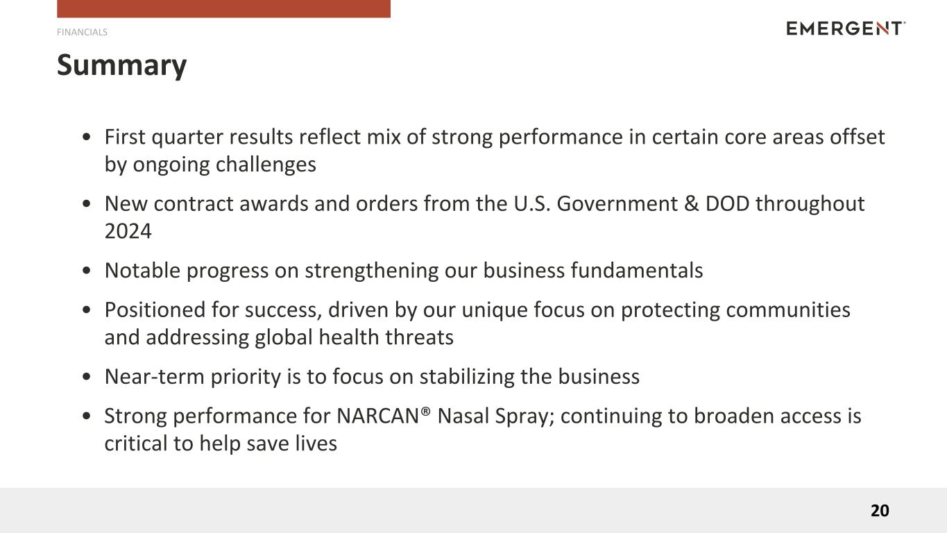 •Continued progress on strengthening our fundamentals with key focus on our Medical Countermeasure (“MCM”) and NARCAN® products