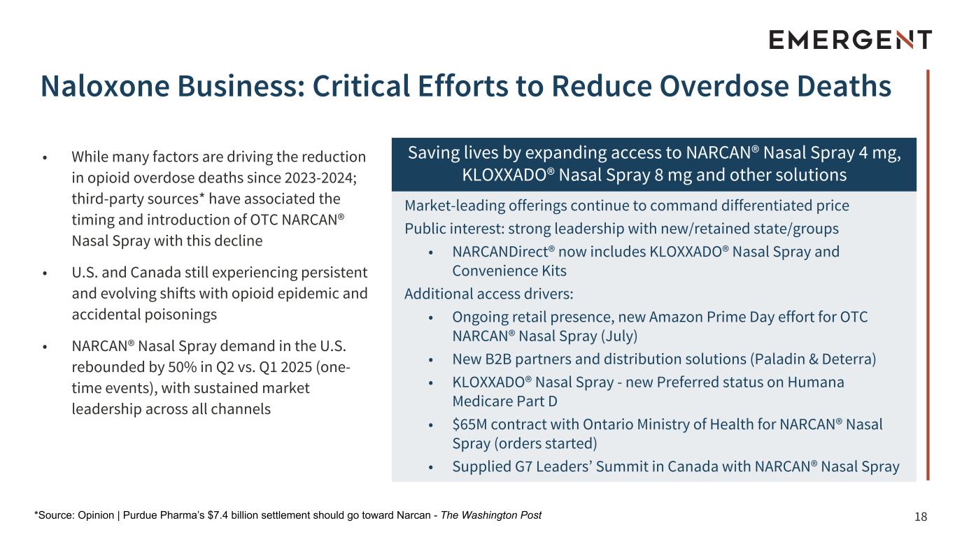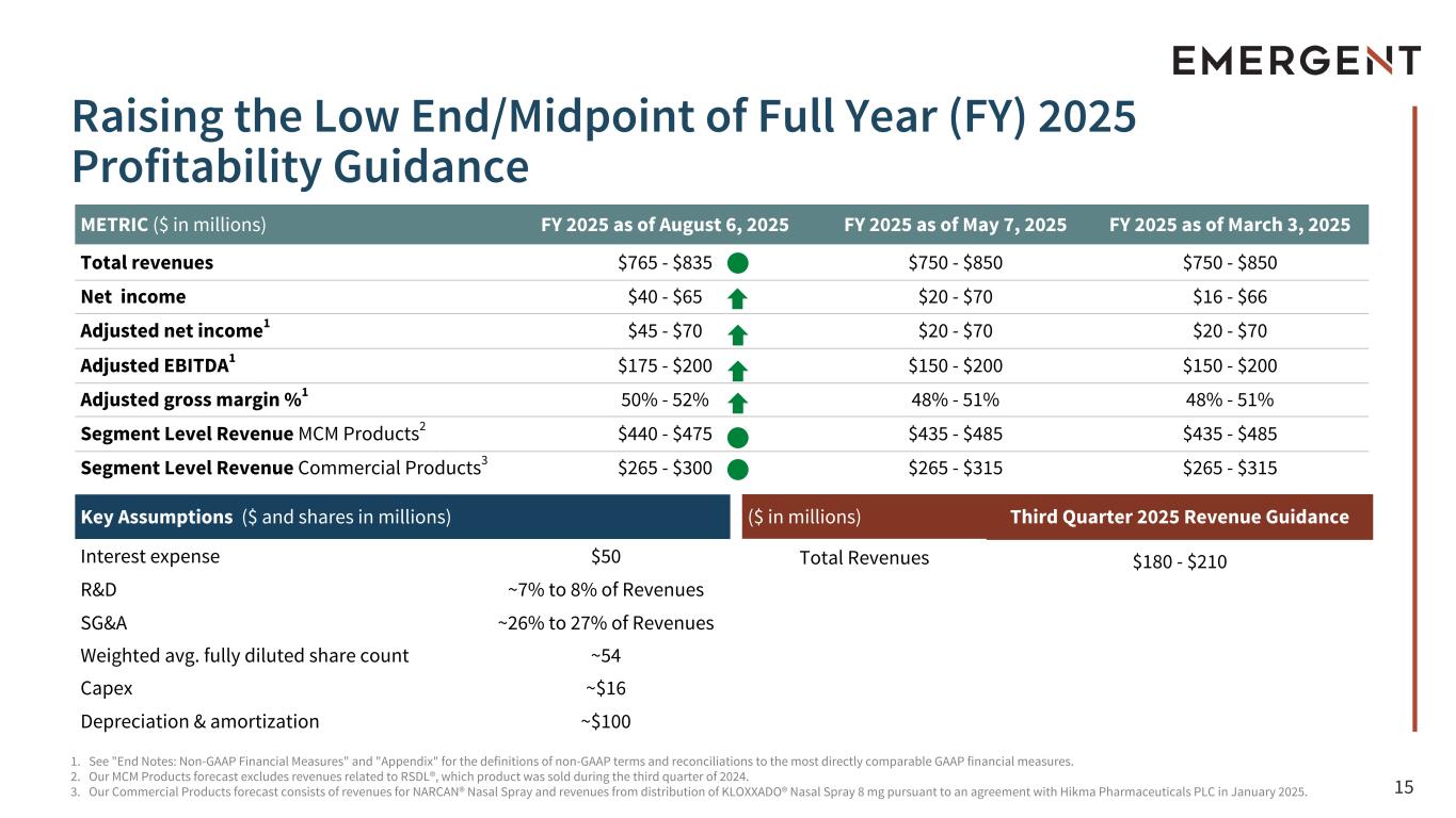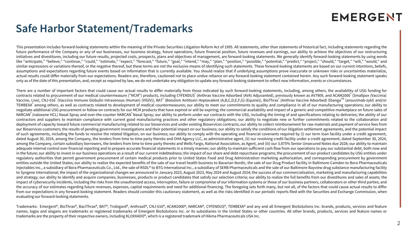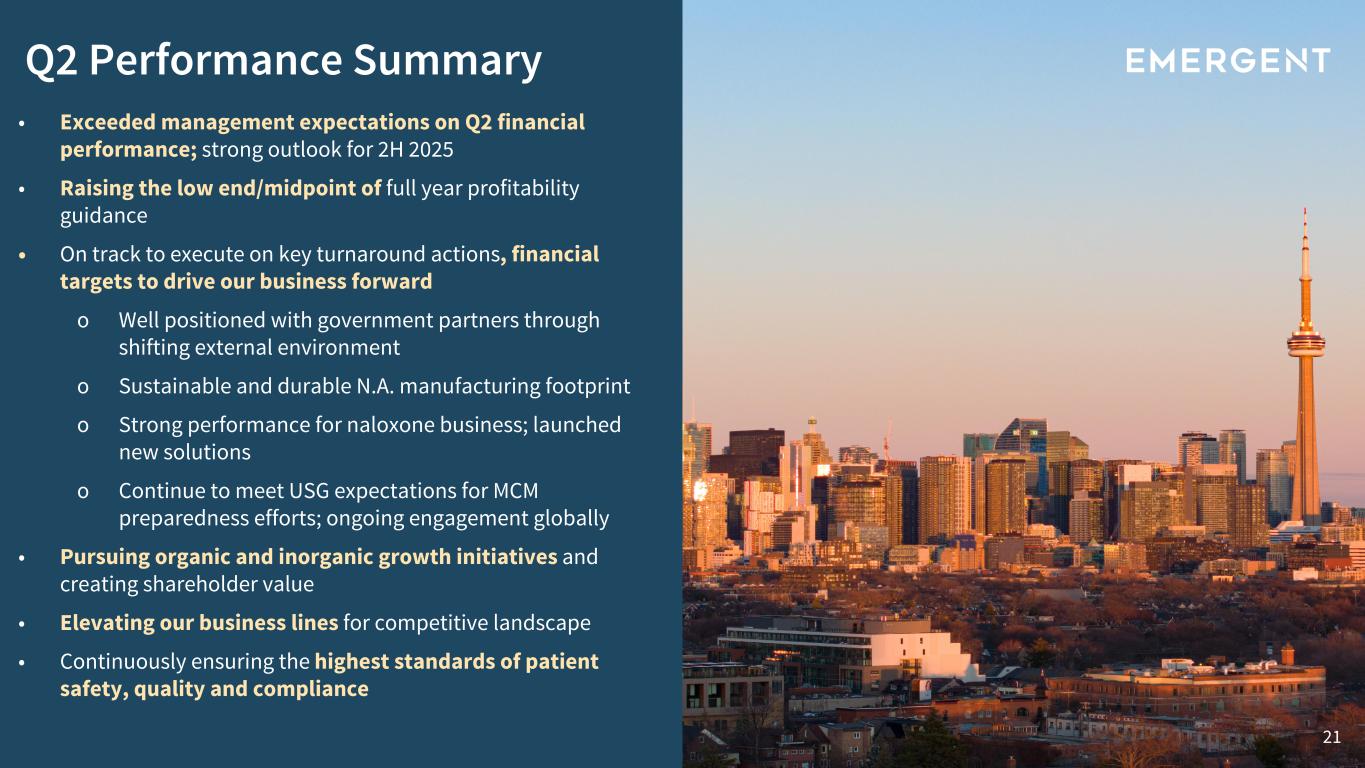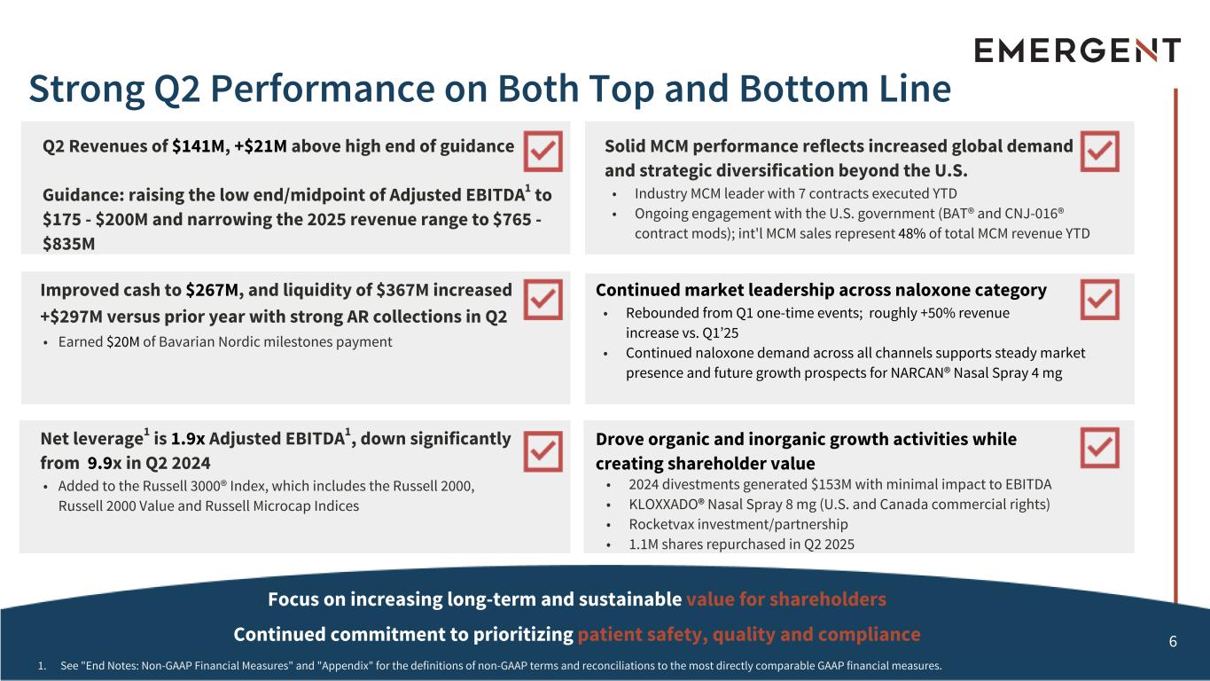 “Our second quarter results exceeded the top end of our revenue guidance by $21 million, and the bottom line exceeded our own internal expectations. In light of this, we are raising the low end/midpoint of full year 2025 profitability guidance, reflecting strong execution of our multi-year transformation plan,” said Joe Papa, president and CEO of Emergent. “We are making solid progress against key turnaround priorities, driven by improved profitability, expanding margins and sustained positive cash flow. Year to date, we have secured seven biodefense contract modifications, further demonstrating our leadership in medical countermeasures with the U.S. government and allied government stakeholders. We continue to explore potential organic and inorganic opportunities and assess strategic external investments that support stable, long-term growth for the enterprise. With sustained demand for life-saving naloxone, NARCAN® Nasal Spray 4 mg and KLOXXADO® Nasal Spray 8 mg, as well as an encouraging outlook in our medical countermeasures business, we remain confident in our full year guidance and expect a strong second half of the year.”
