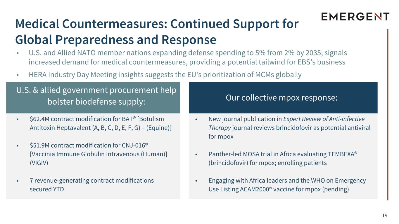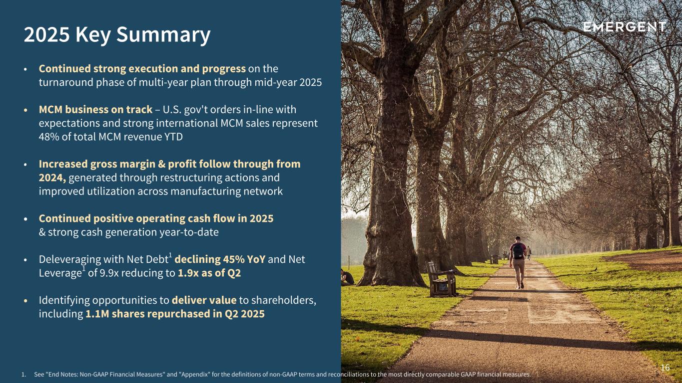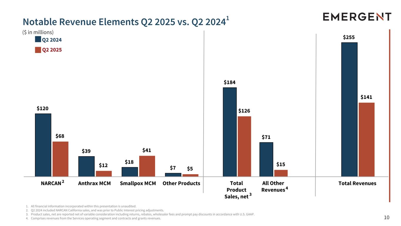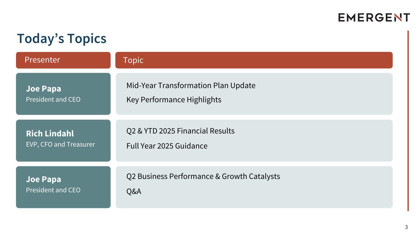 “Our second quarter results exceeded the top end of our revenue guidance by $21 million, and the bottom line exceeded our own internal expectations. In light of this, we are raising the low end/midpoint of full year 2025 profitability guidance, reflecting strong execution of our multi-year transformation plan,” said Joe Papa, president and CEO of Emergent. “We are making solid progress against key turnaround priorities, driven by improved profitability, expanding margins and sustained positive cash flow. Year to date, we have secured seven biodefense contract modifications, further demonstrating our leadership in medical countermeasures with the U.S. government and allied government stakeholders. We continue to explore potential organic and inorganic opportunities and assess strategic external investments that support stable, long-term growth for the enterprise. With sustained demand for life-saving naloxone, NARCAN® Nasal Spray 4 mg and KLOXXADO® Nasal Spray 8 mg, as well as an encouraging outlook in our medical countermeasures business, we remain confident in our full year guidance and expect a strong second half of the year.”