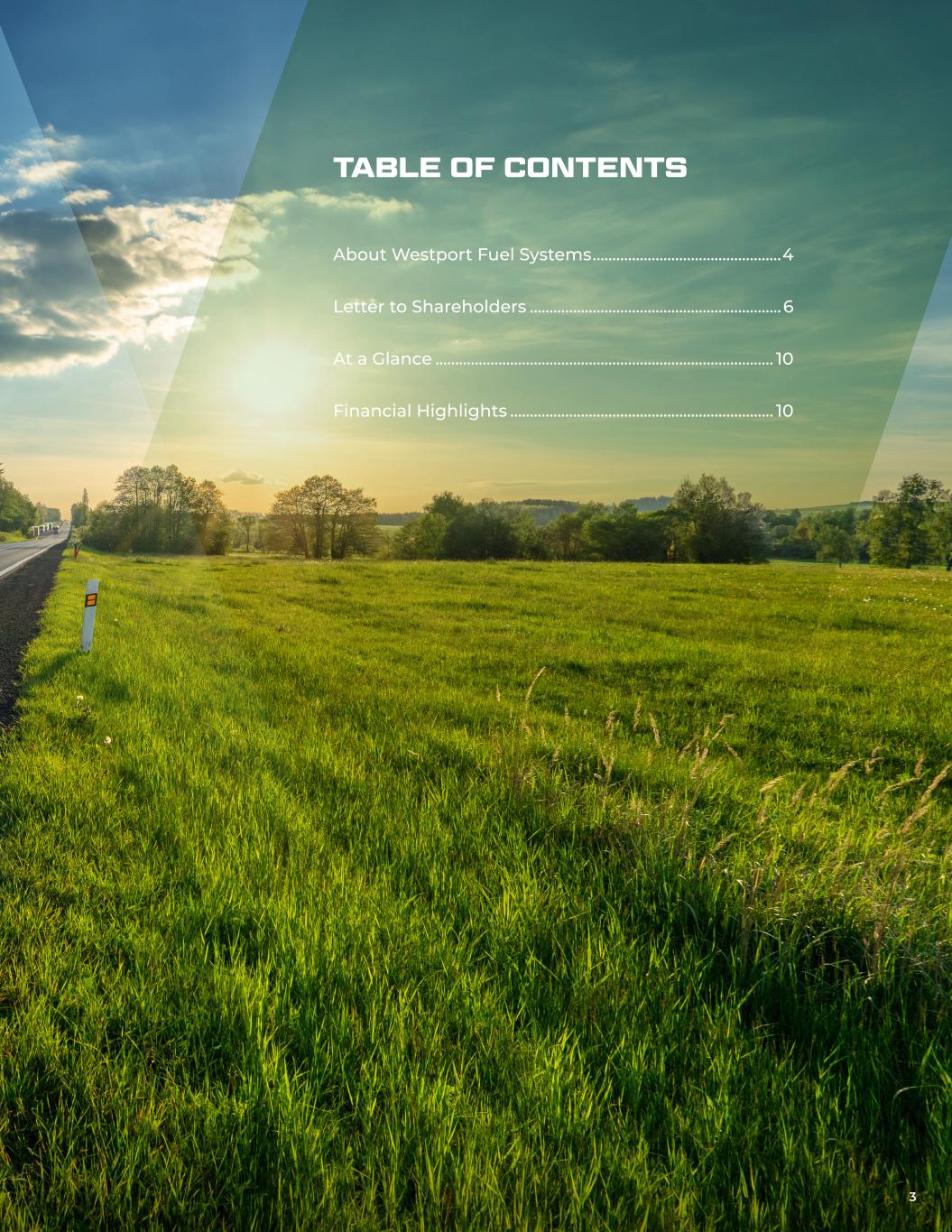 3 TABLE OF CONTENTS About Westport Fuel Systems ................................................4 Letter to Shareholders ................................................................6 At a Glance ...................................................................................... 10 Financial Highlights ................................................................... 10
