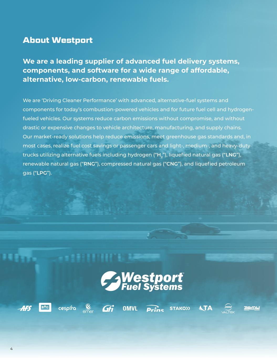 4 We are a leading supplier of advanced fuel delivery systems, components, and software for a wide range of affordable, alternative, low-carbon, renewable fuels. We are ‘Driving Cleaner Performance’ with advanced, alternative-fuel systems and components for today’s combustion-powered vehicles and for future fuel cell and hydrogen- fueled vehicles. Our systems reduce carbon emissions without compromise, and without drastic or expensive changes to vehicle architecture, manufacturing, and supply chains. Our market-ready solutions help reduce emissions, meet greenhouse gas standards and, in most cases, realize fuel cost savings or passenger cars and light-, medium-, and heavy-duty trucks utilizing alternative fuels including hydrogen (“H2”), liquefied natural gas (“LNG”), renewable natural gas (“RNG”), compressed natural gas (“CNG”), and liquefied petroleum gas (“LPG”). About Westport