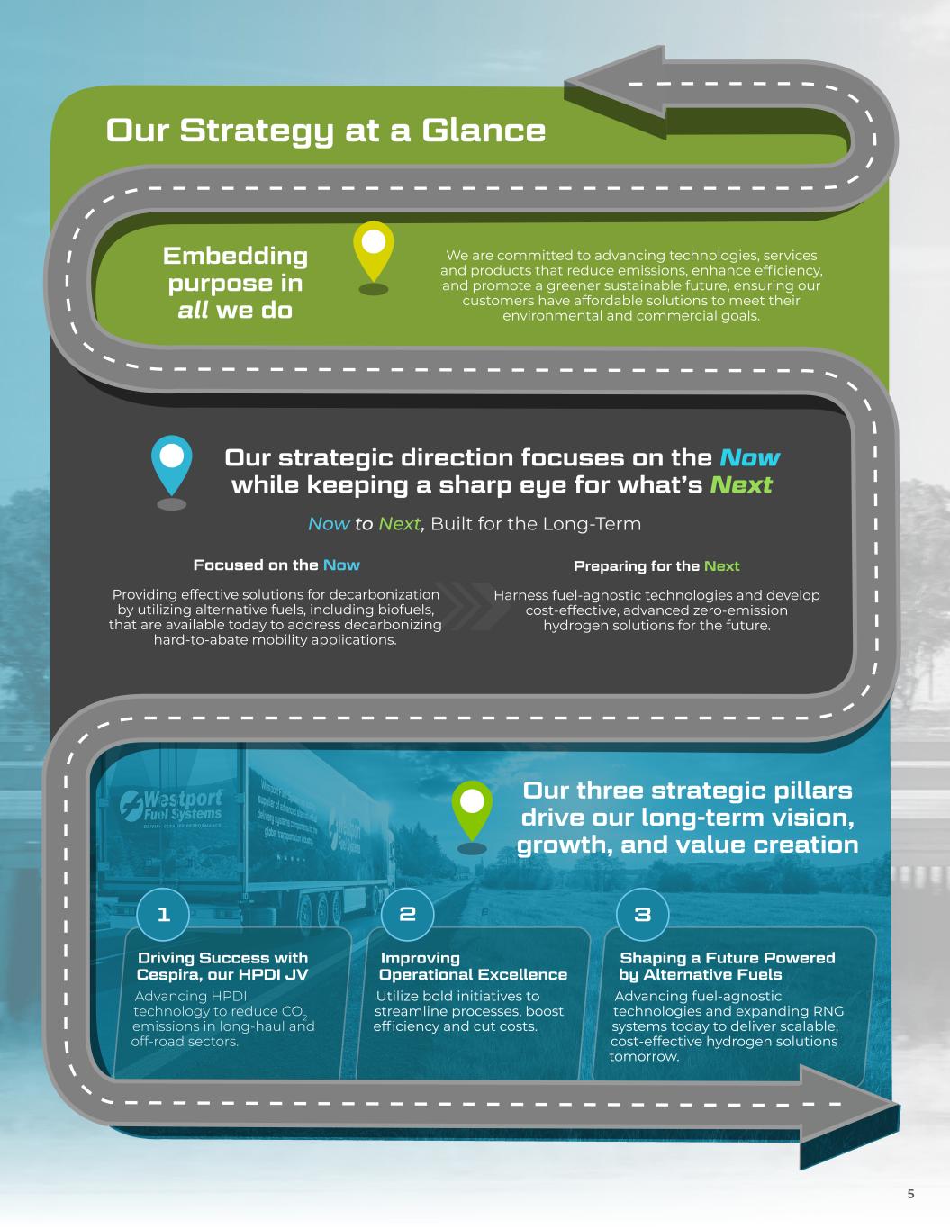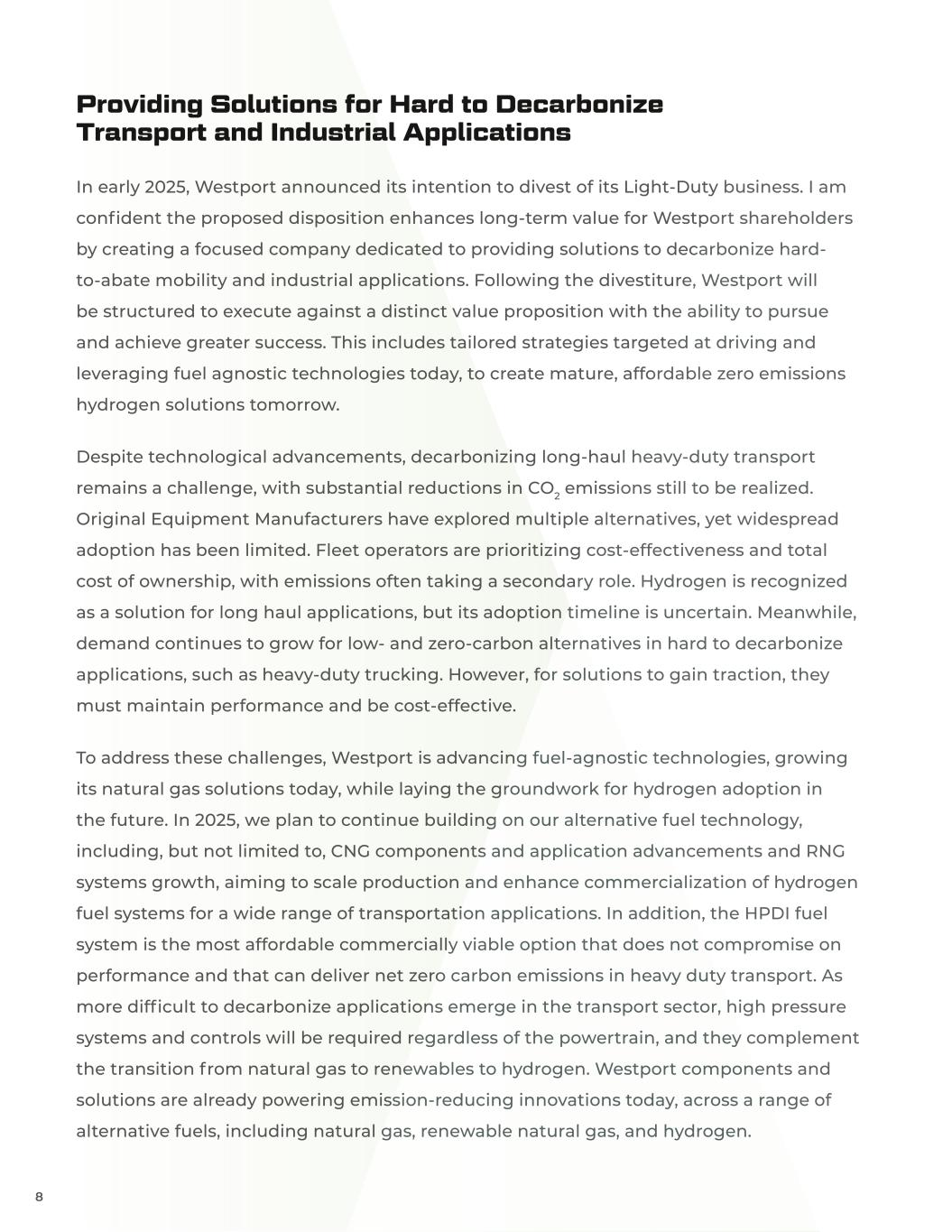 Providing Solutions for Hard to Decarbonize Transport and Industrial Applications In early 2025, Westport announced its intention to divest of its Light-Duty business. I am confident the proposed disposition enhances long-term value for Westport shareholders by creating a focused company dedicated to providing solutions to decarbonize hard- to-abate mobility and industrial applications. Following the divestiture, Westport will be structured to execute against a distinct value proposition with the ability to pursue and achieve greater success. This includes tailored strategies targeted at driving and leveraging fuel agnostic technologies today, to create mature, affordable zero emissions hydrogen solutions tomorrow. Despite technological advancements, decarbonizing long-haul heavy-duty transport remains a challenge, with substantial reductions in CO2 emissions still to be realized. Original Equipment Manufacturers have explored multiple alternatives, yet widespread adoption has been limited. Fleet operators are prioritizing cost-effectiveness and total cost of ownership, with emissions often taking a secondary role. Hydrogen is recognized as a solution for long haul applications, but its adoption timeline is uncertain. Meanwhile, demand continues to grow for low- and zero-carbon alternatives in hard to decarbonize applications, such as heavy-duty trucking. However, for solutions to gain traction, they must maintain performance and be cost-effective. To address these challenges, Westport is advancing fuel-agnostic technologies, growing its natural gas solutions today, while laying the groundwork for hydrogen adoption in the future. In 2025, we plan to continue building on our alternative fuel technology, including, but not limited to, CNG components and application advancements and RNG systems growth, aiming to scale production and enhance commercialization of hydrogen fuel systems for a wide range of transportation applications. In addition, the HPDI fuel system is the most affordable commercially viable option that does not compromise on performance and that can deliver net zero carbon emissions in heavy duty transport. As more difficult to decarbonize applications emerge in the transport sector, high pressure systems and controls will be required regardless of the powertrain, and they complement the transition from natural gas to renewables to hydrogen. Westport components and solutions are already powering emission-reducing innovations today, across a range of alternative fuels, including natural gas, renewable natural gas, and hydrogen. 8