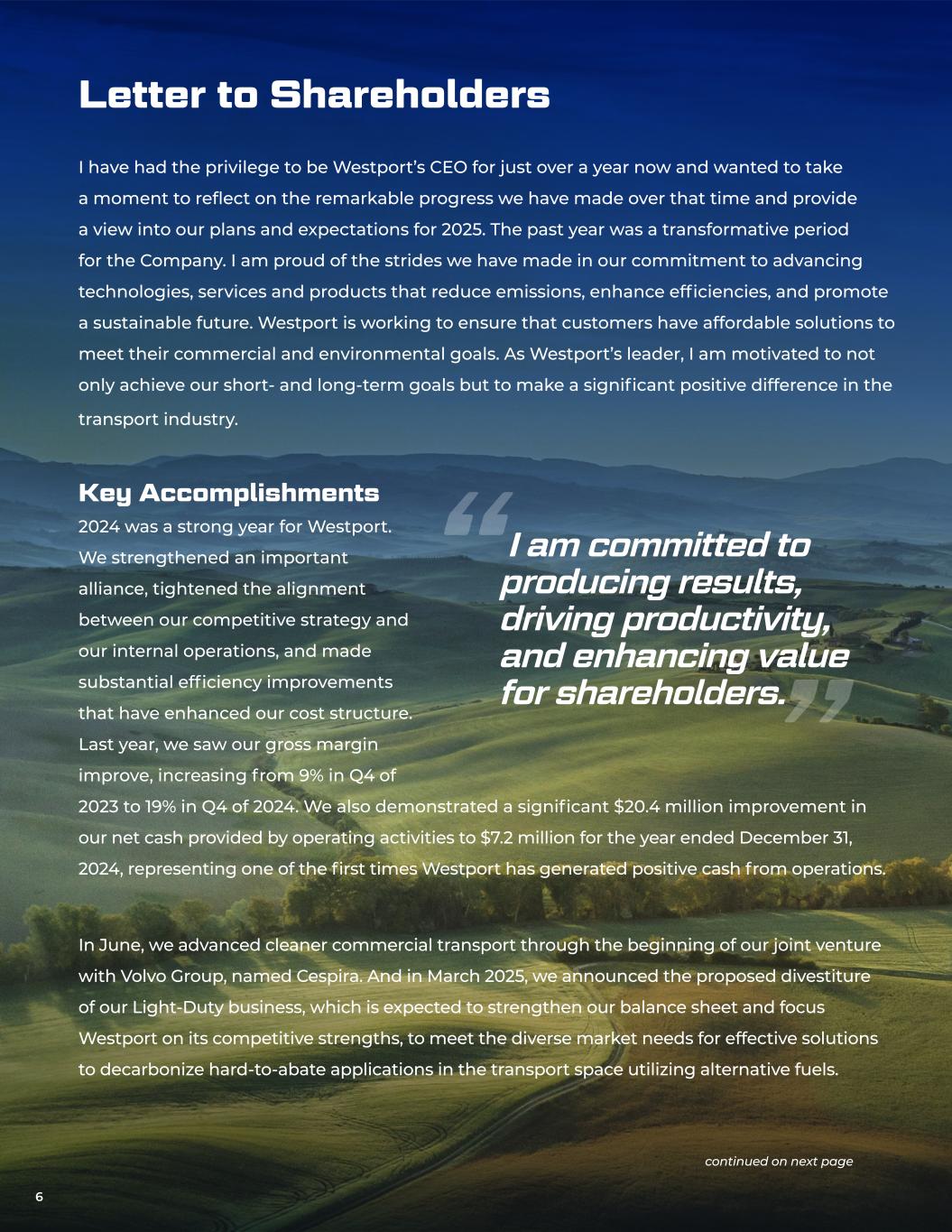 continued on next page 6 Letter to Shareholders I have had the privilege to be Westport’s CEO for just over a year now and wanted to take a moment to reflect on the remarkable progress we have made over that time and provide a view into our plans and expectations for 2025. The past year was a transformative period for the Company. I am proud of the strides we have made in our commitment to advancing technologies, services and products that reduce emissions, enhance efficiencies, and promote a sustainable future. Westport is working to ensure that customers have affordable solutions to meet their commercial and environmental goals. As Westport’s leader, I am motivated to not only achieve our short- and long-term goals but to make a significant positive difference in the transport industry. Key Accomplishments 2024 was a strong year for Westport. We strengthened an important alliance, tightened the alignment between our competitive strategy and our internal operations, and made substantial efficiency improvements that have enhanced our cost structure. Last year, we saw our gross margin improve, increasing from 9% in Q4 of 2023 to 19% in Q4 of 2024. We also demonstrated a significant $20.4 million improvement in our net cash provided by operating activities to $7.2 million for the year ended December 31, 2024, representing one of the first times Westport has generated positive cash from operations. In June, we advanced cleaner commercial transport through the beginning of our joint venture with Volvo Group, named Cespira. And in March 2025, we announced the proposed divestiture of our Light-Duty business, which is expected to strengthen our balance sheet and focus Westport on its competitive strengths, to meet the diverse market needs for effective solutions to decarbonize hard-to-abate applications in the transport space utilizing alternative fuels. I am committed to producing results, driving productivity, and enhancing value for shareholders. “ ”