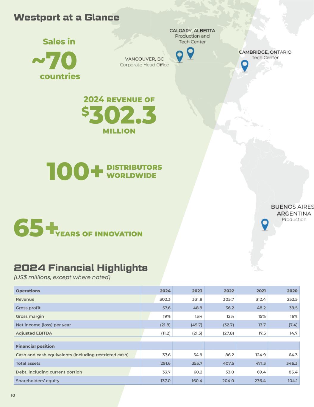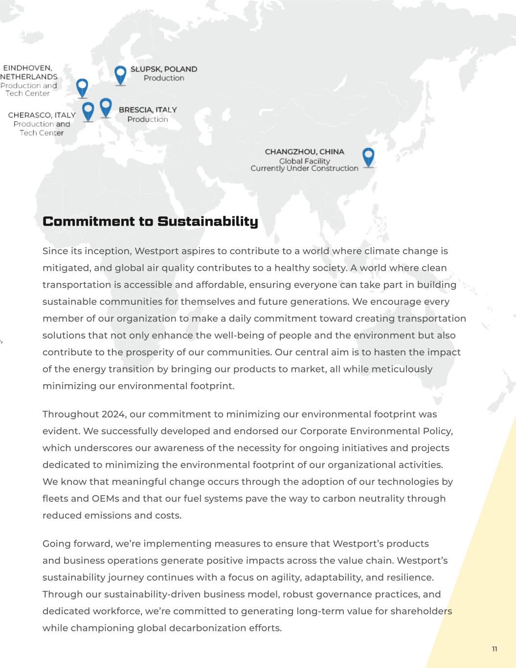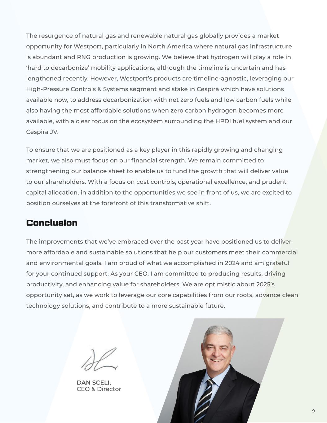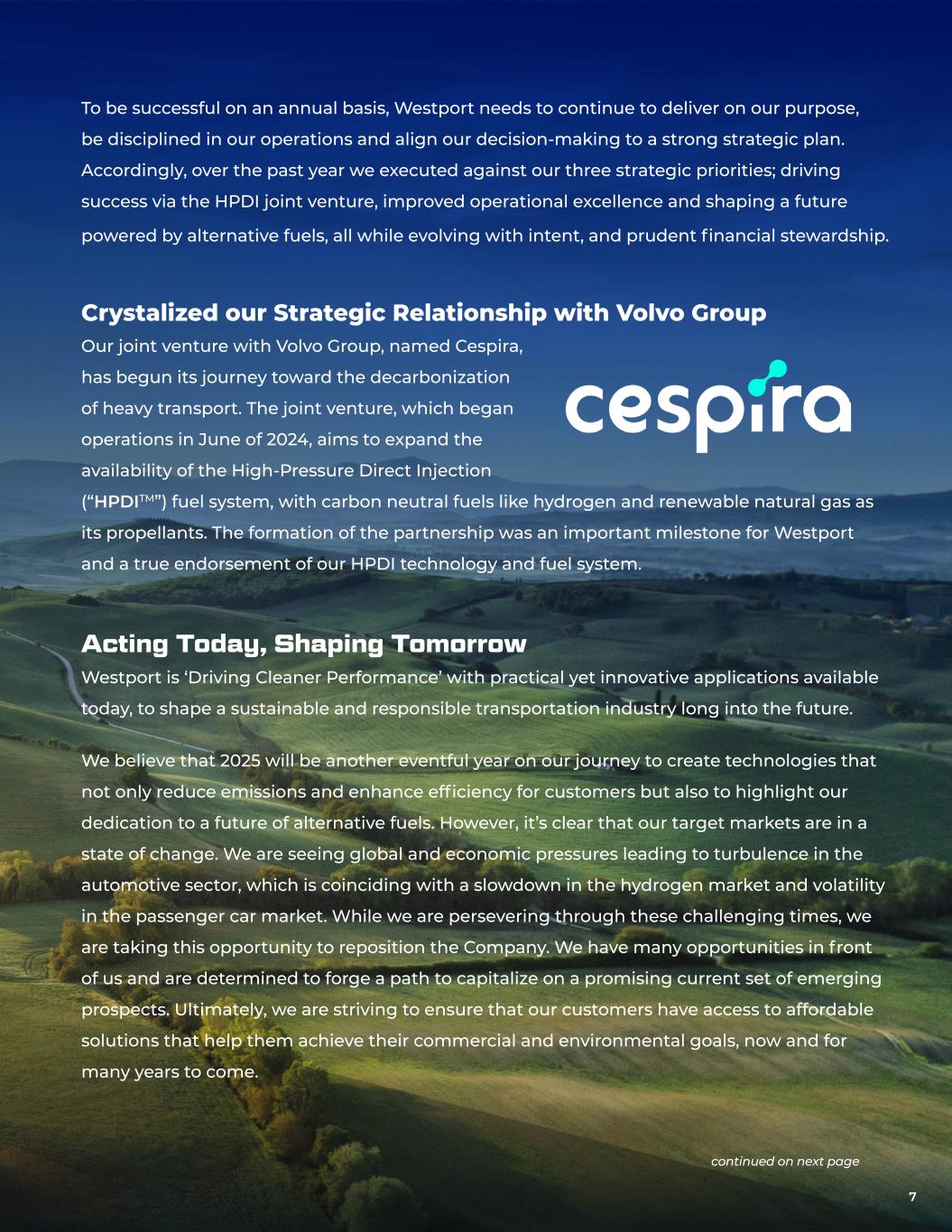 7 continued on next page To be successful on an annual basis, Westport needs to continue to deliver on our purpose, be disciplined in our operations and align our decision-making to a strong strategic plan. Accordingly, over the past year we executed against our three strategic priorities; driving success via the HPDI joint venture, improved operational excellence and shaping a future powered by alternative fuels, all while evolving with intent, and prudent financial stewardship. Crystalized our Strategic Relationship with Volvo Group Our joint venture with Volvo Group, named Cespira, has begun its journey toward the decarbonization of heavy transport. The joint venture, which began operations in June of 2024, aims to expand the availability of the High-Pressure Direct Injection (“HPDITM”) fuel system, with carbon neutral fuels like hydrogen and renewable natural gas as its propellants. The formation of the partnership was an important milestone for Westport and a true endorsement of our HPDI technology and fuel system. Acting Today, Shaping Tomorrow Westport is ‘Driving Cleaner Performance’ with practical yet innovative applications available today, to shape a sustainable and responsible transportation industry long into the future. We believe that 2025 will be another eventful year on our journey to create technologies that not only reduce emissions and enhance efficiency for customers but also to highlight our dedication to a future of alternative fuels. However, it’s clear that our target markets are in a state of change. We are seeing global and economic pressures leading to turbulence in the automotive sector, which is coinciding with a slowdown in the hydrogen market and volatility in the passenger car market. While we are persevering through these challenging times, we are taking this opportunity to reposition the Company. We have many opportunities in front of us and are determined to forge a path to capitalize on a promising current set of emerging prospects. Ultimately, we are striving to ensure that our customers have access to affordable solutions that help them achieve their commercial and environmental goals, now and for many years to come.