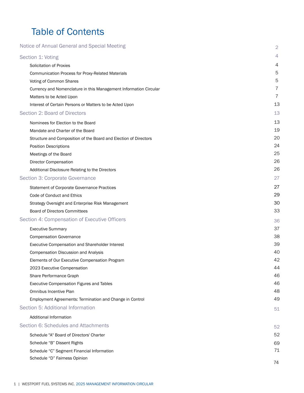 1 | WESTPORT FUEL SYSTEMS INC. 2025 MANAGEMENT INFORMATION CIRCULAR Table of Contents Notice of Annual General and Special Meeting 2 Section 1: Voting 4 Solicitation of Proxies 4 Communication Process for Proxy-Related Materials 5 Voting of Common Shares 5 Currency and Nomenclature in this Management Information Circular 7 Matters to be Acted Upon 7 Interest of Certain Persons or Matters to be Acted Upon 13 Section 2: Board of Directors 13 Nominees for Election to the Board 13 Mandate and Charter of the Board 19 Structure and Composition of the Board and Election of Directors 20 Position Descriptions 24 Meetings of the Board 25 Director Compensation 26 Additional Disclosure Relating to the Directors 26 Section 3: Corporate Governance 27 Statement of Corporate Governance Practices 27 Code of Conduct and Ethics 29 Strategy Oversight and Enterprise Risk Management 30 Board of Directors Committees 33 Section 4: Compensation of Executive Officers 36 Executive Summary 37 Compensation Governance 38 Executive Compensation and Shareholder Interest 39 Compensation Discussion and Analysis 40 Elements of Our Executive Compensation Program 42 2023 Executive Compensation 44 Share Performance Graph 46 Executive Compensation Figures and Tables 46 Omnibus Incentive Plan 48 Employment Agreements: Termination and Change in Control 49 Section 5: Additional Information 51 Additional Information Section 6: Schedules and Attachments 52 Schedule "A" Board of Directors' Charter 52 Schedule “B” Dissent Rights 69 Schedule “C” Segment Financial Information 71 Schedule “D” Fairness Opinion 74