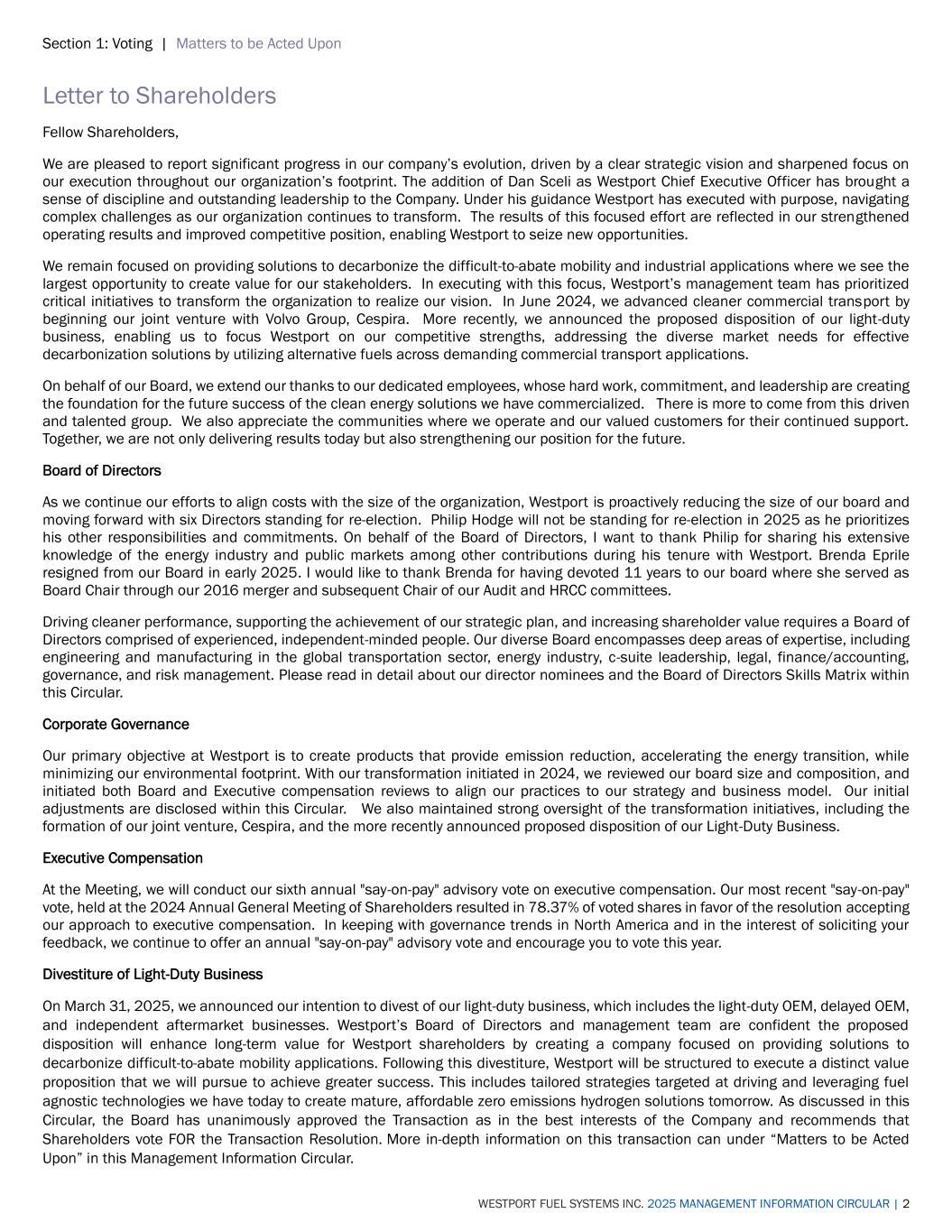 Section 1: Voting | Matters to be Acted Upon WESTPORT FUEL SYSTEMS INC. 2025 MANAGEMENT INFORMATION CIRCULAR | 2 Letter to Shareholders Fellow Shareholders, We are pleased to report significant progress in our company’s evolution, driven by a clear strategic vision and sharpened focus on our execution throughout our organization’s footprint. The addition of Dan Sceli as Westport Chief Executive Officer has brought a sense of discipline and outstanding leadership to the Company. Under his guidance Westport has executed with purpose, navigating complex challenges as our organization continues to transform. The results of this focused effort are reflected in our strengthened operating results and improved competitive position, enabling Westport to seize new opportunities. We remain focused on providing solutions to decarbonize the difficult-to-abate mobility and industrial applications where we see the largest opportunity to create value for our stakeholders. In executing with this focus, Westport’s management team has prioritized critical initiatives to transform the organization to realize our vision. In June 2024, we advanced cleaner commercial transport by beginning our joint venture with Volvo Group, Cespira. More recently, we announced the proposed disposition of our light-duty business, enabling us to focus Westport on our competitive strengths, addressing the diverse market needs for effective decarbonization solutions by utilizing alternative fuels across demanding commercial transport applications. On behalf of our Board, we extend our thanks to our dedicated employees, whose hard work, commitment, and leadership are creating the foundation for the future success of the clean energy solutions we have commercialized. There is more to come from this driven and talented group. We also appreciate the communities where we operate and our valued customers for their continued support. Together, we are not only delivering results today but also strengthening our position for the future. Board of Directors As we continue our efforts to align costs with the size of the organization, Westport is proactively reducing the size of our board and moving forward with six Directors standing for re-election. Philip Hodge will not be standing for re-election in 2025 as he prioritizes his other responsibilities and commitments. On behalf of the Board of Directors, I want to thank Philip for sharing his extensive knowledge of the energy industry and public markets among other contributions during his tenure with Westport. Brenda Eprile resigned from our Board in early 2025. I would like to thank Brenda for having devoted 11 years to our board where she served as Board Chair through our 2016 merger and subsequent Chair of our Audit and HRCC committees. Driving cleaner performance, supporting the achievement of our strategic plan, and increasing shareholder value requires a Board of Directors comprised of experienced, independent-minded people. Our diverse Board encompasses deep areas of expertise, including engineering and manufacturing in the global transportation sector, energy industry, c-suite leadership, legal, finance/accounting, governance, and risk management. Please read in detail about our director nominees and the Board of Directors Skills Matrix within this Circular. Corporate Governance Our primary objective at Westport is to create products that provide emission reduction, accelerating the energy transition, while minimizing our environmental footprint. With our transformation initiated in 2024, we reviewed our board size and composition, and initiated both Board and Executive compensation reviews to align our practices to our strategy and business model. Our initial adjustments are disclosed within this Circular. We also maintained strong oversight of the transformation initiatives, including the formation of our joint venture, Cespira, and the more recently announced proposed disposition of our Light-Duty Business. Executive Compensation At the Meeting, we will conduct our sixth annual "say-on-pay" advisory vote on executive compensation. Our most recent "say-on-pay" vote, held at the 2024 Annual General Meeting of Shareholders resulted in 78.37% of voted shares in favor of the resolution accepting our approach to executive compensation. In keeping with governance trends in North America and in the interest of soliciting your feedback, we continue to offer an annual "say-on-pay" advisory vote and encourage you to vote this year. Divestiture of Light-Duty Business On March 31, 2025, we announced our intention to divest of our light-duty business, which includes the light-duty OEM, delayed OEM, and independent aftermarket businesses. Westport’s Board of Directors and management team are confident the proposed disposition will enhance long-term value for Westport shareholders by creating a company focused on providing solutions to decarbonize difficult-to-abate mobility applications. Following this divestiture, Westport will be structured to execute a distinct value proposition that we will pursue to achieve greater success. This includes tailored strategies targeted at driving and leveraging fuel agnostic technologies we have today to create mature, affordable zero emissions hydrogen solutions tomorrow. As discussed in this Circular, the Board has unanimously approved the Transaction as in the best interests of the Company and recommends that Shareholders vote FOR the Transaction Resolution. More in-depth information on this transaction can under “Matters to be Acted Upon” in this Management Information Circular.