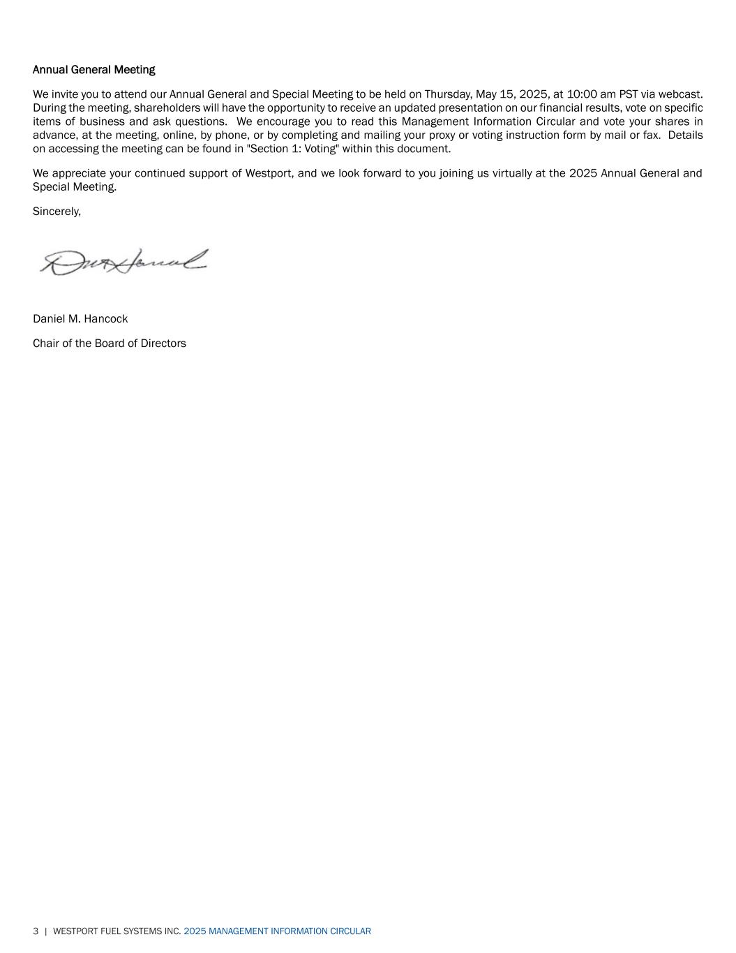 3 | WESTPORT FUEL SYSTEMS INC. 2025 MANAGEMENT INFORMATION CIRCULAR Annual General Meeting We invite you to attend our Annual General and Special Meeting to be held on Thursday, May 15, 2025, at 10:00 am PST via webcast. During the meeting, shareholders will have the opportunity to receive an updated presentation on our financial results, vote on specific items of business and ask questions. We encourage you to read this Management Information Circular and vote your shares in advance, at the meeting, online, by phone, or by completing and mailing your proxy or voting instruction form by mail or fax. Details on accessing the meeting can be found in "Section 1: Voting" within this document. We appreciate your continued support of Westport, and we look forward to you joining us virtually at the 2025 Annual General and Special Meeting. Sincerely, Daniel M. Hancock Chair of the Board of Directors