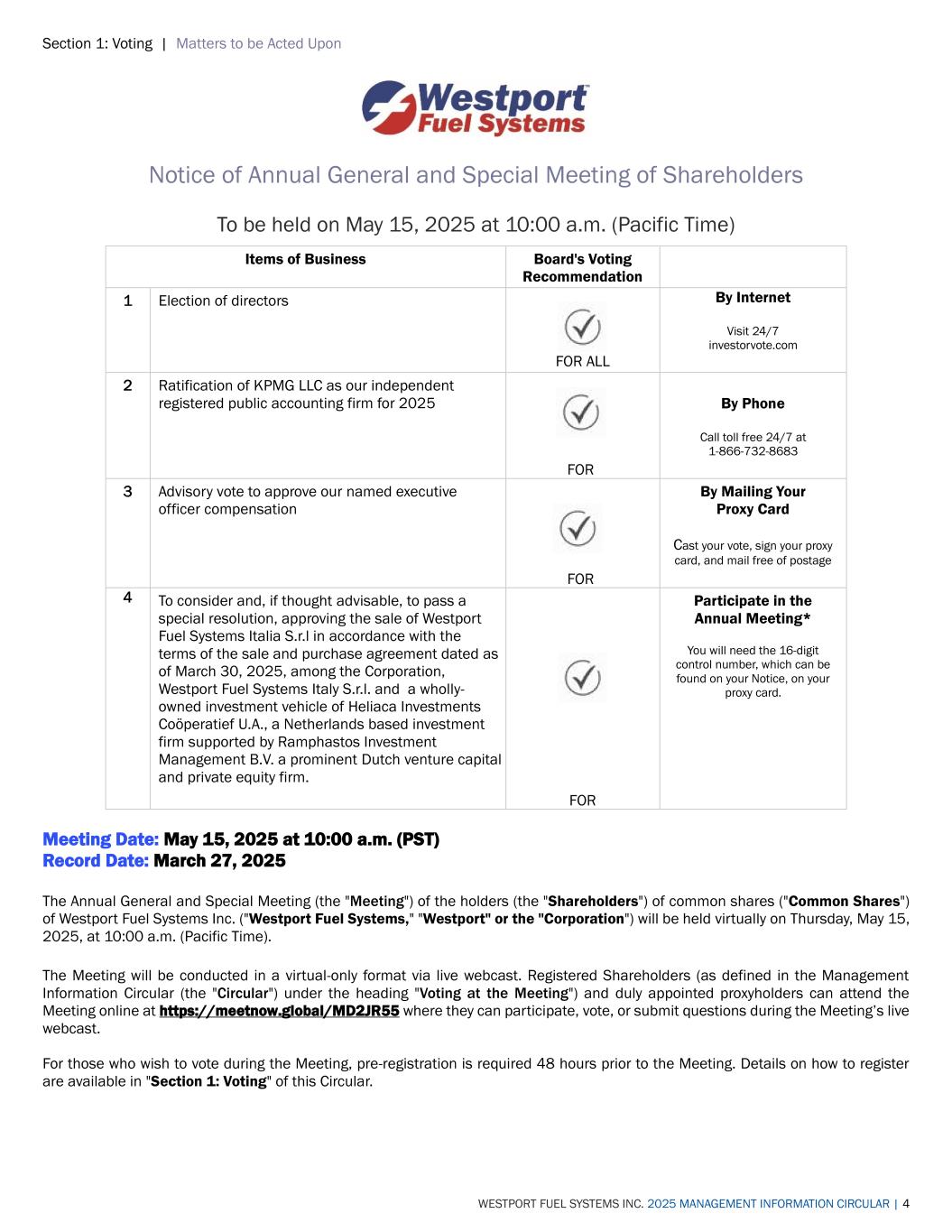 Section 1: Voting | Matters to be Acted Upon WESTPORT FUEL SYSTEMS INC. 2025 MANAGEMENT INFORMATION CIRCULAR | 4 Notice of Annual General and Special Meeting of Shareholders To be held on May 15, 2025 at 10:00 a.m. (Pacific Time) Items of Business Board's Voting Recommendation 1 Election of directors FOR ALL By Internet Visit 24/7 investorvote.com 2 Ratification of KPMG LLC as our independent registered public accounting firm for 2025 FOR By Phone Call toll free 24/7 at 1-866-732-8683 3 Advisory vote to approve our named executive officer compensation FOR By Mailing Your Proxy Card Cast your vote, sign your proxy card, and mail free of postage 4 To consider and, if thought advisable, to pass a special resolution, approving the sale of Westport Fuel Systems Italia S.r.l in accordance with the terms of the sale and purchase agreement dated as of March 30, 2025, among the Corporation, Westport Fuel Systems Italy S.r.l. and a wholly- owned investment vehicle of Heliaca Investments Coöperatief U.A., a Netherlands based investment firm supported by Ramphastos Investment Management B.V. a prominent Dutch venture capital and private equity firm. FOR Participate in the Annual Meeting* You will need the 16-digit control number, which can be found on your Notice, on your proxy card. Meeting Date: May 15, 2025 at 10:00 a.m. (PST) Record Date: March 27, 2025 The Annual General and Special Meeting (the "Meeting") of the holders (the "Shareholders") of common shares ("Common Shares") of Westport Fuel Systems Inc. ("Westport Fuel Systems," "Westport" or the "Corporation") will be held virtually on Thursday, May 15, 2025, at 10:00 a.m. (Pacific Time). The Meeting will be conducted in a virtual-only format via live webcast. Registered Shareholders (as defined in the Management Information Circular (the "Circular") under the heading "Voting at the Meeting") and duly appointed proxyholders can attend the Meeting online at https://meetnow.global/MD2JR55 where they can participate, vote, or submit questions during the Meeting’s live webcast. For those who wish to vote during the Meeting, pre-registration is required 48 hours prior to the Meeting. Details on how to register are available in "Section 1: Voting" of this Circular.