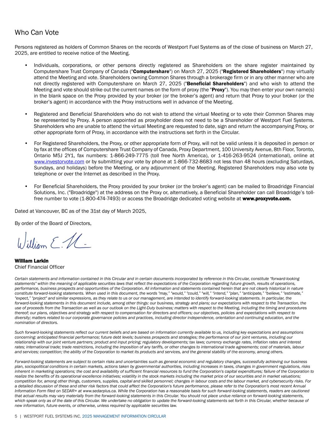 5 | WESTPORT FUEL SYSTEMS INC. 2025 MANAGEMENT INFORMATION CIRCULAR Who Can Vote Persons registered as holders of Common Shares on the records of Westport Fuel Systems as of the close of business on March 27, 2025, are entitled to receive notice of the Meeting. • Individuals, corporations, or other persons directly registered as Shareholders on the share register maintained by Computershare Trust Company of Canada ("Computershare") on March 27, 2025 ("Registered Shareholders") may virtually attend the Meeting and vote. Shareholders owning Common Shares through a brokerage firm or in any other manner who are not directly registered with Computershare on March 27, 2025 ("Beneficial Shareholders") and who wish to attend the Meeting and vote should strike out the current names on the form of proxy (the "Proxy"). You may then enter your own name(s) in the blank space on the Proxy provided by your broker (or the broker’s agent) and return that Proxy to your broker (or the broker’s agent) in accordance with the Proxy instructions well in advance of the Meeting. • Registered and Beneficial Shareholders who do not wish to attend the virtual Meeting or to vote their Common Shares may be represented by Proxy. A person appointed as proxyholder does not need to be a Shareholder of Westport Fuel Systems. Shareholders who are unable to attend the virtual Meeting are requested to date, sign and return the accompanying Proxy, or other appropriate form of Proxy, in accordance with the instructions set forth in the Circular. • For Registered Shareholders, the Proxy, or other appropriate form of Proxy, will not be valid unless it is deposited in person or by fax at the offices of Computershare Trust Company of Canada, Proxy Department, 100 University Avenue, 8th Floor, Toronto, Ontario M5J 2Y1, fax numbers: 1-866-249-7775 (toll free North America), or 1-416-263-9524 (international), online at www.investorvote.com or by submitting your vote by phone at 1-866-732-8683 not less than 48 hours (excluding Saturdays, Sundays, and holidays) before the Meeting, or any adjournment of the Meeting. Registered Shareholders may also vote by telephone or over the Internet as described in the Proxy. • For Beneficial Shareholders, the Proxy provided by your broker (or the broker’s agent) can be mailed to Broadridge Financial Solutions, Inc. ("Broadridge") at the address on the Proxy or, alternatively, a Beneficial Shareholder can call Broadridge’s toll- free number to vote (1-800-474-7493) or access the Broadridge dedicated voting website at www.proxyvote.com. Dated at Vancouver, BC as of the 31st day of March 2025, By order of the Board of Directors, William Larkin Chief Financial Officer Certain statements and information contained in this Circular and in certain documents incorporated by reference in this Circular, constitute "forward-looking statements" within the meaning of applicable securities laws that reflect the expectations of the Corporation regarding future growth, results of operations, performance, business prospects and opportunities of the Corporation. All information and statements contained herein that are not clearly historical in nature constitute forward-looking statements. When used in this document, the words "may,” "would,” "could,” "will,” "intend,” "plan,” "anticipate,” "believe,” "estimate,” "expect,” "project" and similar expressions, as they relate to us or our management, are intended to identify forward-looking statements. In particular, the forward-looking statements in this document include, among other things: our business, strategy and plans; our expectations with respect to the Transaction, the use of proceeds from the Transaction as well as our outlook on the Light-Duty business; matters with respect to the Meeting, including the timing and procedures thereof; our plans, objectives and strategy with respect to compensation for directors and officers; our objectives, policies and expectations with respect to diversity; matters related to our corporate governance policies and practices, including director independence, orientation and continuing education, and the nomination of directors. Such forward-looking statements reflect our current beliefs and are based on information currently available to us, including key expectations and assumptions concerning: anticipated financial performance; future debt levels; business prospects and strategies; the performance of our joint ventures, including our relationship with our joint venture partners; product and input pricing; regulatory developments; tax laws; currency exchange rates, inflation rates and interest rates; international trade; trade restrictions, including the imposition of any tariffs, or other changes to international trade agreements; cost of materials, labour and services; competition; the ability of the Corporation to market its products and services, and the general stability of the economy, among others. Forward-looking statements are subject to certain risks and uncertainties such as general economic and regulatory changes, successfully achieving our business plan, sociopolitical conditions in certain markets, actions taken by governmental authorities, including increases in taxes, changes in government regulations, risks inherent in marketing operations; the cost and availability of sufficient financial resources to fund the Corporation's capital expenditures; failure of the Corporation to realize the benefits of its operational excellence initiatives; volatility in the stock markets including the market price of our securities and in market valuations; competition for, among other things, customers, supplies, capital and skilled personnel; changes in labour costs and the labour market, and cybersecurity risks. For a detailed discussion of these and other risk factors that could affect the Corporation's future performance, please refer to the Corporation's most recent Annual Information F