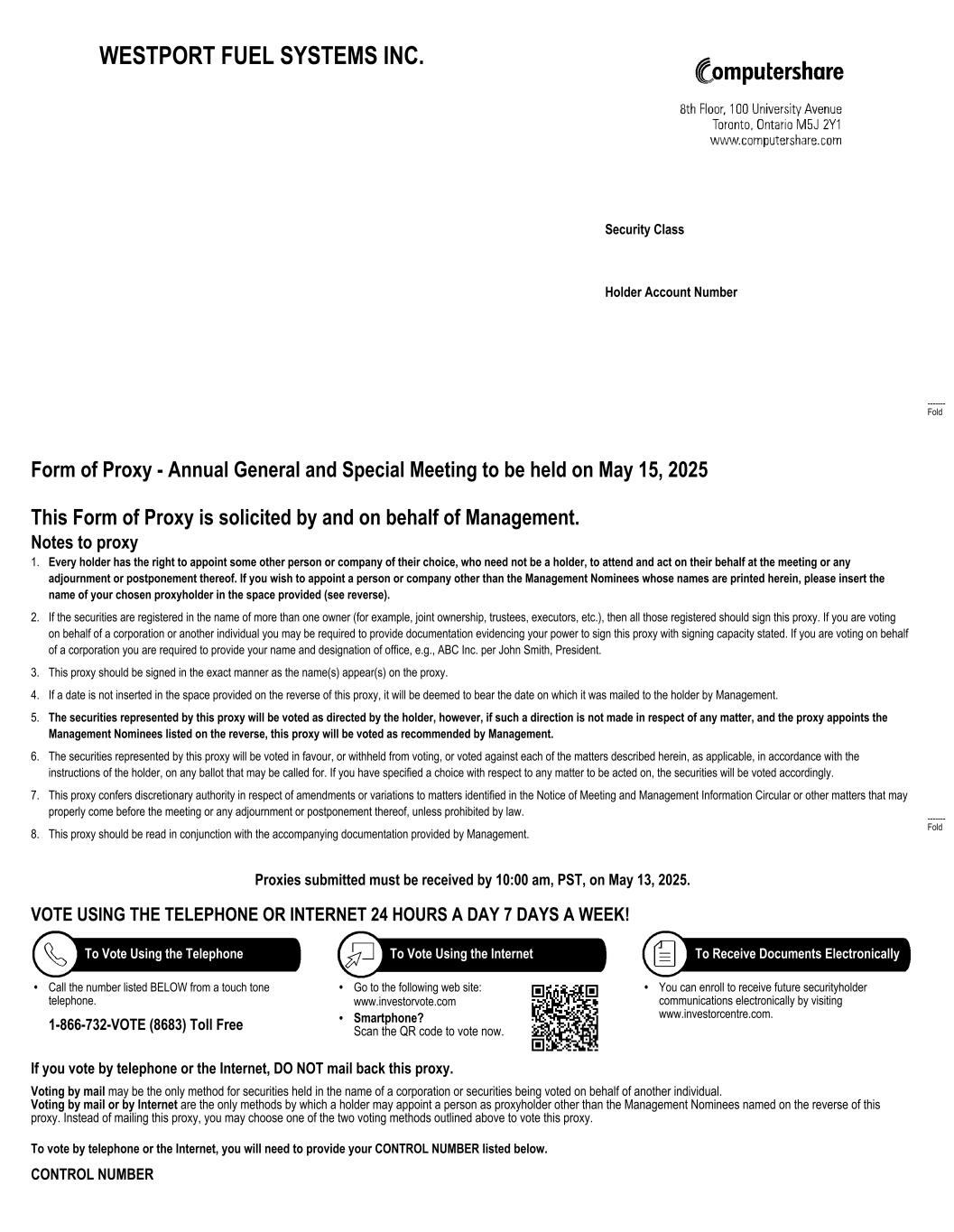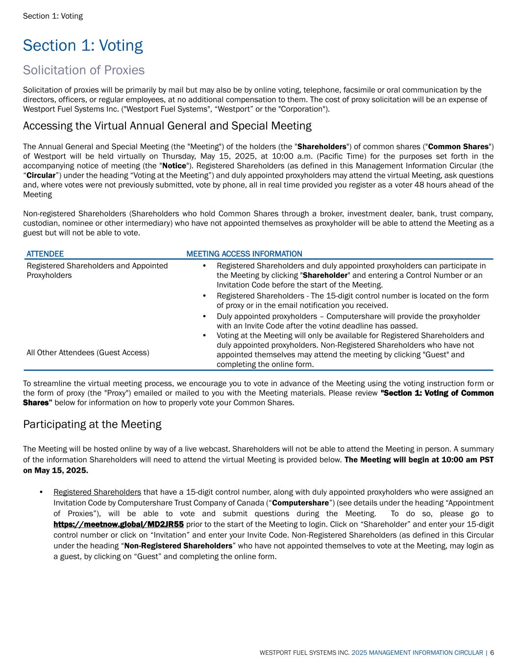 Section 1: Voting WESTPORT FUEL SYSTEMS INC. 2025 MANAGEMENT INFORMATION CIRCULAR | 6 Section 1: Voting Solicitation of Proxies Solicitation of proxies will be primarily by mail but may also be by online voting, telephone, facsimile or oral communication by the directors, officers, or regular employees, at no additional compensation to them. The cost of proxy solicitation will be an expense of Westport Fuel Systems Inc. ("Westport Fuel Systems", “Westport” or the "Corporation"). Accessing the Virtual Annual General and Special Meeting The Annual General and Special Meeting (the "Meeting") of the holders (the "Shareholders") of common shares ("Common Shares") of Westport will be held virtually on Thursday, May 15, 2025, at 10:00 a.m. (Pacific Time) for the purposes set forth in the accompanying notice of meeting (the "Notice"). Registered Shareholders (as defined in this Management Information Circular (the “Circular”) under the heading “Voting at the Meeting”) and duly appointed proxyholders may attend the virtual Meeting, ask questions and, where votes were not previously submitted, vote by phone, all in real time provided you register as a voter 48 hours ahead of the Meeting Non-registered Shareholders (Shareholders who hold Common Shares through a broker, investment dealer, bank, trust company, custodian, nominee or other intermediary) who have not appointed themselves as proxyholder will be able to attend the Meeting as a guest but will not be able to vote. ATTENDEE MEETING ACCESS INFORMATION Registered Shareholders and Appointed Proxyholders • Registered Shareholders and duly appointed proxyholders can participate in the Meeting by clicking "Shareholder" and entering a Control Number or an Invitation Code before the start of the Meeting. • Registered Shareholders - The 15-digit control number is located on the form of proxy or in the email notification you received. • Duly appointed proxyholders – Computershare will provide the proxyholder with an Invite Code after the voting deadline has passed. All Other Attendees (Guest Access) • Voting at the Meeting will only be available for Registered Shareholders and duly appointed proxyholders. Non-Registered Shareholders who have not appointed themselves may attend the meeting by clicking "Guest" and completing the online form. To streamline the virtual meeting process, we encourage you to vote in advance of the Meeting using the voting instruction form or the form of proxy (the "Proxy") emailed or mailed to you with the Meeting materials. Please review "Section 1: Voting of Common Shares” below for information on how to properly vote your Common Shares. Participating at the Meeting The Meeting will be hosted online by way of a live webcast. Shareholders will not be able to attend the Meeting in person. A summary of the information Shareholders will need to attend the virtual Meeting is provided below. The Meeting will begin at 10:00 am PST on May 15, 2025. • Registered Shareholders that have a 15-digit control number, along with duly appointed proxyholders who were assigned an Invitation Code by Computershare Trust Company of Canada (“Computershare”) (see details under the heading “Appointment of Proxies”), will be able to vote and submit questions during the Meeting. To do so, please go to https://meetnow.global/MD2JR55 prior to the start of the Meeting to login. Click on “Shareholder” and enter your 15-digit control number or click on “Invitation” and enter your Invite Code. Non-Registered Shareholders (as defined in this Circular under the heading “Non-Registered Shareholders” who have not appointed themselves to vote at the Meeting, may login as a guest, by clicking on “Guest” and completing the online form.