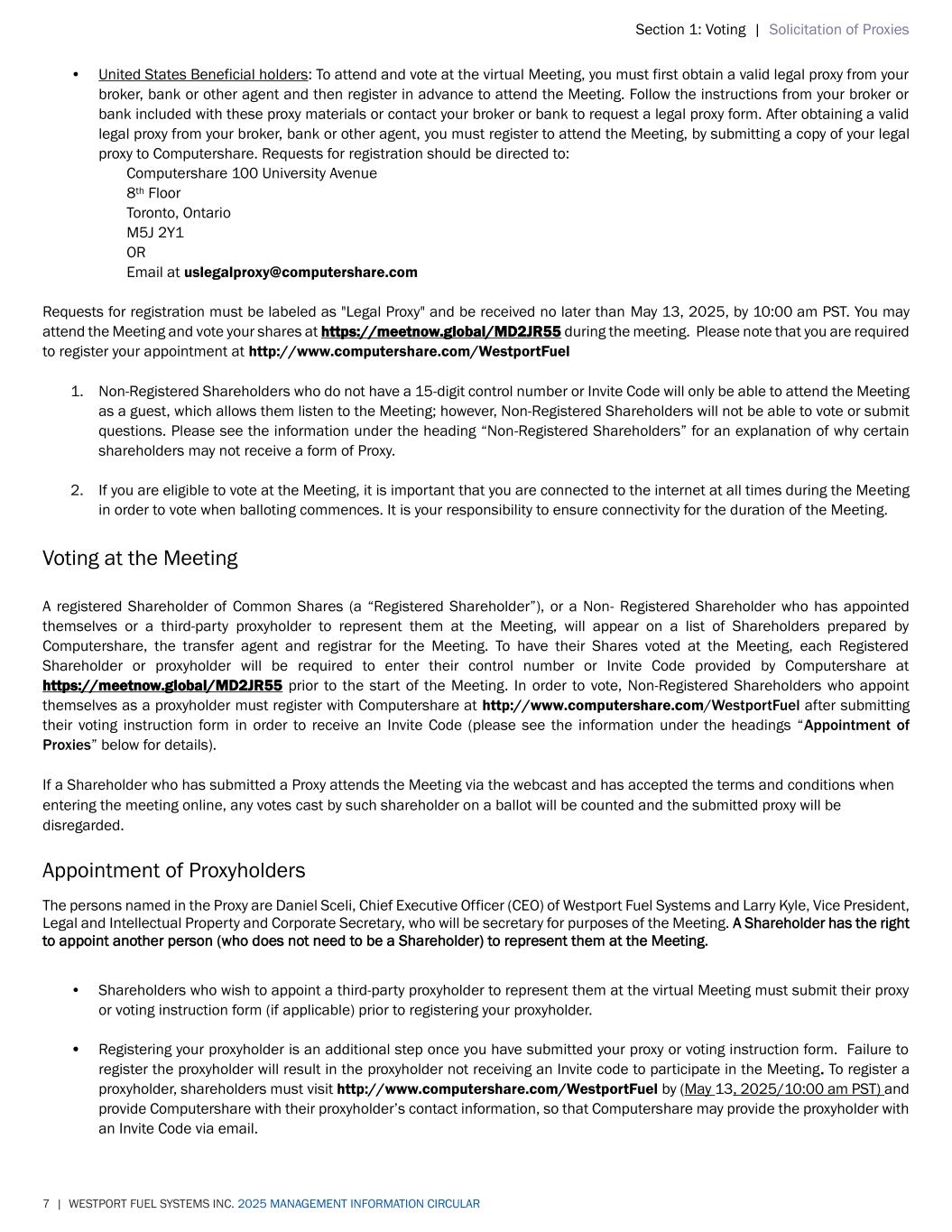 Section 1: Voting | Solicitation of Proxies 7 | WESTPORT FUEL SYSTEMS INC. 2025 MANAGEMENT INFORMATION CIRCULAR • United States Beneficial holders: To attend and vote at the virtual Meeting, you must first obtain a valid legal proxy from your broker, bank or other agent and then register in advance to attend the Meeting. Follow the instructions from your broker or bank included with these proxy materials or contact your broker or bank to request a legal proxy form. After obtaining a valid legal proxy from your broker, bank or other agent, you must register to attend the Meeting, by submitting a copy of your legal proxy to Computershare. Requests for registration should be directed to: Computershare 100 University Avenue 8th Floor Toronto, Ontario M5J 2Y1 OR Email at uslegalproxy@computershare.com Requests for registration must be labeled as "Legal Proxy" and be received no later than May 13, 2025, by 10:00 am PST. You may attend the Meeting and vote your shares at https://meetnow.global/MD2JR55 during the meeting. Please note that you are required to register your appointment at http://www.computershare.com/WestportFuel 1. Non-Registered Shareholders who do not have a 15-digit control number or Invite Code will only be able to attend the Meeting as a guest, which allows them listen to the Meeting; however, Non-Registered Shareholders will not be able to vote or submit questions. Please see the information under the heading “Non-Registered Shareholders” for an explanation of why certain shareholders may not receive a form of Proxy. 2. If you are eligible to vote at the Meeting, it is important that you are connected to the internet at all times during the Meeting in order to vote when balloting commences. It is your responsibility to ensure connectivity for the duration of the Meeting. Voting at the Meeting A registered Shareholder of Common Shares (a “Registered Shareholder”), or a Non- Registered Shareholder who has appointed themselves or a third-party proxyholder to represent them at the Meeting, will appear on a list of Shareholders prepared by Computershare, the transfer agent and registrar for the Meeting. To have their Shares voted at the Meeting, each Registered Shareholder or proxyholder will be required to enter their control number or Invite Code provided by Computershare at https://meetnow.global/MD2JR55 prior to the start of the Meeting. In order to vote, Non-Registered Shareholders who appoint themselves as a proxyholder must register with Computershare at http://www.computershare.com/WestportFuel after submitting their voting instruction form in order to receive an Invite Code (please see the information under the headings “Appointment of Proxies” below for details). If a Shareholder who has submitted a Proxy attends the Meeting via the webcast and has accepted the terms and conditions when entering the meeting online, any votes cast by such shareholder on a ballot will be counted and the submitted proxy will be disregarded. Appointment of Proxyholders The persons named in the Proxy are Daniel Sceli, Chief Executive Officer (CEO) of Westport Fuel Systems and Larry Kyle, Vice President, Legal and Intellectual Property and Corporate Secretary, who will be secretary for purposes of the Meeting. A Shareholder has the right to appoint another person (who does not need to be a Shareholder) to represent them at the Meeting. • Shareholders who wish to appoint a third-party proxyholder to represent them at the virtual Meeting must submit their proxy or voting instruction form (if applicable) prior to registering your proxyholder. • Registering your proxyholder is an additional step once you have submitted your proxy or voting instruction form. Failure to register the proxyholder will result in the proxyholder not receiving an Invite code to participate in the Meeting. To register a proxyholder, shareholders must visit http://www.computershare.com/WestportFuel by (May 13, 2025/10:00 am PST) and provide Computershare with their proxyholder’s contact information, so that Computershare may provide the proxyholder with an Invite Code via email.