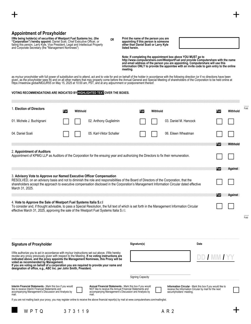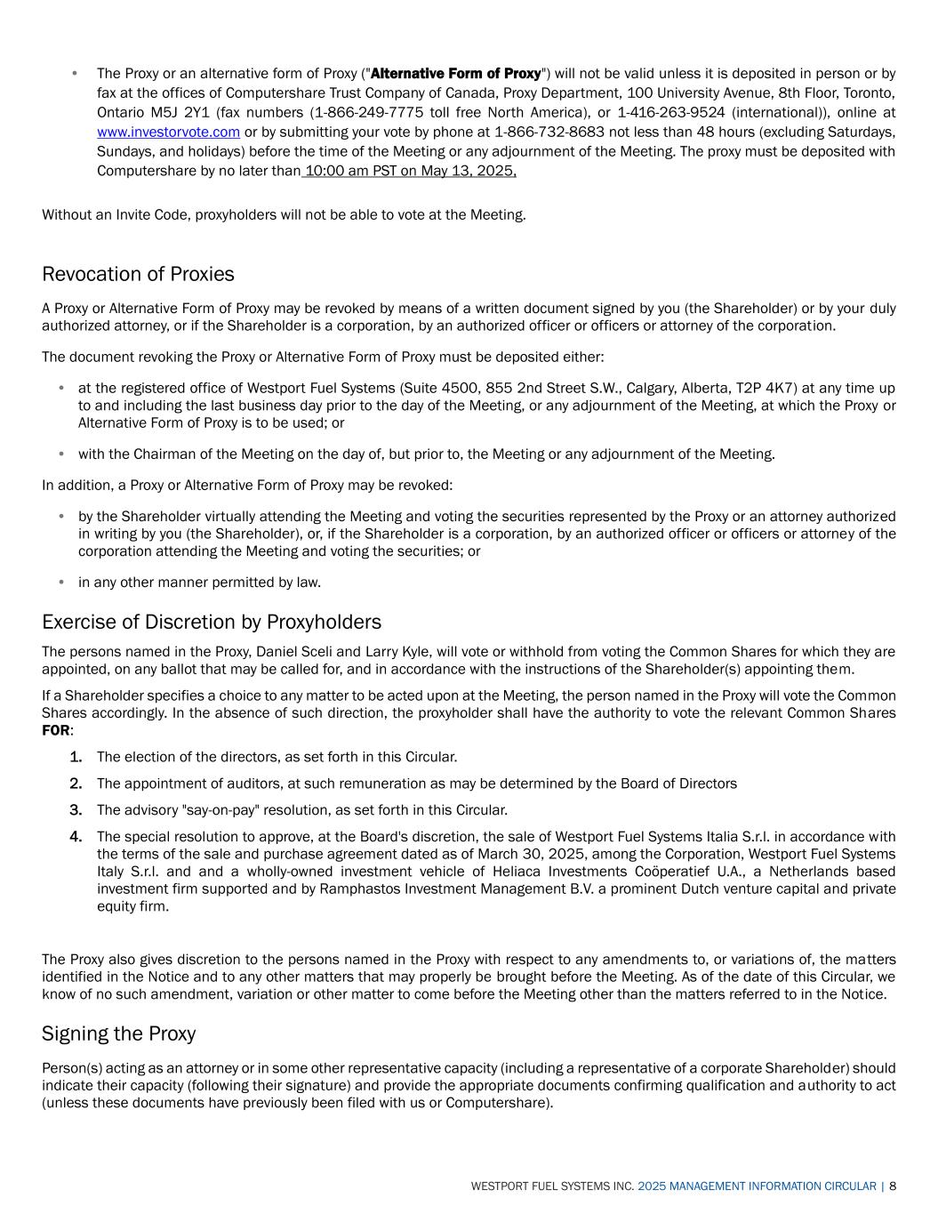 WESTPORT FUEL SYSTEMS INC. 2025 MANAGEMENT INFORMATION CIRCULAR | 8 • The Proxy or an alternative form of Proxy ("Alternative Form of Proxy") will not be valid unless it is deposited in person or by fax at the offices of Computershare Trust Company of Canada, Proxy Department, 100 University Avenue, 8th Floor, Toronto, Ontario M5J 2Y1 (fax numbers (1-866-249-7775 toll free North America), or 1-416-263-9524 (international)), online at www.investorvote.com or by submitting your vote by phone at 1-866-732-8683 not less than 48 hours (excluding Saturdays, Sundays, and holidays) before the time of the Meeting or any adjournment of the Meeting. The proxy must be deposited with Computershare by no later than 10:00 am PST on May 13, 2025, Without an Invite Code, proxyholders will not be able to vote at the Meeting. Revocation of Proxies A Proxy or Alternative Form of Proxy may be revoked by means of a written document signed by you (the Shareholder) or by your duly authorized attorney, or if the Shareholder is a corporation, by an authorized officer or officers or attorney of the corporation. The document revoking the Proxy or Alternative Form of Proxy must be deposited either: • at the registered office of Westport Fuel Systems (Suite 4500, 855 2nd Street S.W., Calgary, Alberta, T2P 4K7) at any time up to and including the last business day prior to the day of the Meeting, or any adjournment of the Meeting, at which the Proxy or Alternative Form of Proxy is to be used; or • with the Chairman of the Meeting on the day of, but prior to, the Meeting or any adjournment of the Meeting. In addition, a Proxy or Alternative Form of Proxy may be revoked: • by the Shareholder virtually attending the Meeting and voting the securities represented by the Proxy or an attorney authorized in writing by you (the Shareholder), or, if the Shareholder is a corporation, by an authorized officer or officers or attorney of the corporation attending the Meeting and voting the securities; or • in any other manner permitted by law. Exercise of Discretion by Proxyholders The persons named in the Proxy, Daniel Sceli and Larry Kyle, will vote or withhold from voting the Common Shares for which they are appointed, on any ballot that may be called for, and in accordance with the instructions of the Shareholder(s) appointing them. If a Shareholder specifies a choice to any matter to be acted upon at the Meeting, the person named in the Proxy will vote the Common Shares accordingly. In the absence of such direction, the proxyholder shall have the authority to vote the relevant Common Shares FOR: 1. The election of the directors, as set forth in this Circular. 2. The appointment of auditors, at such remuneration as may be determined by the Board of Directors 3. The advisory "say-on-pay" resolution, as set forth in this Circular. 4. The special resolution to approve, at the Board's discretion, the sale of Westport Fuel Systems Italia S.r.l. in accordance with the terms of the sale and purchase agreement dated as of March 30, 2025, among the Corporation, Westport Fuel Systems Italy S.r.l. and and a wholly-owned investment vehicle of Heliaca Investments Coöperatief U.A., a Netherlands based investment firm supported and by Ramphastos Investment Management B.V. a prominent Dutch venture capital and private equity firm. The Proxy also gives discretion to the persons named in the Proxy with respect to any amendments to, or variations of, the matters identified in the Notice and to any other matters that may properly be brought before the Meeting. As of the date of this Circular, we know of no such amendment, variation or other matter to come before the Meeting other than the matters referred to in the Notice. Signing the Proxy Person(s) acting as an attorney or in some other representative capacity (including a representative of a corporate Shareholder) should indicate their capacity (following their signature) and provide the appropriate documents confirming qualification and authority to act (unless these documents have previously been filed with us or Computershare).