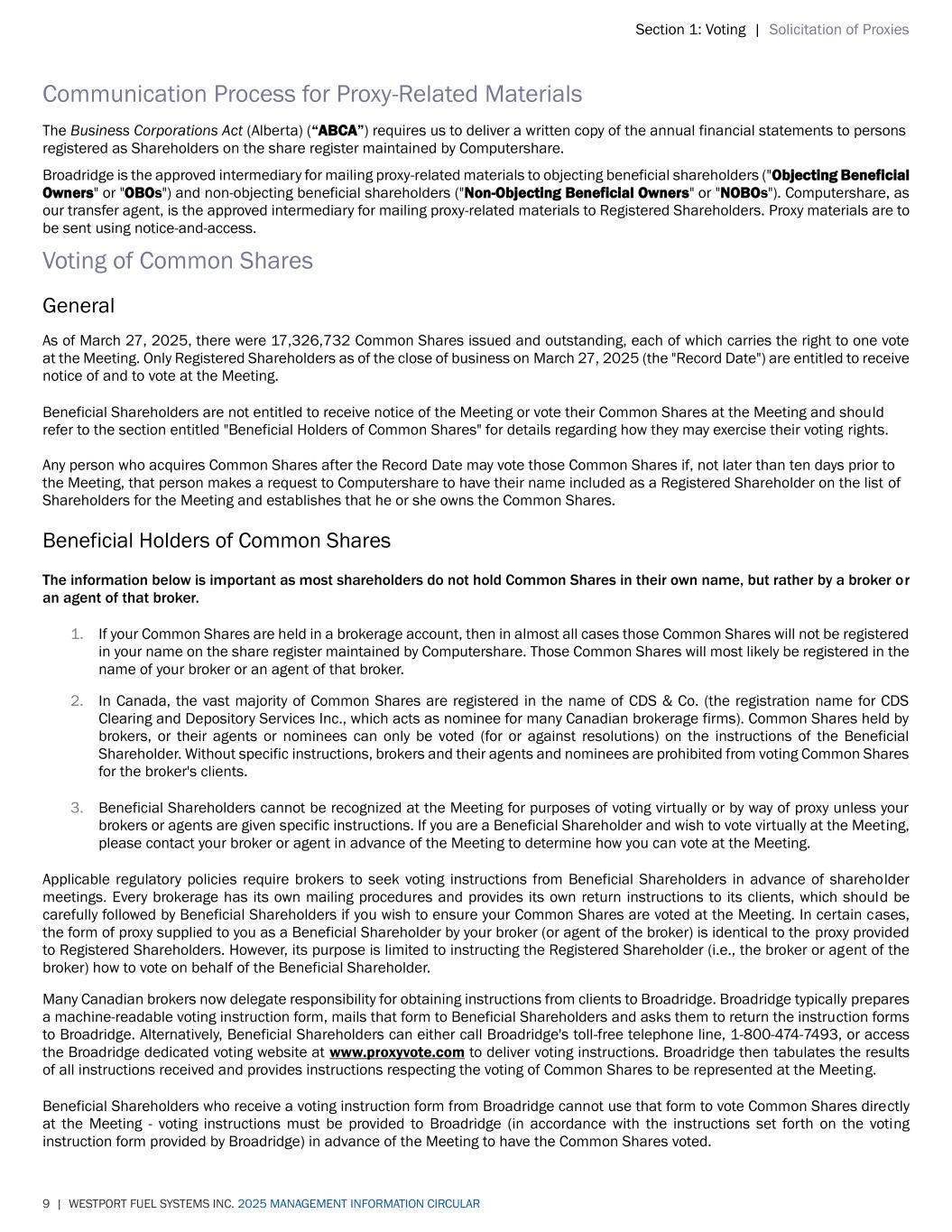 Section 1: Voting | Solicitation of Proxies 9 | WESTPORT FUEL SYSTEMS INC. 2025 MANAGEMENT INFORMATION CIRCULAR Communication Process for Proxy-Related Materials The Business Corporations Act (Alberta) (“ABCA”) requires us to deliver a written copy of the annual financial statements to persons registered as Shareholders on the share register maintained by Computershare. Broadridge is the approved intermediary for mailing proxy-related materials to objecting beneficial shareholders ("Objecting Beneficial Owners" or "OBOs") and non-objecting beneficial shareholders ("Non-Objecting Beneficial Owners" or "NOBOs"). Computershare, as our transfer agent, is the approved intermediary for mailing proxy-related materials to Registered Shareholders. Proxy materials are to be sent using notice-and-access. Voting of Common Shares General As of March 27, 2025, there were 17,326,732 Common Shares issued and outstanding, each of which carries the right to one vote at the Meeting. Only Registered Shareholders as of the close of business on March 27, 2025 (the "Record Date") are entitled to receive notice of and to vote at the Meeting. Beneficial Shareholders are not entitled to receive notice of the Meeting or vote their Common Shares at the Meeting and should refer to the section entitled "Beneficial Holders of Common Shares" for details regarding how they may exercise their voting rights. Any person who acquires Common Shares after the Record Date may vote those Common Shares if, not later than ten days prior to the Meeting, that person makes a request to Computershare to have their name included as a Registered Shareholder on the list of Shareholders for the Meeting and establishes that he or she owns the Common Shares. Beneficial Holders of Common Shares The information below is important as most shareholders do not hold Common Shares in their own name, but rather by a broker or an agent of that broker. 1. If your Common Shares are held in a brokerage account, then in almost all cases those Common Shares will not be registered in your name on the share register maintained by Computershare. Those Common Shares will most likely be registered in the name of your broker or an agent of that broker. 2. In Canada, the vast majority of Common Shares are registered in the name of CDS & Co. (the registration name for CDS Clearing and Depository Services Inc., which acts as nominee for many Canadian brokerage firms). Common Shares held by brokers, or their agents or nominees can only be voted (for or against resolutions) on the instructions of the Beneficial Shareholder. Without specific instructions, brokers and their agents and nominees are prohibited from voting Common Shares for the broker's clients. 3. Beneficial Shareholders cannot be recognized at the Meeting for purposes of voting virtually or by way of proxy unless your brokers or agents are given specific instructions. If you are a Beneficial Shareholder and wish to vote virtually at the Meeting, please contact your broker or agent in advance of the Meeting to determine how you can vote at the Meeting. Applicable regulatory policies require brokers to seek voting instructions from Beneficial Shareholders in advance of shareholder meetings. Every brokerage has its own mailing procedures and provides its own return instructions to its clients, which should be carefully followed by Beneficial Shareholders if you wish to ensure your Common Shares are voted at the Meeting. In certain cases, the form of proxy supplied to you as a Beneficial Shareholder by your broker (or agent of the broker) is identical to the proxy provided to Registered Shareholders. However, its purpose is limited to instructing the Registered Shareholder (i.e., the broker or agent of the broker) how to vote on behalf of the Beneficial Shareholder. Many Canadian brokers now delegate responsibility for obtaining instructions from clients to Broadridge. Broadridge typically prepares a machine-readable voting instruction form, mails that form to Beneficial Shareholders and asks them to return the instruction forms to Broadridge. Alternatively, Beneficial Shareholders can either call Broadridge's toll-free telephone line, 1-800-474-7493, or access the Broadridge dedicated voting website at www.proxyvote.com to deliver voting instructions. Broadridge then tabulates the results of all instructions received and provides instructions respecting the voting of Common Shares to be represented at the Meeting. Beneficial Shareholders who receive a voting instruction form from Broadridge cannot use that form to vote Common Shares directly at the Meeting - voting instructions must be provided to Broadridge (in accordance with the instructions set forth on the voting instruction form provided by Broadridge) in advance of the Meeting to have the Common Shares voted.