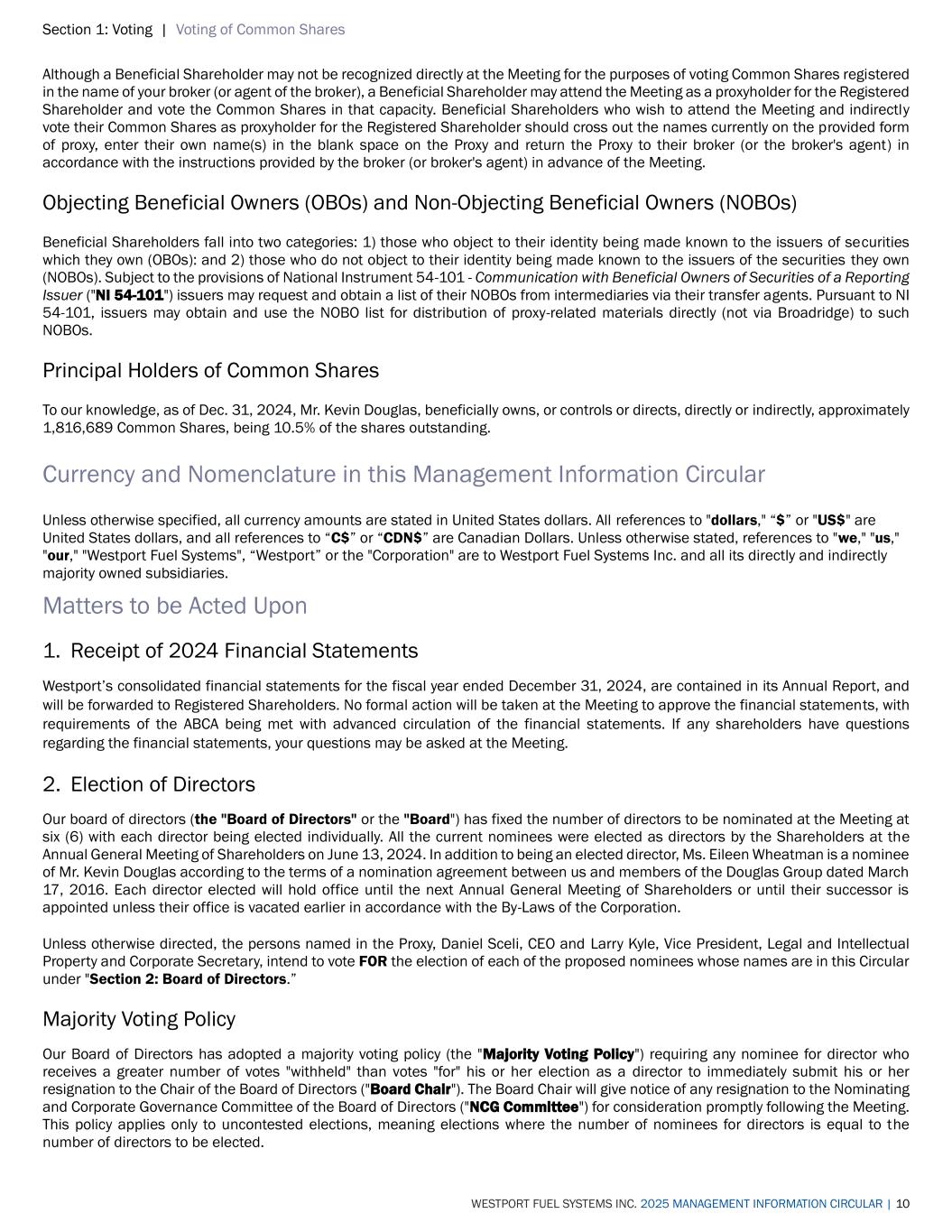 Section 1: Voting | Voting of Common Shares WESTPORT FUEL SYSTEMS INC. 2025 MANAGEMENT INFORMATION CIRCULAR | 10 Although a Beneficial Shareholder may not be recognized directly at the Meeting for the purposes of voting Common Shares registered in the name of your broker (or agent of the broker), a Beneficial Shareholder may attend the Meeting as a proxyholder for the Registered Shareholder and vote the Common Shares in that capacity. Beneficial Shareholders who wish to attend the Meeting and indirectly vote their Common Shares as proxyholder for the Registered Shareholder should cross out the names currently on the provided form of proxy, enter their own name(s) in the blank space on the Proxy and return the Proxy to their broker (or the broker's agent) in accordance with the instructions provided by the broker (or broker's agent) in advance of the Meeting. Objecting Beneficial Owners (OBOs) and Non-Objecting Beneficial Owners (NOBOs) Beneficial Shareholders fall into two categories: 1) those who object to their identity being made known to the issuers of securities which they own (OBOs): and 2) those who do not object to their identity being made known to the issuers of the securities they own (NOBOs). Subject to the provisions of National Instrument 54-101 - Communication with Beneficial Owners of Securities of a Reporting Issuer ("NI 54-101") issuers may request and obtain a list of their NOBOs from intermediaries via their transfer agents. Pursuant to NI 54-101, issuers may obtain and use the NOBO list for distribution of proxy-related materials directly (not via Broadridge) to such NOBOs. Principal Holders of Common Shares To our knowledge, as of Dec. 31, 2024, Mr. Kevin Douglas, beneficially owns, or controls or directs, directly or indirectly, approximately 1,816,689 Common Shares, being 10.5% of the shares outstanding. Currency and Nomenclature in this Management Information Circular Unless otherwise specified, all currency amounts are stated in United States dollars. All references to "dollars," “$” or "US$" are United States dollars, and all references to “C$” or “CDN$” are Canadian Dollars. Unless otherwise stated, references to "we," "us," "our," "Westport Fuel Systems", “Westport” or the "Corporation" are to Westport Fuel Systems Inc. and all its directly and indirectly majority owned subsidiaries. Matters to be Acted Upon 1. Receipt of 2024 Financial Statements Westport’s consolidated financial statements for the fiscal year ended December 31, 2024, are contained in its Annual Report, and will be forwarded to Registered Shareholders. No formal action will be taken at the Meeting to approve the financial statements, with requirements of the ABCA being met with advanced circulation of the financial statements. If any shareholders have questions regarding the financial statements, your questions may be asked at the Meeting. 2. Election of Directors Our board of directors (the "Board of Directors" or the "Board") has fixed the number of directors to be nominated at the Meeting at six (6) with each director being elected individually. All the current nominees were elected as directors by the Shareholders at the Annual General Meeting of Shareholders on June 13, 2024. In addition to being an elected director, Ms. Eileen Wheatman is a nominee of Mr. Kevin Douglas according to the terms of a nomination agreement between us and members of the Douglas Group dated March 17, 2016. Each director elected will hold office until the next Annual General Meeting of Shareholders or until their successor is appointed unless their office is vacated earlier in accordance with the By-Laws of the Corporation. Unless otherwise directed, the persons named in the Proxy, Daniel Sceli, CEO and Larry Kyle, Vice President, Legal and Intellectual Property and Corporate Secretary, intend to vote FOR the election of each of the proposed nominees whose names are in this Circular under "Section 2: Board of Directors.” Majority Voting Policy Our Board of Directors has adopted a majority voting policy (the "Majority Voting Policy") requiring any nominee for director who receives a greater number of votes "withheld" than votes "for" his or her election as a director to immediately submit his or her resignation to the Chair of the Board of Directors ("Board Chair"). The Board Chair will give notice of any resignation to the Nominating and Corporate Governance Committee of the Board of Directors ("NCG Committee") for consideration promptly following the Meeting. This policy applies only to uncontested elections, meaning elections where the number of nominees for directors is equal to the number of directors to be elected.