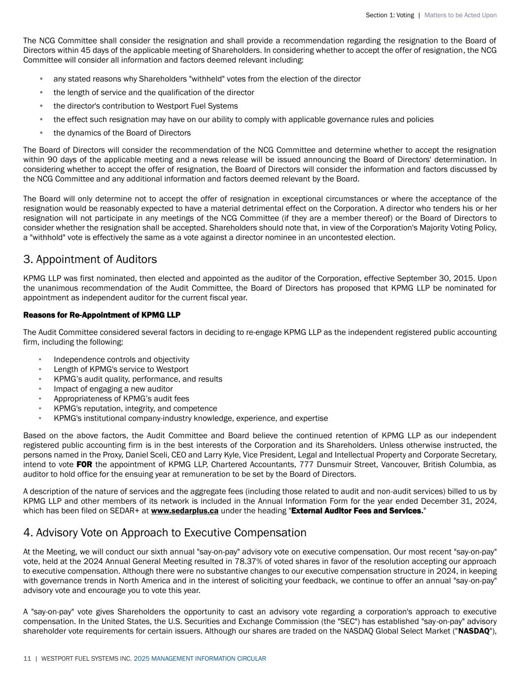Section 1: Voting | Matters to be Acted Upon 11 | WESTPORT FUEL SYSTEMS INC. 2025 MANAGEMENT INFORMATION CIRCULAR The NCG Committee shall consider the resignation and shall provide a recommendation regarding the resignation to the Board of Directors within 45 days of the applicable meeting of Shareholders. In considering whether to accept the offer of resignation, the NCG Committee will consider all information and factors deemed relevant including: • any stated reasons why Shareholders "withheld" votes from the election of the director • the length of service and the qualification of the director • the director's contribution to Westport Fuel Systems • the effect such resignation may have on our ability to comply with applicable governance rules and policies • the dynamics of the Board of Directors The Board of Directors will consider the recommendation of the NCG Committee and determine whether to accept the resignation within 90 days of the applicable meeting and a news release will be issued announcing the Board of Directors' determination. In considering whether to accept the offer of resignation, the Board of Directors will consider the information and factors discussed by the NCG Committee and any additional information and factors deemed relevant by the Board. The Board will only determine not to accept the offer of resignation in exceptional circumstances or where the acceptance of the resignation would be reasonably expected to have a material detrimental effect on the Corporation. A director who tenders his or her resignation will not participate in any meetings of the NCG Committee (if they are a member thereof) or the Board of Directors to consider whether the resignation shall be accepted. Shareholders should note that, in view of the Corporation's Majority Voting Policy, a "withhold" vote is effectively the same as a vote against a director nominee in an uncontested election. 3. Appointment of Auditors KPMG LLP was first nominated, then elected and appointed as the auditor of the Corporation, effective September 30, 2015. Upon the unanimous recommendation of the Audit Committee, the Board of Directors has proposed that KPMG LLP be nominated for appointment as independent auditor for the current fiscal year. Reasons for Re-Appointment of KPMG LLP The Audit Committee considered several factors in deciding to re-engage KPMG LLP as the independent registered public accounting firm, including the following: • Independence controls and objectivity • Length of KPMG's service to Westport • KPMG’s audit quality, performance, and results • Impact of engaging a new auditor • Appropriateness of KPMG’s audit fees • KPMG's reputation, integrity, and competence • KPMG's institutional company-industry knowledge, experience, and expertise Based on the above factors, the Audit Committee and Board believe the continued retention of KPMG LLP as our independent registered public accounting firm is in the best interests of the Corporation and its Shareholders. Unless otherwise instructed, the persons named in the Proxy, Daniel Sceli, CEO and Larry Kyle, Vice President, Legal and Intellectual Property and Corporate Secretary, intend to vote FOR the appointment of KPMG LLP, Chartered Accountants, 777 Dunsmuir Street, Vancouver, British Columbia, as auditor to hold office for the ensuing year at remuneration to be set by the Board of Directors. A description of the nature of services and the aggregate fees (including those related to audit and non-audit services) billed to us by KPMG LLP and other members of its network is included in the Annual Information Form for the year ended December 31, 2024, which has been filed on SEDAR+ at www.sedarplus.ca under the heading "External Auditor Fees and Services." 4. Advisory Vote on Approach to Executive Compensation At the Meeting, we will conduct our sixth annual "say-on-pay" advisory vote on executive compensation. Our most recent "say-on-pay" vote, held at the 2024 Annual General Meeting resulted in 78.37% of voted shares in favor of the resolution accepting our approach to executive compensation. Although there were no substantive changes to our executive compensation structure in 2024, in keeping with governance trends in North America and in the interest of soliciting your feedback, we continue to offer an annual "say-on-pay" advisory vote and encourage you to vote this year. A "say-on-pay" vote gives Shareholders the opportunity to cast an advisory vote regarding a corporation's approach to executive compensation. In the United States, the U.S. Securities and Exchange Commission (the "SEC") has established "say-on-pay" advisory shareholder vote requirements for certain issuers. Although our shares are traded on the NASDAQ Global Select Market ("NASDAQ"),