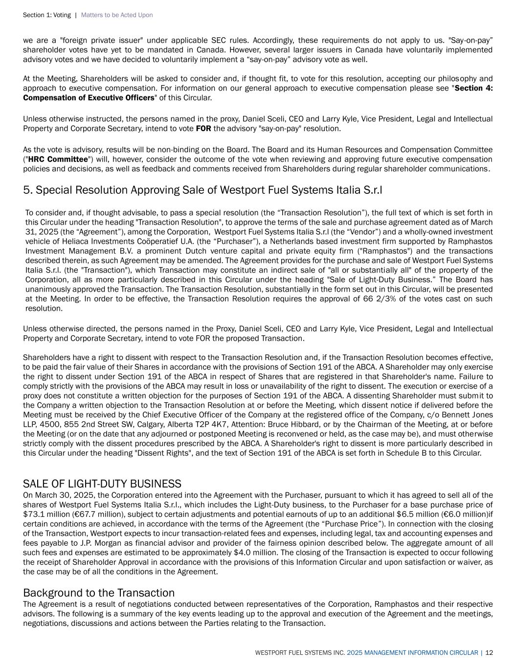 Section 1: Voting | Matters to be Acted Upon WESTPORT FUEL SYSTEMS INC. 2025 MANAGEMENT INFORMATION CIRCULAR | 12 we are a "foreign private issuer" under applicable SEC rules. Accordingly, these requirements do not apply to us. "Say-on-pay” shareholder votes have yet to be mandated in Canada. However, several larger issuers in Canada have voluntarily implemented advisory votes and we have decided to voluntarily implement a “say-on-pay” advisory vote as well. At the Meeting, Shareholders will be asked to consider and, if thought fit, to vote for this resolution, accepting our philosophy and approach to executive compensation. For information on our general approach to executive compensation please see "Section 4: Compensation of Executive Officers" of this Circular. Unless otherwise instructed, the persons named in the proxy, Daniel Sceli, CEO and Larry Kyle, Vice President, Legal and Intellectual Property and Corporate Secretary, intend to vote FOR the advisory "say-on-pay" resolution. As the vote is advisory, results will be non-binding on the Board. The Board and its Human Resources and Compensation Committee ("HRC Committee") will, however, consider the outcome of the vote when reviewing and approving future executive compensation policies and decisions, as well as feedback and comments received from Shareholders during regular shareholder communications. 5. Special Resolution Approving Sale of Westport Fuel Systems Italia S.r.l To consider and, if thought advisable, to pass a special resolution (the “Transaction Resolution”), the full text of which is set forth in this Circular under the heading "Transaction Resolution", to approve the terms of the sale and purchase agreement dated as of March 31, 2025 (the “Agreement”), among the Corporation, Westport Fuel Systems Italia S.r.l (the “Vendor”) and a wholly-owned investment vehicle of Heliaca Investments Coöperatief U.A. (the “Purchaser”), a Netherlands based investment firm supported by Ramphastos Investment Management B.V. a prominent Dutch venture capital and private equity firm ("Ramphastos") and the transactions described therein, as such Agreement may be amended. The Agreement provides for the purchase and sale of Westport Fuel Systems Italia S.r.l. (the "Transaction"), which Transaction may constitute an indirect sale of "all or substantially all" of the property of the Corporation, all as more particularly described in this Circular under the heading "Sale of Light-Duty Business.” The Board has unanimously approved the Transaction. The Transaction Resolution, substantially in the form set out in this Circular, will be presented at the Meeting. In order to be effective, the Transaction Resolution requires the approval of 66 2/3% of the votes cast on such resolution. Unless otherwise directed, the persons named in the Proxy, Daniel Sceli, CEO and Larry Kyle, Vice President, Legal and Intellectual Property and Corporate Secretary, intend to vote FOR the proposed Transaction. Shareholders have a right to dissent with respect to the Transaction Resolution and, if the Transaction Resolution becomes effective, to be paid the fair value of their Shares in accordance with the provisions of Section 191 of the ABCA. A Shareholder may only exercise the right to dissent under Section 191 of the ABCA in respect of Shares that are registered in that Shareholder's name. Failure to comply strictly with the provisions of the ABCA may result in loss or unavailability of the right to dissent. The execution or exercise of a proxy does not constitute a written objection for the purposes of Section 191 of the ABCA. A dissenting Shareholder must submit to the Company a written objection to the Transaction Resolution at or before the Meeting, which dissent notice if delivered before the Meeting must be received by the Chief Executive Officer of the Company at the registered office of the Company, c/o Bennett Jones LLP, 4500, 855 2nd Street SW, Calgary, Alberta T2P 4K7, Attention: Bruce Hibbard, or by the Chairman of the Meeting, at or before the Meeting (or on the date that any adjourned or postponed Meeting is reconvened or held, as the case may be), and must otherwise strictly comply with the dissent procedures prescribed by the ABCA. A Shareholder's right to dissent is more particularly described in this Circular under the heading "Dissent Rights", and the text of Section 191 of the ABCA is set forth in Schedule B to this Circular. SALE OF LIGHT-DUTY BUSINESS On March 30, 2025, the Corporation entered into the Agreement with the Purchaser, pursuant to which it has agreed to sell all of the shares of Westport Fuel Systems Italia S.r.l., which includes the Light-Duty business, to the Purchaser for a base purchase price of $73.1 million (€67.7 million), subject to certain adjustments and potential earnouts of up to an additional $6.5 million (€6.0 million)if certain conditions are achieved, in accordance with the terms of the Agreement (the “Purchase Price”). In connection with the closing of the Transaction, Westport expects to incur transaction-related fees and expenses, including legal, tax and accounting expenses and fees payable to J.P. Morgan as financial advisor and provider of the fairness opinion described below. The aggregate amount of all such fees and expenses are estimated to be approximately $4.0 million. The closing of the Transaction is expected to occur following the receipt of Shareholder Approval in accordance with the provisions of this Information Circular and upon satisfaction or waiver, as the case may be of all the conditions in the Agreement. Background to the Transaction The Agreement is a result of negotiations conducted between representatives of the Corporation, Ramphastos and their respective advisors. The following is a summary of the key events leading up to the approval and execution of the Agreement and the meetings, negotiations, discussions and actions between the Parties relating to 