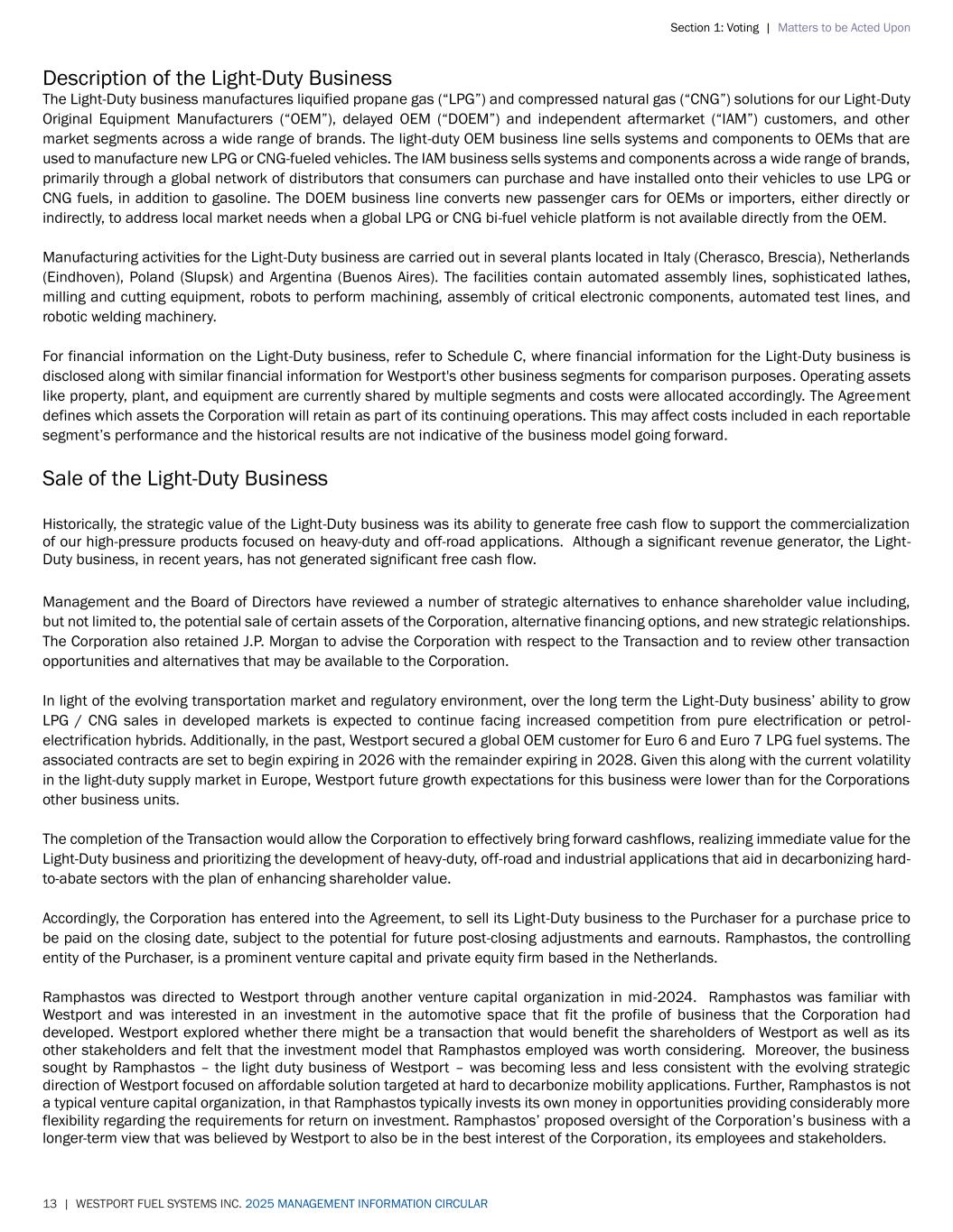 Section 1: Voting | Matters to be Acted Upon 13 | WESTPORT FUEL SYSTEMS INC. 2025 MANAGEMENT INFORMATION CIRCULAR Description of the Light-Duty Business The Light-Duty business manufactures liquified propane gas (“LPG”) and compressed natural gas (“CNG”) solutions for our Light-Duty Original Equipment Manufacturers (“OEM”), delayed OEM (“DOEM”) and independent aftermarket (“IAM”) customers, and other market segments across a wide range of brands. The light-duty OEM business line sells systems and components to OEMs that are used to manufacture new LPG or CNG-fueled vehicles. The IAM business sells systems and components across a wide range of brands, primarily through a global network of distributors that consumers can purchase and have installed onto their vehicles to use LPG or CNG fuels, in addition to gasoline. The DOEM business line converts new passenger cars for OEMs or importers, either directly or indirectly, to address local market needs when a global LPG or CNG bi-fuel vehicle platform is not available directly from the OEM. Manufacturing activities for the Light-Duty business are carried out in several plants located in Italy (Cherasco, Brescia), Netherlands (Eindhoven), Poland (Slupsk) and Argentina (Buenos Aires). The facilities contain automated assembly lines, sophisticated lathes, milling and cutting equipment, robots to perform machining, assembly of critical electronic components, automated test lines, and robotic welding machinery. For financial information on the Light-Duty business, refer to Schedule C, where financial information for the Light-Duty business is disclosed along with similar financial information for Westport's other business segments for comparison purposes. Operating assets like property, plant, and equipment are currently shared by multiple segments and costs were allocated accordingly. The Agreement defines which assets the Corporation will retain as part of its continuing operations. This may affect costs included in each reportable segment’s performance and the historical results are not indicative of the business model going forward. Sale of the Light-Duty Business Historically, the strategic value of the Light-Duty business was its ability to generate free cash flow to support the commercialization of our high-pressure products focused on heavy-duty and off-road applications. Although a significant revenue generator, the Light- Duty business, in recent years, has not generated significant free cash flow. Management and the Board of Directors have reviewed a number of strategic alternatives to enhance shareholder value including, but not limited to, the potential sale of certain assets of the Corporation, alternative financing options, and new strategic relationships. The Corporation also retained J.P. Morgan to advise the Corporation with respect to the Transaction and to review other transaction opportunities and alternatives that may be available to the Corporation. In light of the evolving transportation market and regulatory environment, over the long term the Light-Duty business’ ability to grow LPG / CNG sales in developed markets is expected to continue facing increased competition from pure electrification or petrol- electrification hybrids. Additionally, in the past, Westport secured a global OEM customer for Euro 6 and Euro 7 LPG fuel systems. The associated contracts are set to begin expiring in 2026 with the remainder expiring in 2028. Given this along with the current volatility in the light-duty supply market in Europe, Westport future growth expectations for this business were lower than for the Corporations other business units. The completion of the Transaction would allow the Corporation to effectively bring forward cashflows, realizing immediate value for the Light-Duty business and prioritizing the development of heavy-duty, off-road and industrial applications that aid in decarbonizing hard- to-abate sectors with the plan of enhancing shareholder value. Accordingly, the Corporation has entered into the Agreement, to sell its Light-Duty business to the Purchaser for a purchase price to be paid on the closing date, subject to the potential for future post-closing adjustments and earnouts. Ramphastos, the controlling entity of the Purchaser, is a prominent venture capital and private equity firm based in the Netherlands. Ramphastos was directed to Westport through another venture capital organization in mid-2024. Ramphastos was familiar with Westport and was interested in an investment in the automotive space that fit the profile of business that the Corporation had developed. Westport explored whether there might be a transaction that would benefit the shareholders of Westport as well as its other stakeholders and felt that the investment model that Ramphastos employed was worth considering. Moreover, the business sought by Ramphastos – the light duty business of Westport – was becoming less and less consistent with the evolving strategic direction of Westport focused on affordable solution targeted at hard to decarbonize mobility applications. Further, Ramphastos is not a typical venture capital organization, in that Ramphastos typically invests its own money in opportunities providing considerably more flexibility regarding the requirements for return on investment. Ramphastos’ proposed oversight of the Corporation’s business with a longer-term view that was believed by Westport to also be in the best interest of the Corporation, its employees and stakeholders.