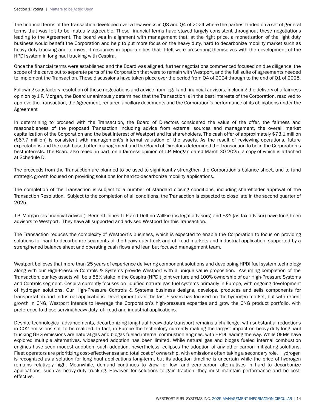Section 1: Voting | Matters to be Acted Upon WESTPORT FUEL SYSTEMS INC. 2025 MANAGEMENT INFORMATION CIRCULAR | 14 The financial terms of the Transaction developed over a few weeks in Q3 and Q4 of 2024 where the parties landed on a set of general terms that was felt to be mutually agreeable. These financial terms have stayed largely consistent throughout these negotiations leading to the Agreement. The board was in alignment with management that, at the right price, a monetization of the light duty business would benefit the Corporation and help to put more focus on the heavy duty, hard to decarbonize mobility market such as heavy duty trucking and to invest it resources in opportunities that it felt were presenting themselves with the development of the HPDI system in long haul trucking with Cespira. Once the financial terms were established and the Board was aligned, further negotiations commenced focused on due diligence, the scope of the carve out to separate parts of the Corporation that were to remain with Westport, and the full suite of agreements needed to implement the Transaction. These discussions have taken place over the period from Q4 of 2024 through to the end of Q1 of 2025. Following satisfactory resolution of these negotiations and advice from legal and financial advisors, including the delivery of a fairness opinion by J.P. Morgan, the Board unanimously determined that the Transaction is in the best interests of the Corporation, resolved to approve the Transaction, the Agreement, required ancillary documents and the Corporation’s performance of its obligations under the Agreement In determining to proceed with the Transaction, the Board of Directors considered the value of the offer, the fairness and reasonableness of the proposed Transaction including advice from external sources and management, the overall market capitalization of the Corporation and the best interest of Westport and its shareholders. The cash offer of approximately $73.1 million (€67.7 million) is consistent with management’s internal valuation of the assets. As the result of reviewing operations, future expectations and the cash-based offer, management and the Board of Directors determined the Transaction to be in the Corporation’s best interests. The Board also relied, in part, on a fairness opinion of J.P. Morgan dated March 30 2025, a copy of which is attached at Schedule D. The proceeds from the Transaction are planned to be used to significantly strengthen the Corporation’s balance sheet, and to fund strategic growth focused on providing solutions for hard-to-decarbonize mobility applications. The completion of the Transaction is subject to a number of standard closing conditions, including shareholder approval of the Transaction Resolution. Subject to the completion of all conditions, the Transaction is expected to close late in the second quarter of 2025. J.P. Morgan (as financial advisor), Bennett Jones LLP and Delfino Willkie (as legal advisors) and E&Y (as tax advisor) have long been advisors to Westport. They have all supported and advised Westport for this Transaction. The Transaction reduces the complexity of Westport’s business, which is expected to enable the Corporation to focus on providing solutions for hard to decarbonize segments of the heavy-duty truck and off-road markets and industrial application, supported by a strengthened balance sheet and operating cash flows and lean but focused management team. Westport believes that more than 25 years of experience delivering component solutions and developing HPDI fuel system technology along with our High-Pressure Controls & Systems provide Westport with a unique value proposition. Assuming completion of the Transaction, our key assets will be a 55% stake in the Cespira (HPDI) joint venture and 100% ownership of our High-Pressure Systems and Controls segment. Cespira currently focuses on liquified natural gas fuel systems primarily in Europe, with ongoing development of hydrogen solutions. Our High-Pressure Controls & Systems business designs, develops, produces and sells components for transportation and industrial applications. Development over the last 5 years has focused on the hydrogen market, but with recent growth in CNG, Westport intends to leverage the Corporation’s high-pressure expertise and grow the CNG product portfolio, with preference to those serving heavy duty, off-road and industrial applications. Despite technological advancements, decarbonizing long-haul heavy-duty transport remains a challenge, with substantial reductions in CO2 emissions still to be realized. In fact, in Europe the technology currently making the largest impact on heavy-duty long-haul trucking GHG emissions are natural gas and biogas fueled internal combustion engines, with HPDI leading the way. While OEMs have explored multiple alternatives, widespread adoption has been limited. While natural gas and biogas fueled internal combustion engines have seen modest adoption, such adoption, nevertheless, eclipses the adoption of any other carbon mitigating solutions. Fleet operators are prioritizing cost-effectiveness and total cost of ownership, with emissions often taking a secondary role. Hydrogen is recognized as a solution for long haul applications long-term, but its adoption timeline is uncertain while the price of hydrogen remains relatively high. Meanwhile, demand continues to grow for low- and zero-carbon alternatives in hard to decarbonize applications, such as heavy-duty trucking. However, for solutions to gain traction, they must maintain performance and be cost- effective.