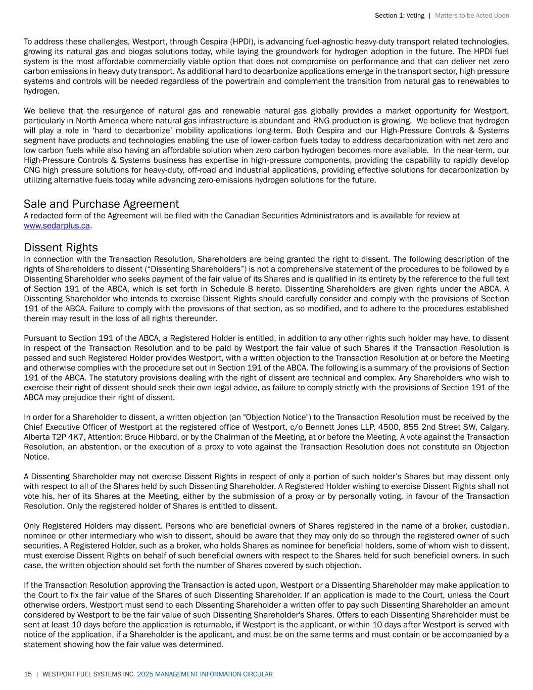 Section 1: Voting | Matters to be Acted Upon 15 | WESTPORT FUEL SYSTEMS INC. 2025 MANAGEMENT INFORMATION CIRCULAR To address these challenges, Westport, through Cespira (HPDI), is advancing fuel-agnostic heavy-duty transport related technologies, growing its natural gas and biogas solutions today, while laying the groundwork for hydrogen adoption in the future. The HPDI fuel system is the most affordable commercially viable option that does not compromise on performance and that can deliver net zero carbon emissions in heavy duty transport. As additional hard to decarbonize applications emerge in the transport sector, high pressure systems and controls will be needed regardless of the powertrain and complement the transition from natural gas to renewables to hydrogen. We believe that the resurgence of natural gas and renewable natural gas globally provides a market opportunity for Westport, particularly in North America where natural gas infrastructure is abundant and RNG production is growing. We believe that hydrogen will play a role in ‘hard to decarbonize’ mobility applications long-term. Both Cespira and our High-Pressure Controls & Systems segment have products and technologies enabling the use of lower-carbon fuels today to address decarbonization with net zero and low carbon fuels while also having an affordable solution when zero carbon hydrogen becomes more available. In the near-term, our High-Pressure Controls & Systems business has expertise in high-pressure components, providing the capability to rapidly develop CNG high pressure solutions for heavy-duty, off-road and industrial applications, providing effective solutions for decarbonization by utilizing alternative fuels today while advancing zero-emissions hydrogen solutions for the future. Sale and Purchase Agreement A redacted form of the Agreement will be filed with the Canadian Securities Administrators and is available for review at www.sedarplus.ca. Dissent Rights In connection with the Transaction Resolution, Shareholders are being granted the right to dissent. The following description of the rights of Shareholders to dissent (“Dissenting Shareholders”) is not a comprehensive statement of the procedures to be followed by a Dissenting Shareholder who seeks payment of the fair value of its Shares and is qualified in its entirety by the reference to the full text of Section 191 of the ABCA, which is set forth in Schedule B hereto. Dissenting Shareholders are given rights under the ABCA. A Dissenting Shareholder who intends to exercise Dissent Rights should carefully consider and comply with the provisions of Section 191 of the ABCA. Failure to comply with the provisions of that section, as so modified, and to adhere to the procedures established therein may result in the loss of all rights thereunder. Pursuant to Section 191 of the ABCA, a Registered Holder is entitled, in addition to any other rights such holder may have, to dissent in respect of the Transaction Resolution and to be paid by Westport the fair value of such Shares if the Transaction Resolution is passed and such Registered Holder provides Westport, with a written objection to the Transaction Resolution at or before the Meeting and otherwise complies with the procedure set out in Section 191 of the ABCA. The following is a summary of the provisions of Section 191 of the ABCA. The statutory provisions dealing with the right of dissent are technical and complex. Any Shareholders who wish to exercise their right of dissent should seek their own legal advice, as failure to comply strictly with the provisions of Section 191 of the ABCA may prejudice their right of dissent. In order for a Shareholder to dissent, a written objection (an "Objection Notice") to the Transaction Resolution must be received by the Chief Executive Officer of Westport at the registered office of Westport, c/o Bennett Jones LLP, 4500, 855 2nd Street SW, Calgary, Alberta T2P 4K7, Attention: Bruce Hibbard, or by the Chairman of the Meeting, at or before the Meeting. A vote against the Transaction Resolution, an abstention, or the execution of a proxy to vote against the Transaction Resolution does not constitute an Objection Notice. A Dissenting Shareholder may not exercise Dissent Rights in respect of only a portion of such holder’s Shares but may dissent only with respect to all of the Shares held by such Dissenting Shareholder. A Registered Holder wishing to exercise Dissent Rights shall not vote his, her of its Shares at the Meeting, either by the submission of a proxy or by personally voting, in favour of the Transaction Resolution. Only the registered holder of Shares is entitled to dissent. Only Registered Holders may dissent. Persons who are beneficial owners of Shares registered in the name of a broker, custodian, nominee or other intermediary who wish to dissent, should be aware that they may only do so through the registered owner of such securities. A Registered Holder, such as a broker, who holds Shares as nominee for beneficial holders, some of whom wish to dissent, must exercise Dissent Rights on behalf of such beneficial owners with respect to the Shares held for such beneficial owners. In such case, the written objection should set forth the number of Shares covered by such objection. If the Transaction Resolution approving the Transaction is acted upon, Westport or a Dissenting Shareholder may make application to the Court to fix the fair value of the Shares of such Dissenting Shareholder. If an application is made to the Court, unless the Court otherwise orders, Westport must send to each Dissenting Shareholder a written offer to pay such Dissenting Shareholder an amount considered by Westport to be the fair value of such Dissenting Shareholder's Shares. Offers to each Dissenting Shareholder must be sent at least 10 days before the application is returnable, if Westport is the applicant, or within 10 days after Westport is served with notice of the applicat