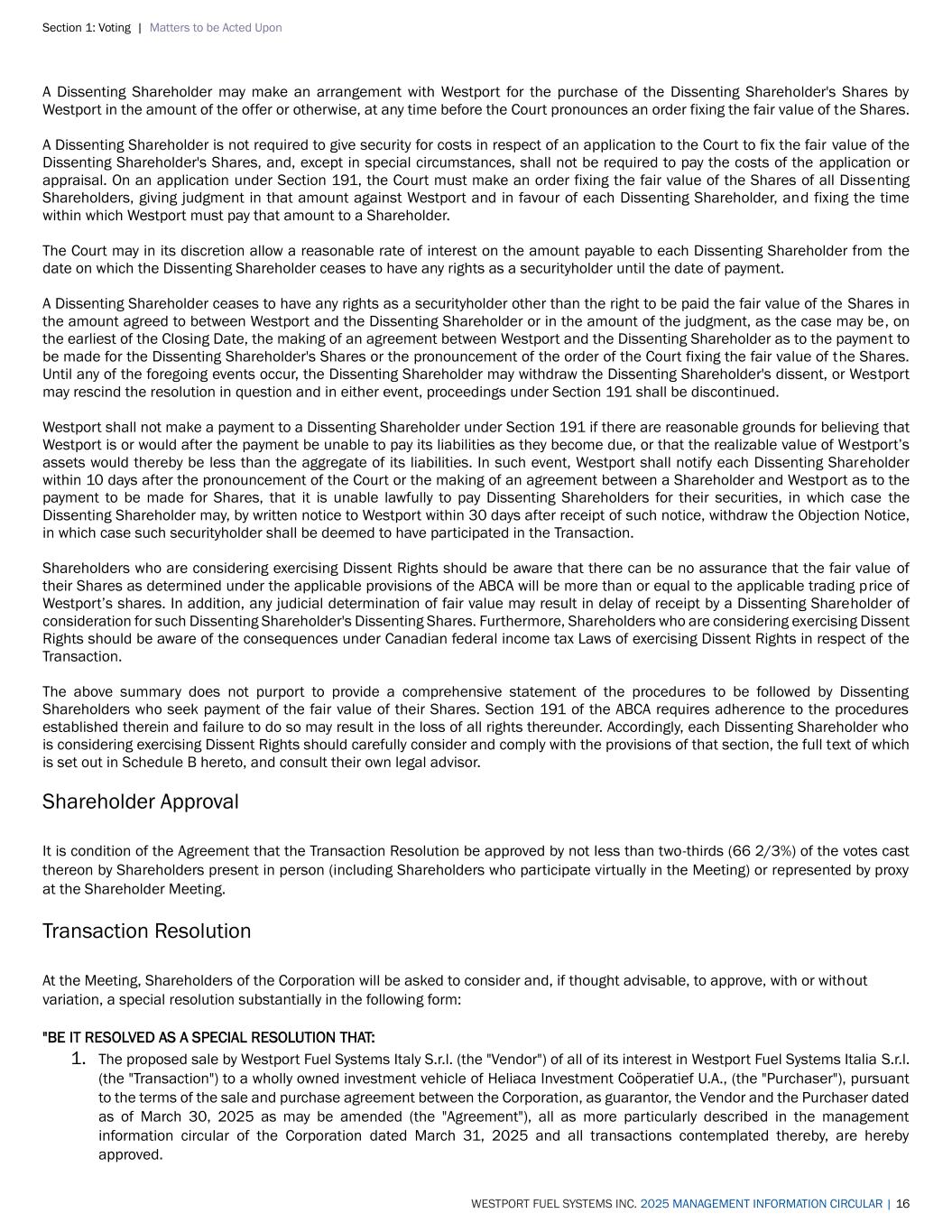 Section 1: Voting | Matters to be Acted Upon WESTPORT FUEL SYSTEMS INC. 2025 MANAGEMENT INFORMATION CIRCULAR | 16 A Dissenting Shareholder may make an arrangement with Westport for the purchase of the Dissenting Shareholder's Shares by Westport in the amount of the offer or otherwise, at any time before the Court pronounces an order fixing the fair value of the Shares. A Dissenting Shareholder is not required to give security for costs in respect of an application to the Court to fix the fair value of the Dissenting Shareholder's Shares, and, except in special circumstances, shall not be required to pay the costs of the application or appraisal. On an application under Section 191, the Court must make an order fixing the fair value of the Shares of all Dissenting Shareholders, giving judgment in that amount against Westport and in favour of each Dissenting Shareholder, and fixing the time within which Westport must pay that amount to a Shareholder. The Court may in its discretion allow a reasonable rate of interest on the amount payable to each Dissenting Shareholder from the date on which the Dissenting Shareholder ceases to have any rights as a securityholder until the date of payment. A Dissenting Shareholder ceases to have any rights as a securityholder other than the right to be paid the fair value of the Shares in the amount agreed to between Westport and the Dissenting Shareholder or in the amount of the judgment, as the case may be, on the earliest of the Closing Date, the making of an agreement between Westport and the Dissenting Shareholder as to the payment to be made for the Dissenting Shareholder's Shares or the pronouncement of the order of the Court fixing the fair value of the Shares. Until any of the foregoing events occur, the Dissenting Shareholder may withdraw the Dissenting Shareholder's dissent, or Westport may rescind the resolution in question and in either event, proceedings under Section 191 shall be discontinued. Westport shall not make a payment to a Dissenting Shareholder under Section 191 if there are reasonable grounds for believing that Westport is or would after the payment be unable to pay its liabilities as they become due, or that the realizable value of Westport’s assets would thereby be less than the aggregate of its liabilities. In such event, Westport shall notify each Dissenting Shareholder within 10 days after the pronouncement of the Court or the making of an agreement between a Shareholder and Westport as to the payment to be made for Shares, that it is unable lawfully to pay Dissenting Shareholders for their securities, in which case the Dissenting Shareholder may, by written notice to Westport within 30 days after receipt of such notice, withdraw the Objection Notice, in which case such securityholder shall be deemed to have participated in the Transaction. Shareholders who are considering exercising Dissent Rights should be aware that there can be no assurance that the fair value of their Shares as determined under the applicable provisions of the ABCA will be more than or equal to the applicable trading price of Westport’s shares. In addition, any judicial determination of fair value may result in delay of receipt by a Dissenting Shareholder of consideration for such Dissenting Shareholder's Dissenting Shares. Furthermore, Shareholders who are considering exercising Dissent Rights should be aware of the consequences under Canadian federal income tax Laws of exercising Dissent Rights in respect of the Transaction. The above summary does not purport to provide a comprehensive statement of the procedures to be followed by Dissenting Shareholders who seek payment of the fair value of their Shares. Section 191 of the ABCA requires adherence to the procedures established therein and failure to do so may result in the loss of all rights thereunder. Accordingly, each Dissenting Shareholder who is considering exercising Dissent Rights should carefully consider and comply with the provisions of that section, the full text of which is set out in Schedule B hereto, and consult their own legal advisor. Shareholder Approval It is condition of the Agreement that the Transaction Resolution be approved by not less than two-thirds (66 2/3%) of the votes cast thereon by Shareholders present in person (including Shareholders who participate virtually in the Meeting) or represented by proxy at the Shareholder Meeting. Transaction Resolution At the Meeting, Shareholders of the Corporation will be asked to consider and, if thought advisable, to approve, with or without variation, a special resolution substantially in the following form: "BE IT RESOLVED AS A SPECIAL RESOLUTION THAT: 1. The proposed sale by Westport Fuel Systems Italy S.r.l. (the "Vendor") of all of its interest in Westport Fuel Systems Italia S.r.l. (the "Transaction") to a wholly owned investment vehicle of Heliaca Investment Coöperatief U.A., (the "Purchaser"), pursuant to the terms of the sale and purchase agreement between the Corporation, as guarantor, the Vendor and the Purchaser dated as of March 30, 2025 as may be amended (the "Agreement"), all as more particularly described in the management information circular of the Corporation dated March 31, 2025 and all transactions contemplated thereby, are hereby approved.