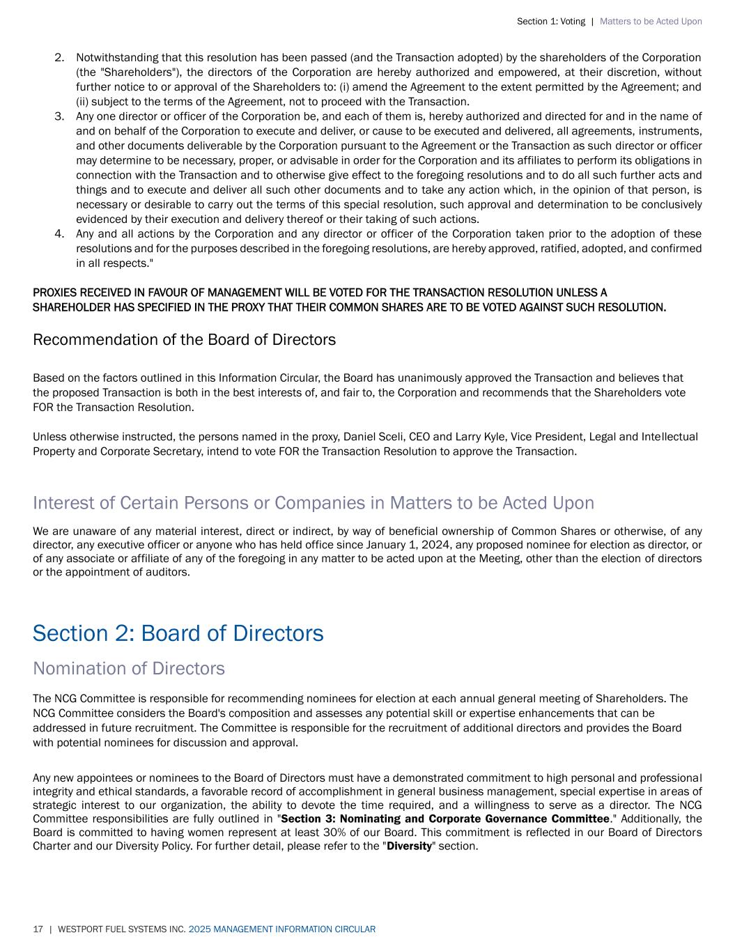 Section 1: Voting | Matters to be Acted Upon 17 | WESTPORT FUEL SYSTEMS INC. 2025 MANAGEMENT INFORMATION CIRCULAR 2. Notwithstanding that this resolution has been passed (and the Transaction adopted) by the shareholders of the Corporation (the "Shareholders"), the directors of the Corporation are hereby authorized and empowered, at their discretion, without further notice to or approval of the Shareholders to: (i) amend the Agreement to the extent permitted by the Agreement; and (ii) subject to the terms of the Agreement, not to proceed with the Transaction. 3. Any one director or officer of the Corporation be, and each of them is, hereby authorized and directed for and in the name of and on behalf of the Corporation to execute and deliver, or cause to be executed and delivered, all agreements, instruments, and other documents deliverable by the Corporation pursuant to the Agreement or the Transaction as such director or officer may determine to be necessary, proper, or advisable in order for the Corporation and its affiliates to perform its obligations in connection with the Transaction and to otherwise give effect to the foregoing resolutions and to do all such further acts and things and to execute and deliver all such other documents and to take any action which, in the opinion of that person, is necessary or desirable to carry out the terms of this special resolution, such approval and determination to be conclusively evidenced by their execution and delivery thereof or their taking of such actions. 4. Any and all actions by the Corporation and any director or officer of the Corporation taken prior to the adoption of these resolutions and for the purposes described in the foregoing resolutions, are hereby approved, ratified, adopted, and confirmed in all respects." PROXIES RECEIVED IN FAVOUR OF MANAGEMENT WILL BE VOTED FOR THE TRANSACTION RESOLUTION UNLESS A SHAREHOLDER HAS SPECIFIED IN THE PROXY THAT THEIR COMMON SHARES ARE TO BE VOTED AGAINST SUCH RESOLUTION. Recommendation of the Board of Directors Based on the factors outlined in this Information Circular, the Board has unanimously approved the Transaction and believes that the proposed Transaction is both in the best interests of, and fair to, the Corporation and recommends that the Shareholders vote FOR the Transaction Resolution. Unless otherwise instructed, the persons named in the proxy, Daniel Sceli, CEO and Larry Kyle, Vice President, Legal and Intellectual Property and Corporate Secretary, intend to vote FOR the Transaction Resolution to approve the Transaction. Interest of Certain Persons or Companies in Matters to be Acted Upon We are unaware of any material interest, direct or indirect, by way of beneficial ownership of Common Shares or otherwise, of any director, any executive officer or anyone who has held office since January 1, 2024, any proposed nominee for election as director, or of any associate or affiliate of any of the foregoing in any matter to be acted upon at the Meeting, other than the election of directors or the appointment of auditors. Section 2: Board of Directors Nomination of Directors The NCG Committee is responsible for recommending nominees for election at each annual general meeting of Shareholders. The NCG Committee considers the Board's composition and assesses any potential skill or expertise enhancements that can be addressed in future recruitment. The Committee is responsible for the recruitment of additional directors and provides the Board with potential nominees for discussion and approval. Any new appointees or nominees to the Board of Directors must have a demonstrated commitment to high personal and professional integrity and ethical standards, a favorable record of accomplishment in general business management, special expertise in areas of strategic interest to our organization, the ability to devote the time required, and a willingness to serve as a director. The NCG Committee responsibilities are fully outlined in "Section 3: Nominating and Corporate Governance Committee." Additionally, the Board is committed to having women represent at least 30% of our Board. This commitment is reflected in our Board of Directors Charter and our Diversity Policy. For further detail, please refer to the "Diversity" section.